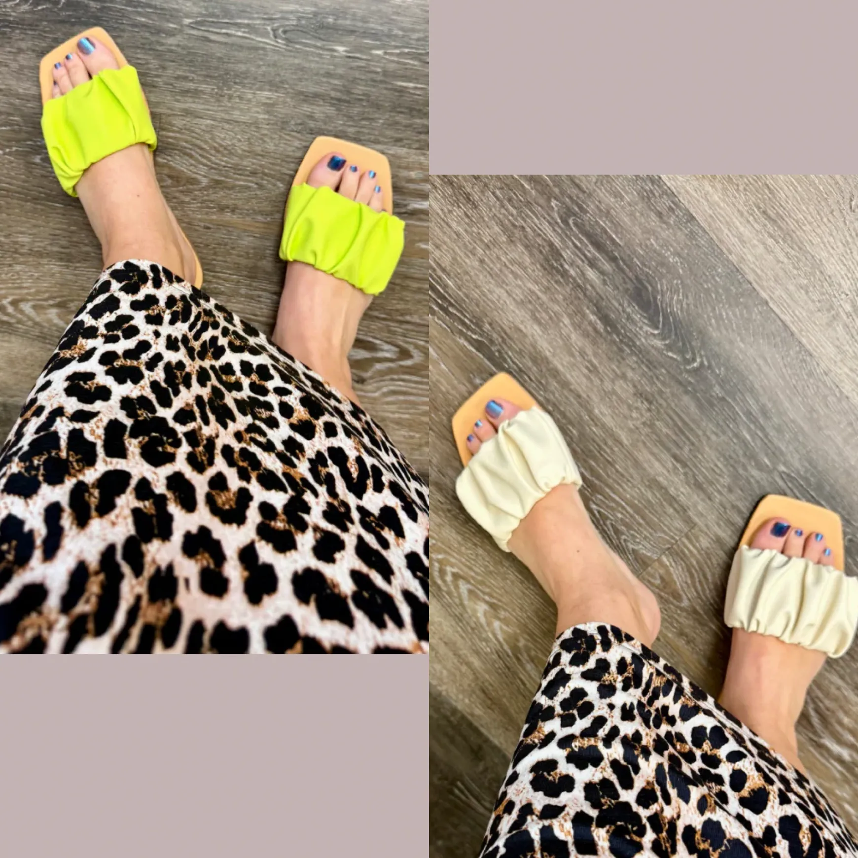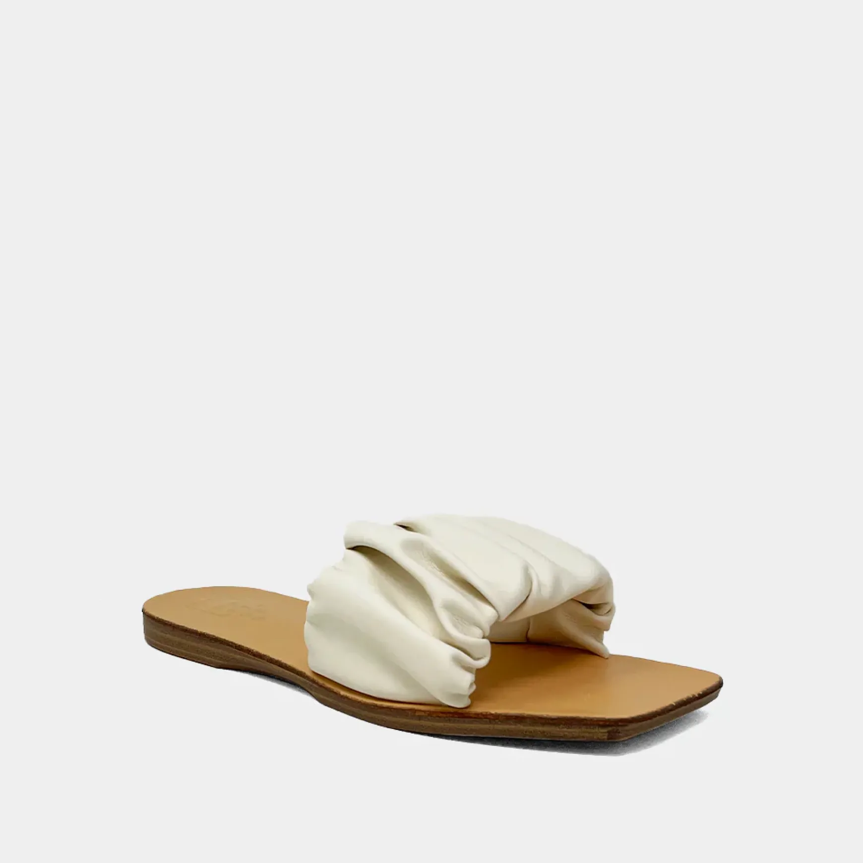 Our stylish BELINDA sandals are made of high-quality faux leather, with elegant ruched straps that wrap around your feet for a snug fit. The modern squared-toe finish adds versatility and fashion to your look. The BELINDA slip-on sandals are comfortable and durable, perfect for any summer occasion.
