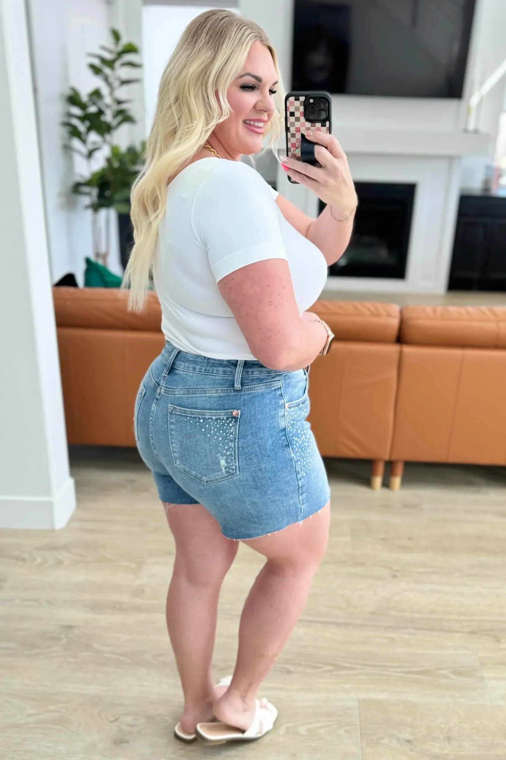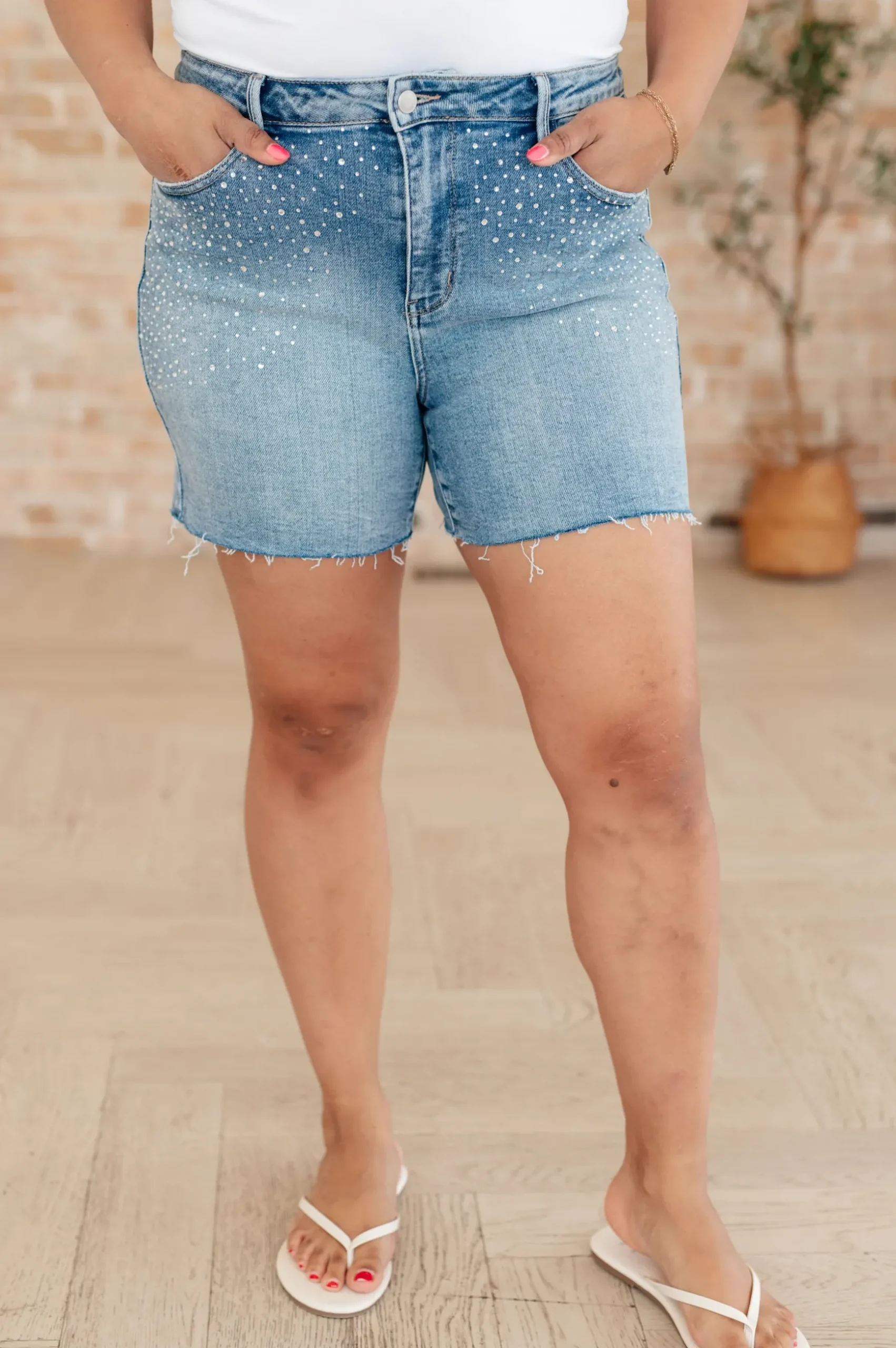 Elevate your style with our Elle High Rise Rhinestone Cutoff Shorts. The high rise design flatters your figure, while the rhinestone embellishment adds a touch of sparkle. The raw cutoff hem and medium wash give them a trendy, edgy vibe. Step out in confidence with these statement shorts.