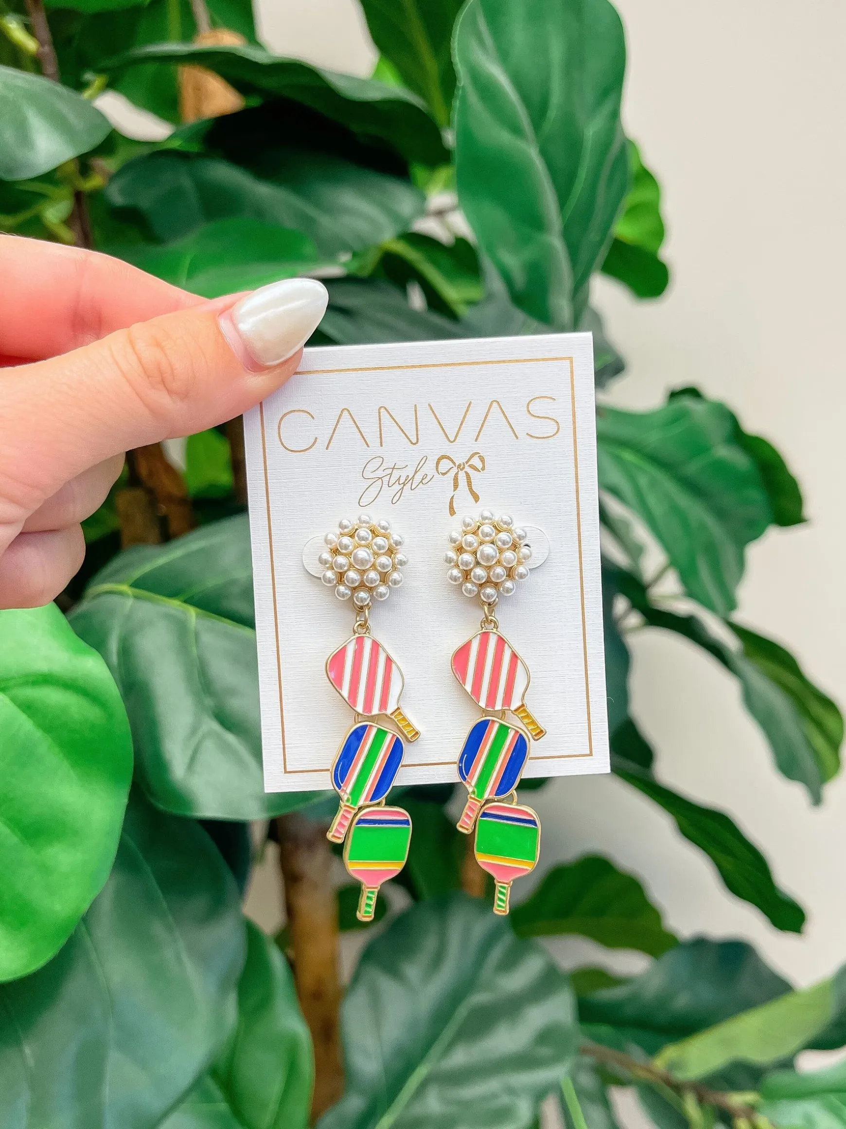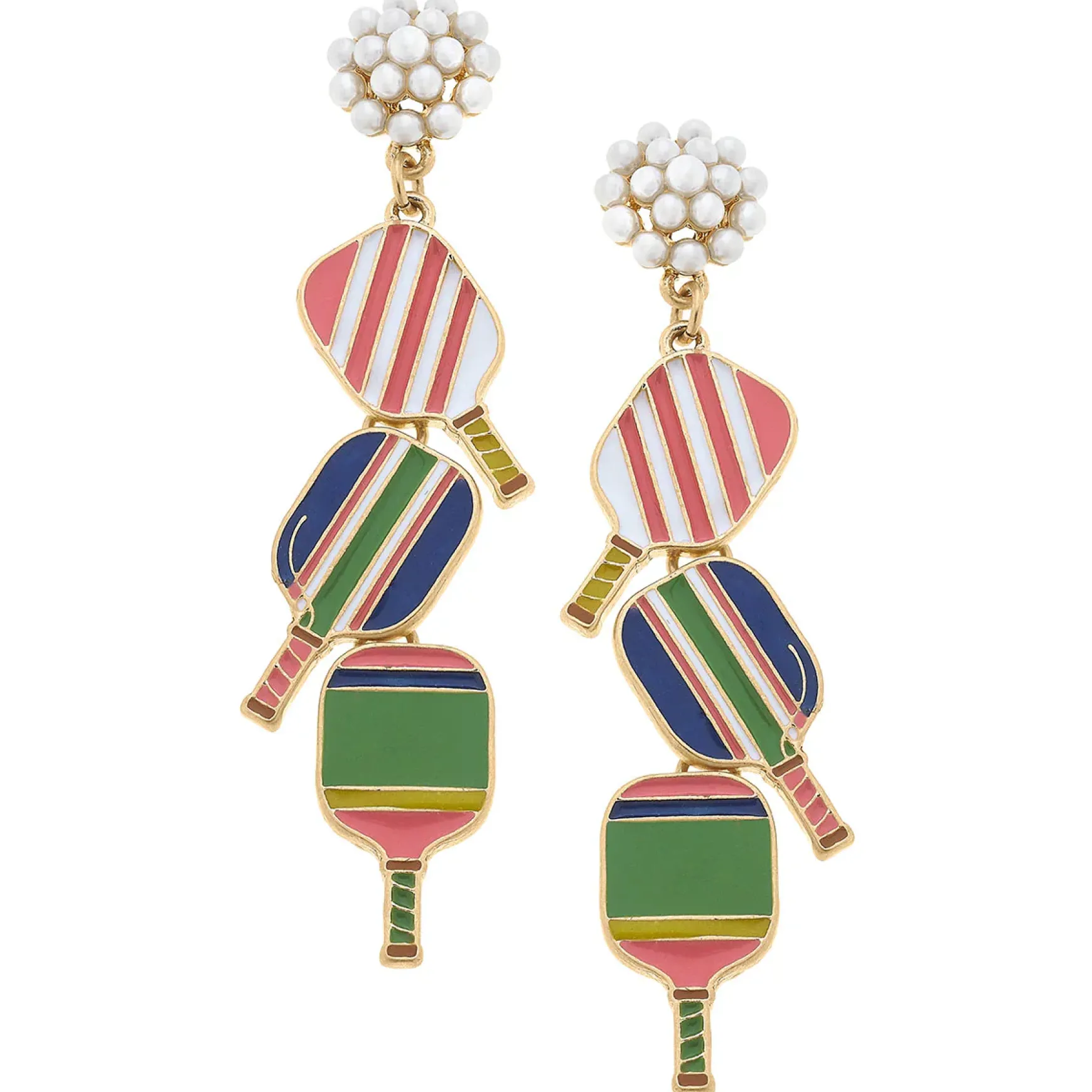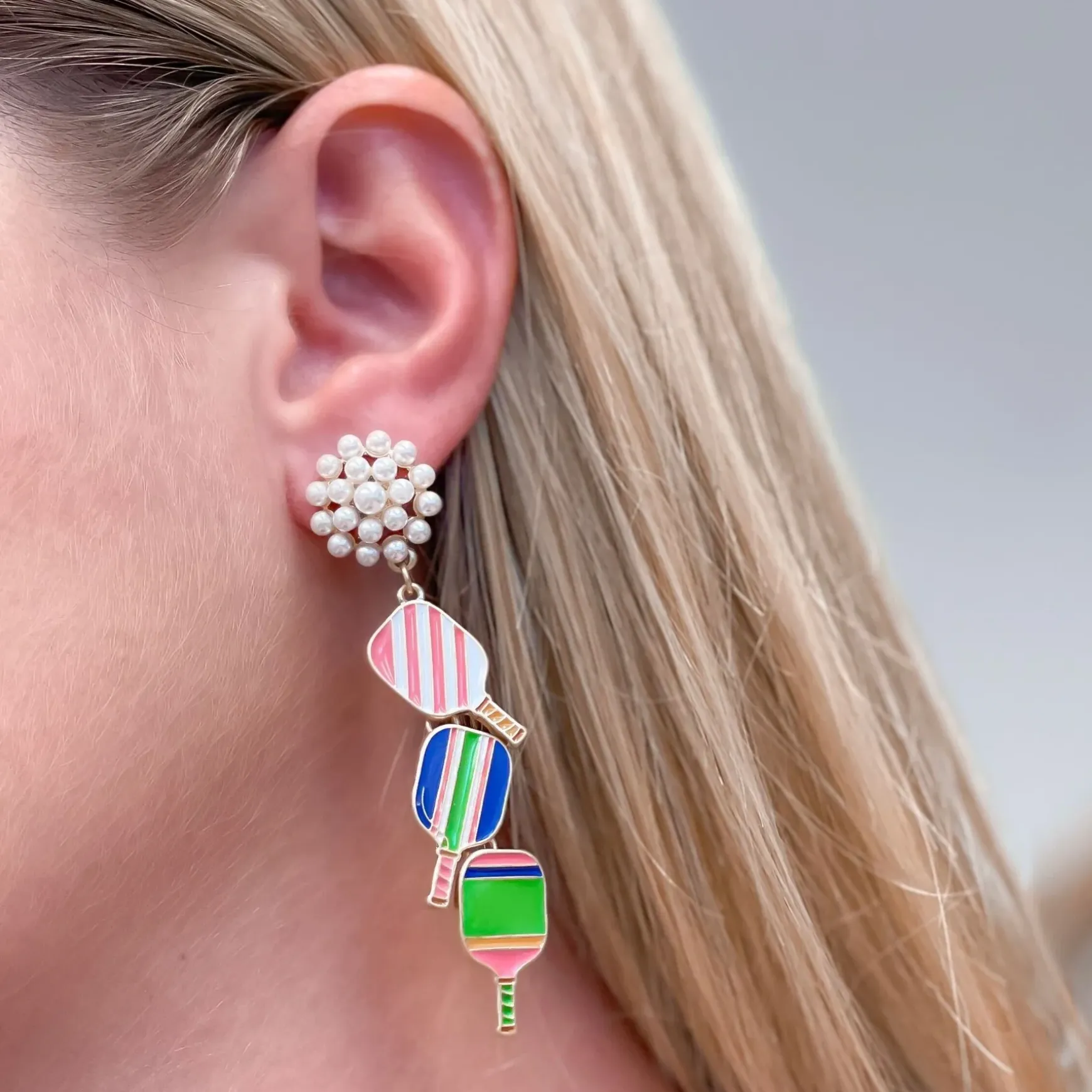 Serve up a little style with our Ellie Pickleball Triple Linked Pearl Cluster Drop Earrings! Get ready for game time in these vibrant multi-colored earrings that feature fun and feminine designed paddles to show off your love for the sport.