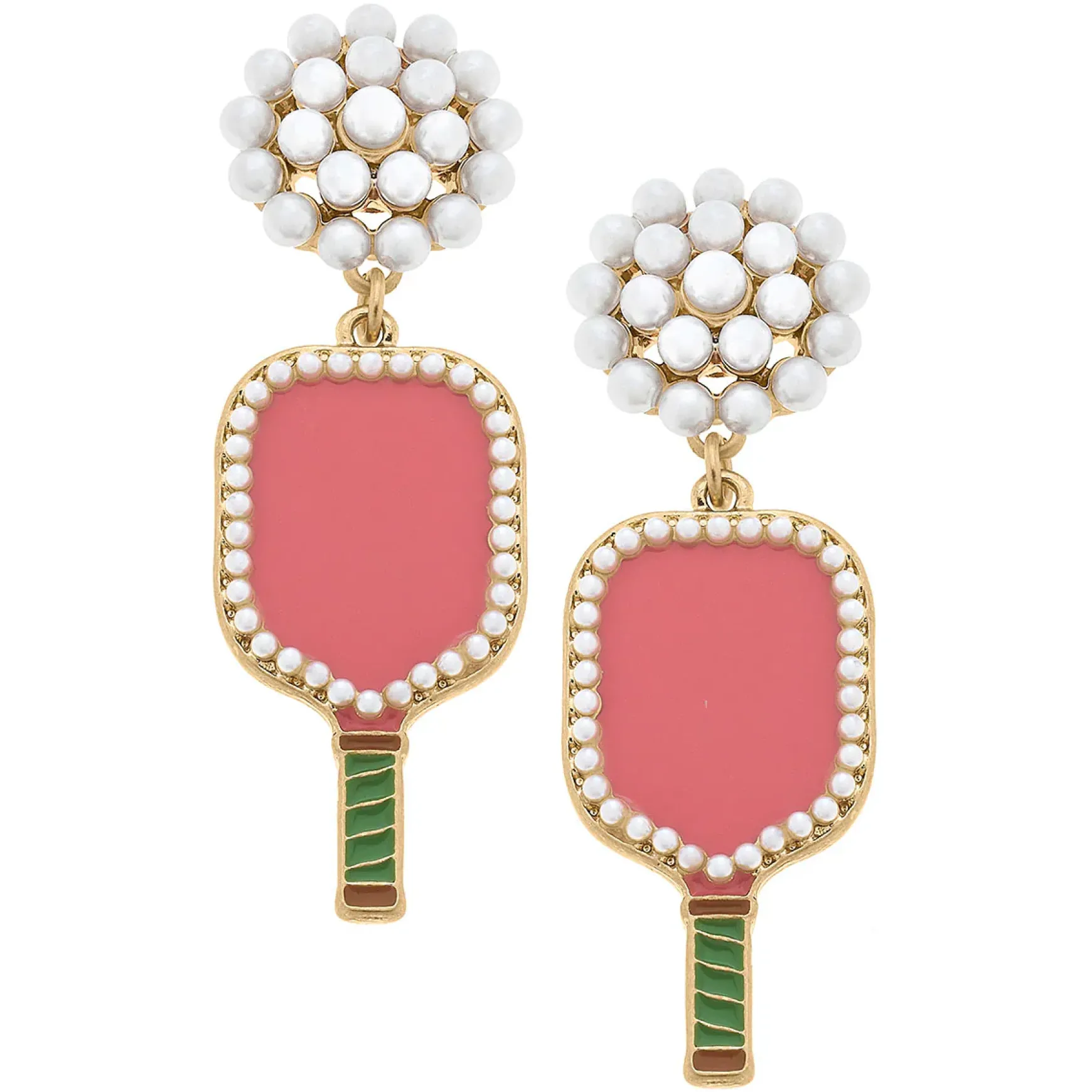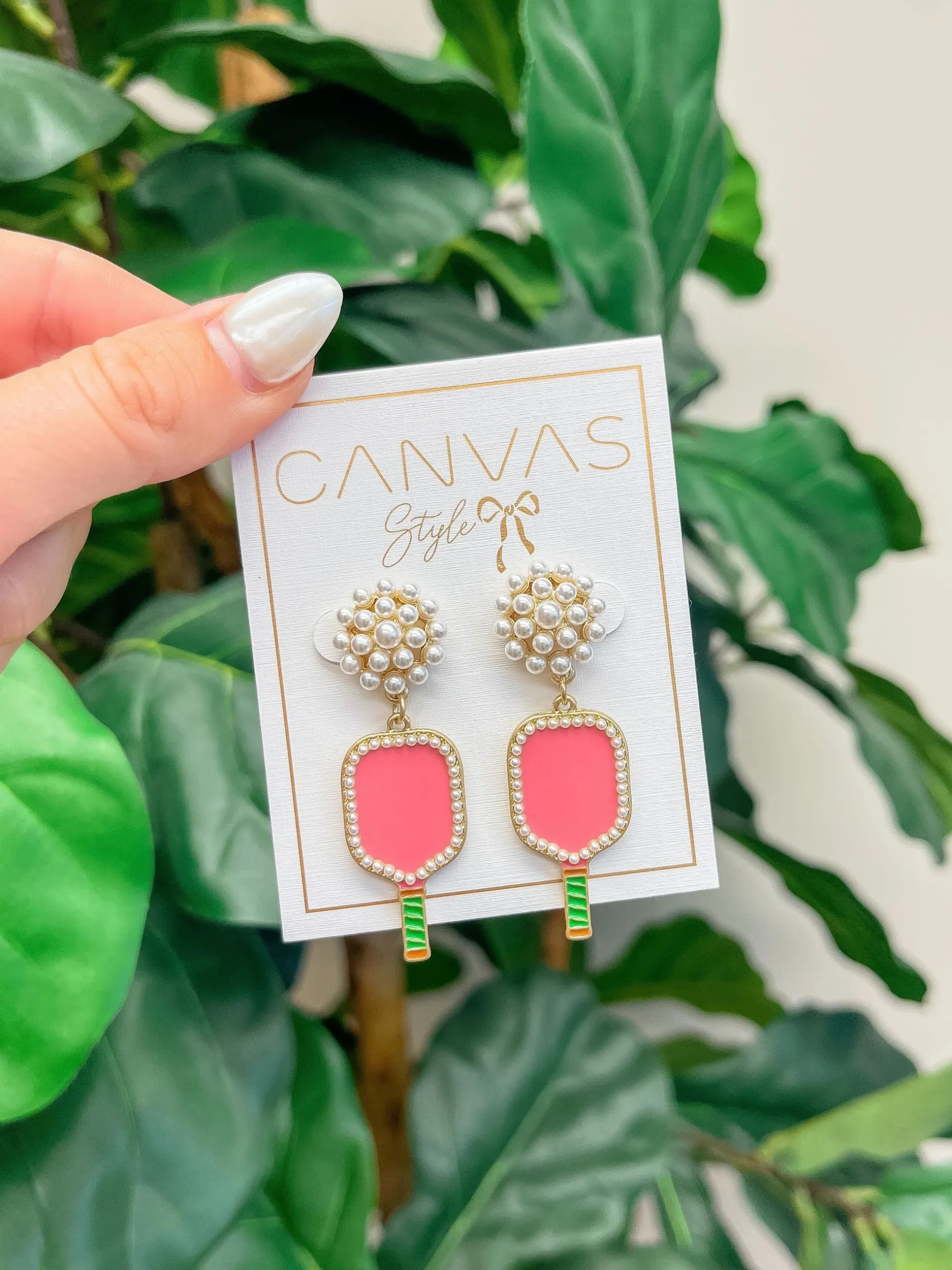 Serve an ace in style with our Ellie Pickleball Pearl Cluster Drop Earrings! These feminine earrings have a playful statement, featuring a pickleball paddle in vibrant colors. Play the game while looking sporty and chic with these game-time earrings!
