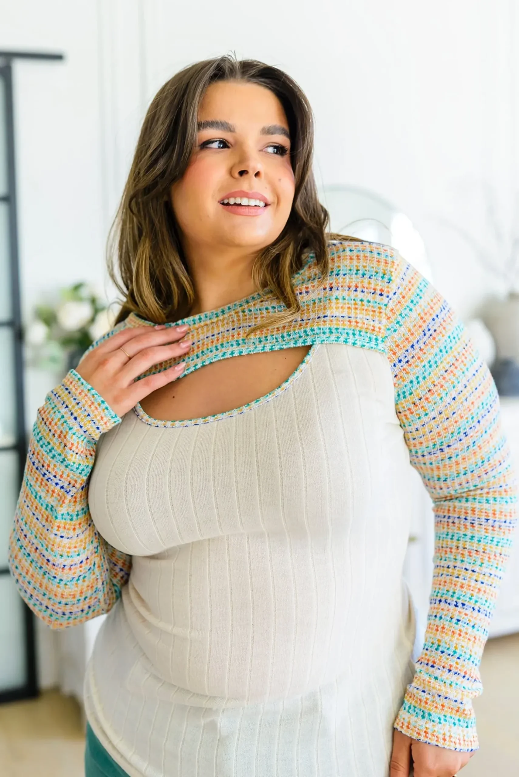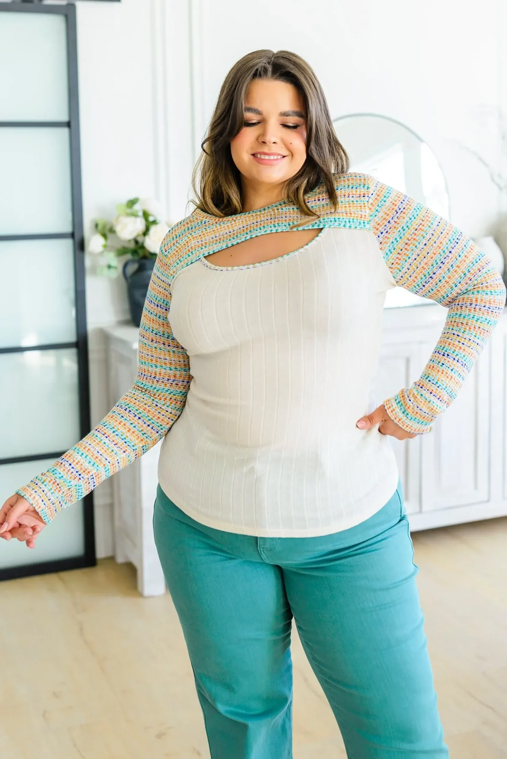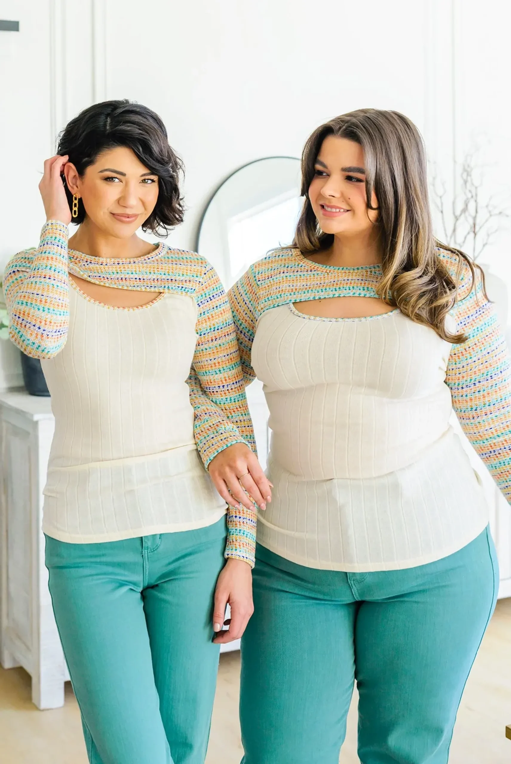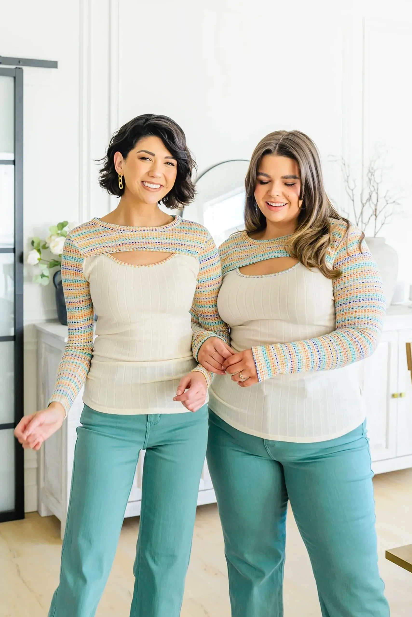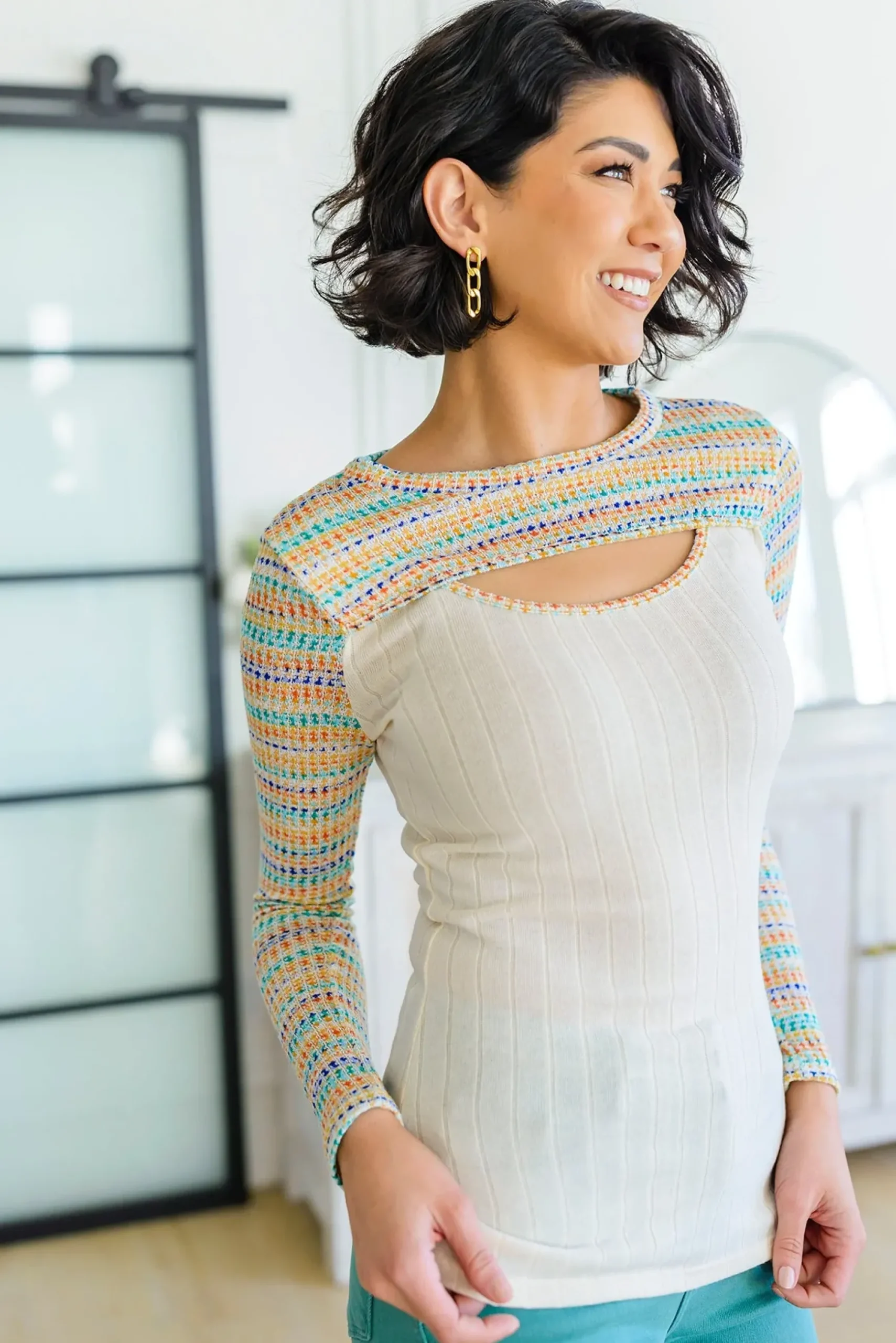 See what you’re missing out on with the Evidently Extra Peekaboo Cut Out Top. Its layered tank-underneath-top design reveals a playful peekaboo, while multi-color stripes and textured knit add a pop of pizzazz. Make a style statement while staying cool and comfortable in this must-have top!