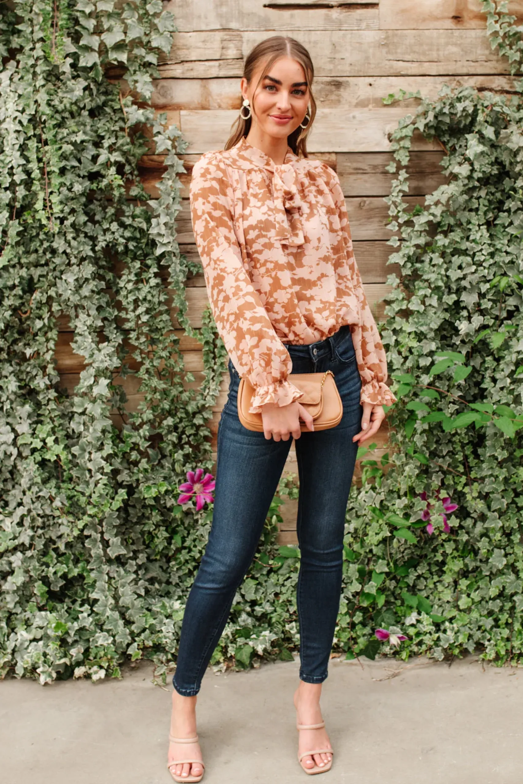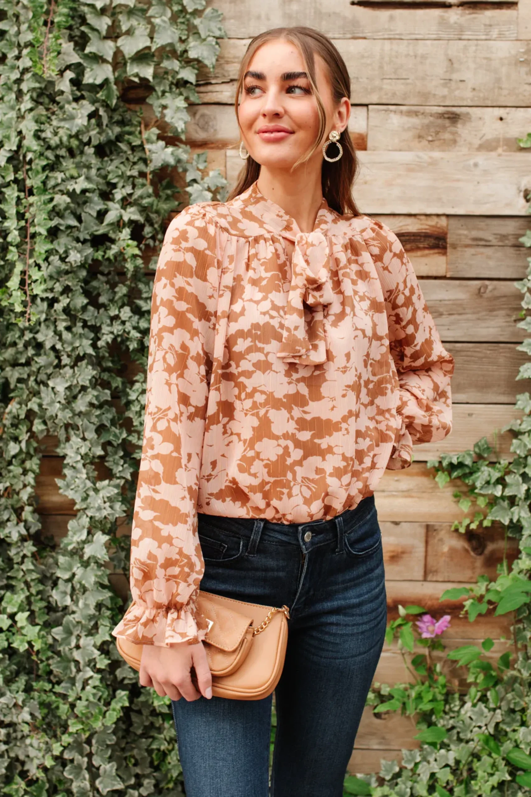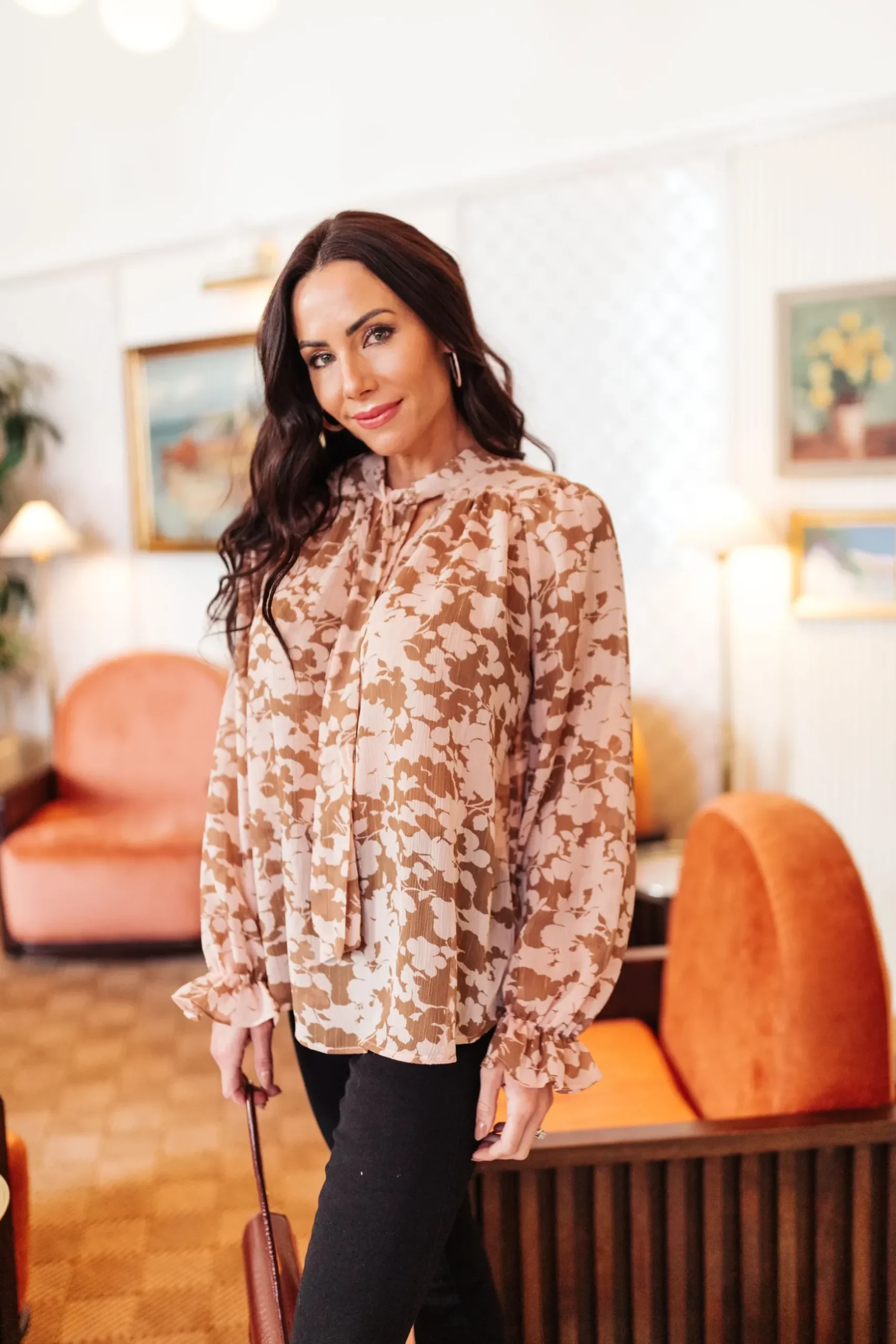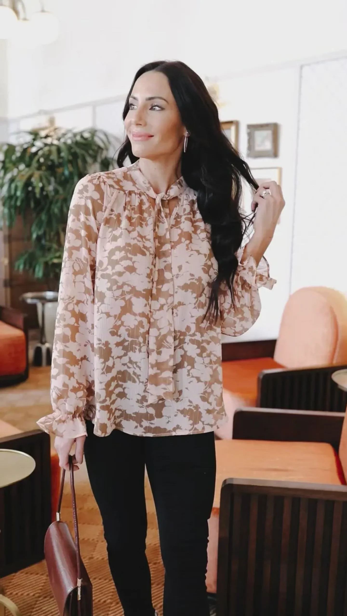 Modern and minimalist, this at ease blouse has a sleek tie-neck, sheer floral designed fabric in a gorgeous mix of pink and tan. Perfect for layering underneath a blazer for a workday look!