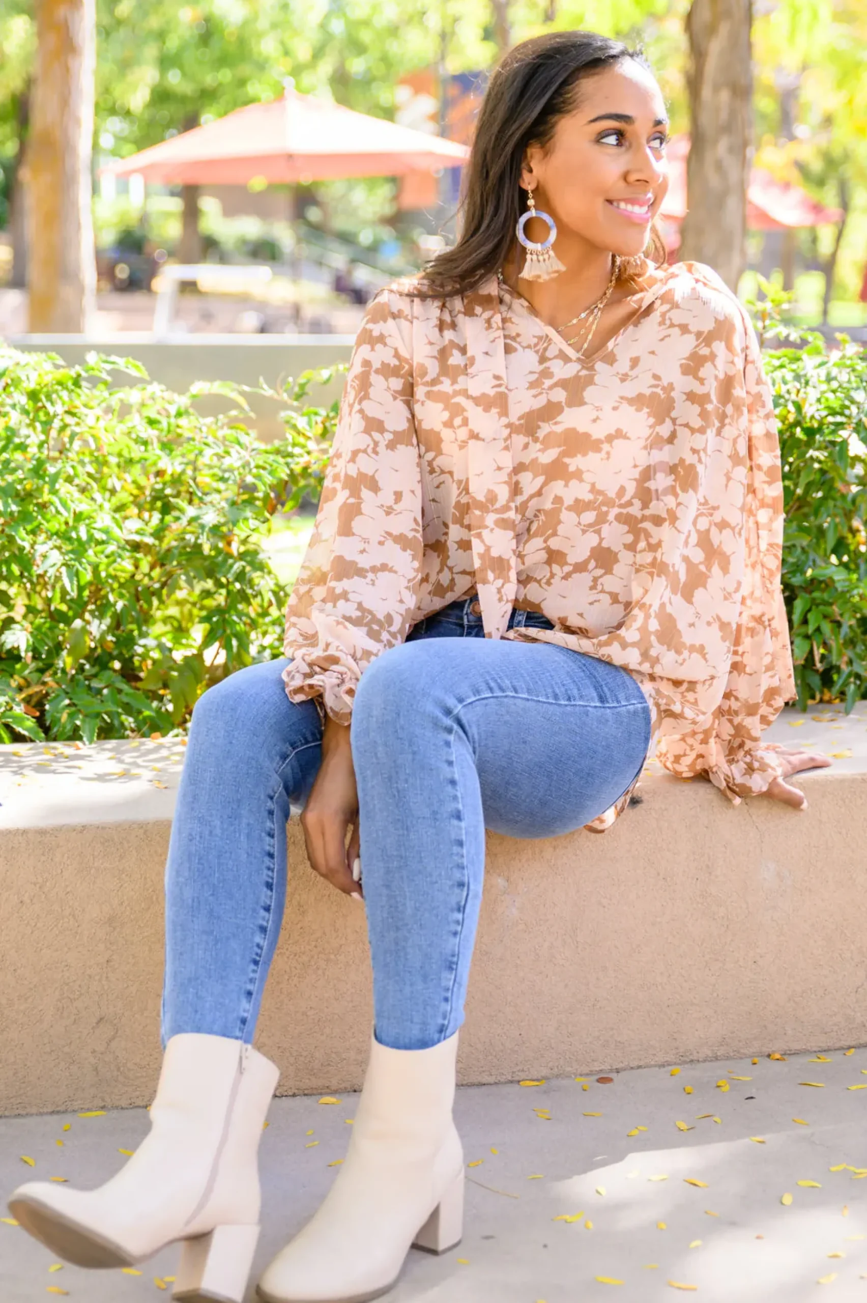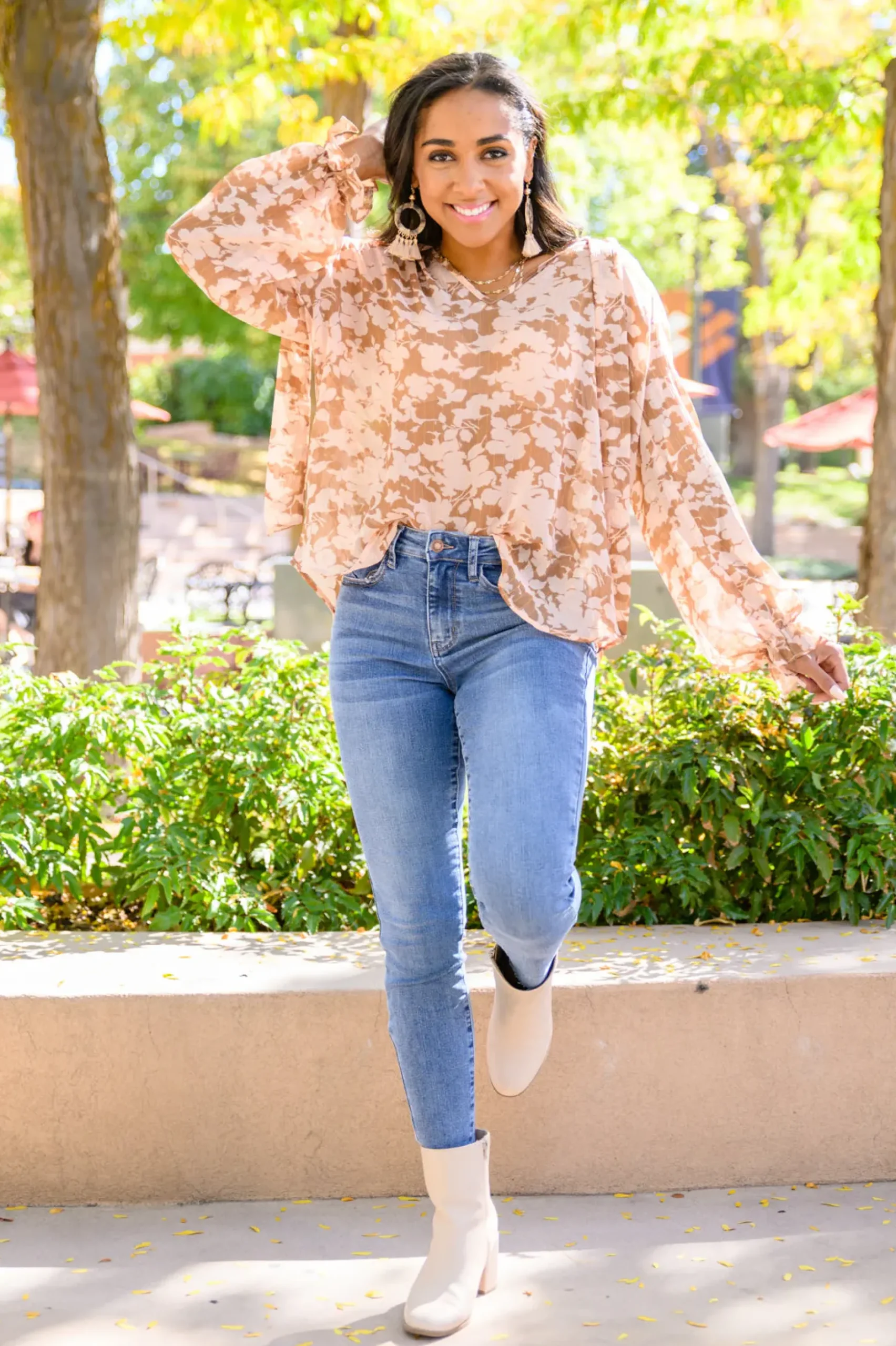 - Floral blouse + Slight sheer fabric