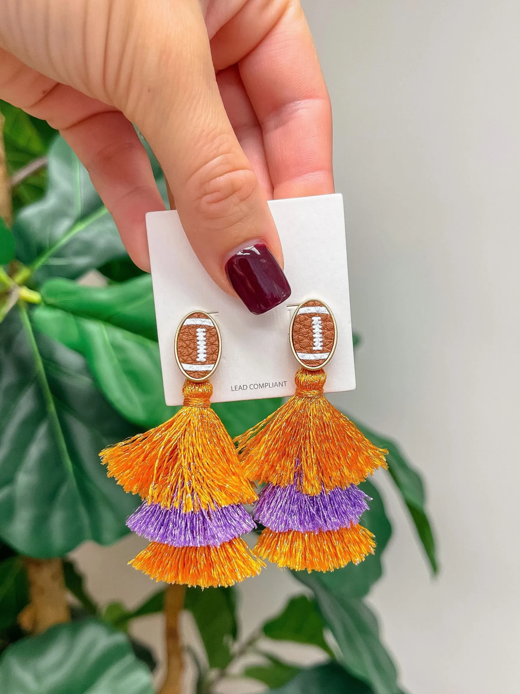Show your team spirit with the Football Tiered Glitter Tassel Dangle Earrings.