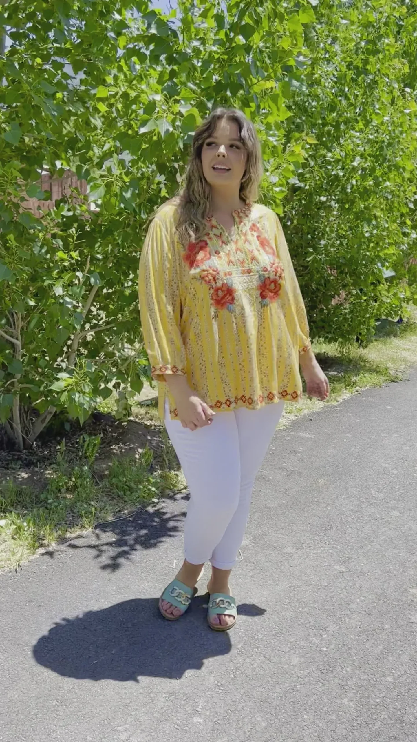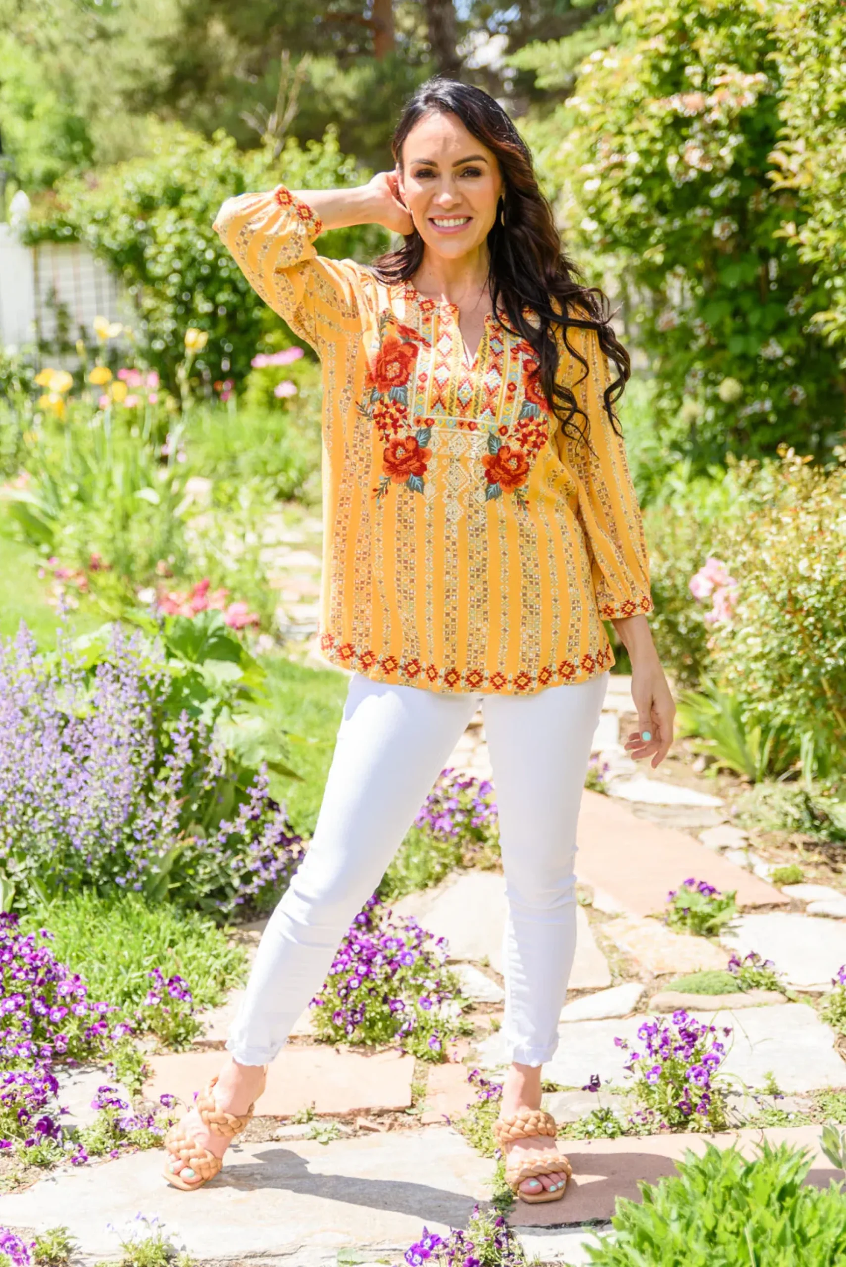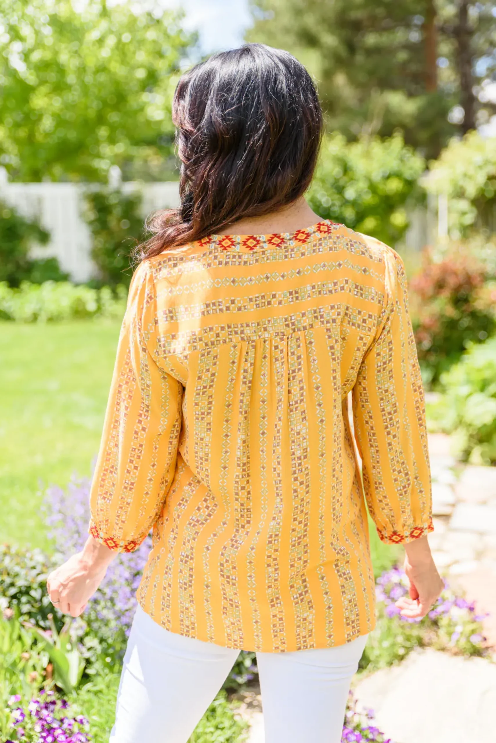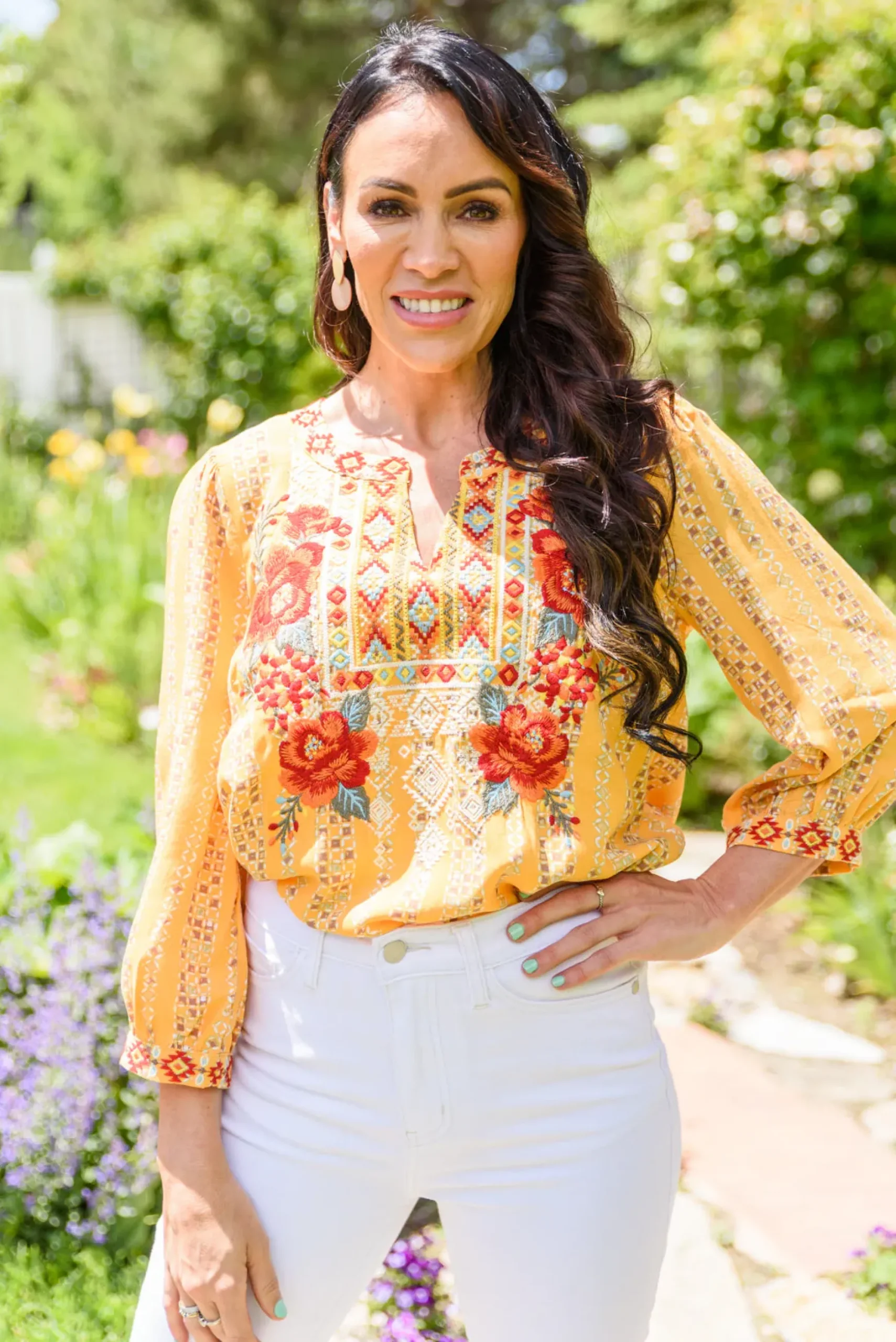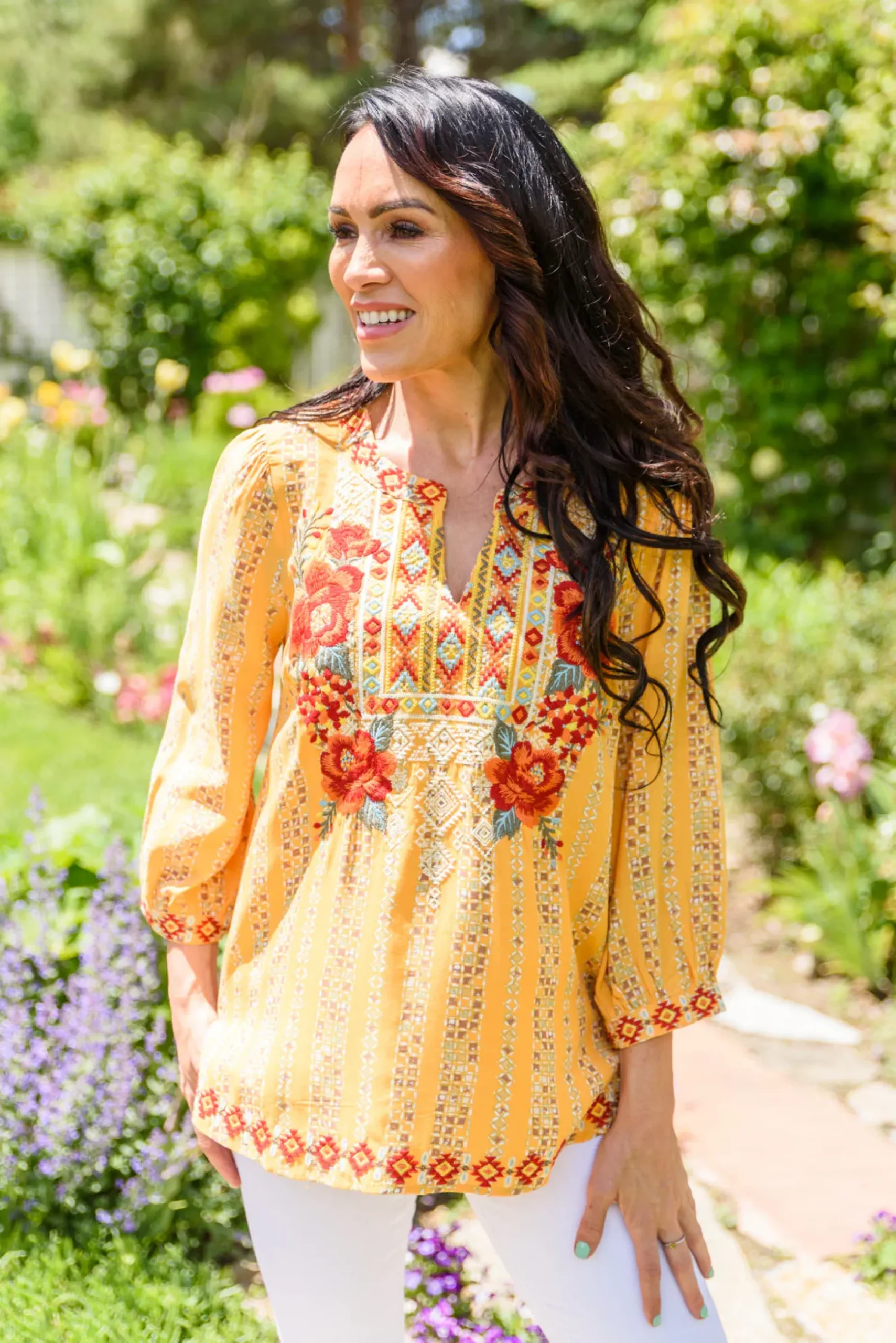A shirt just as pretty as you! The freehand Art Shirt has details we will be infatuated with for days! Featuring a notched neckline decorated in floral embroidery that flows into an a-line silhouette, subtle balloon sleeves, and beautifully embroidered cuffs.