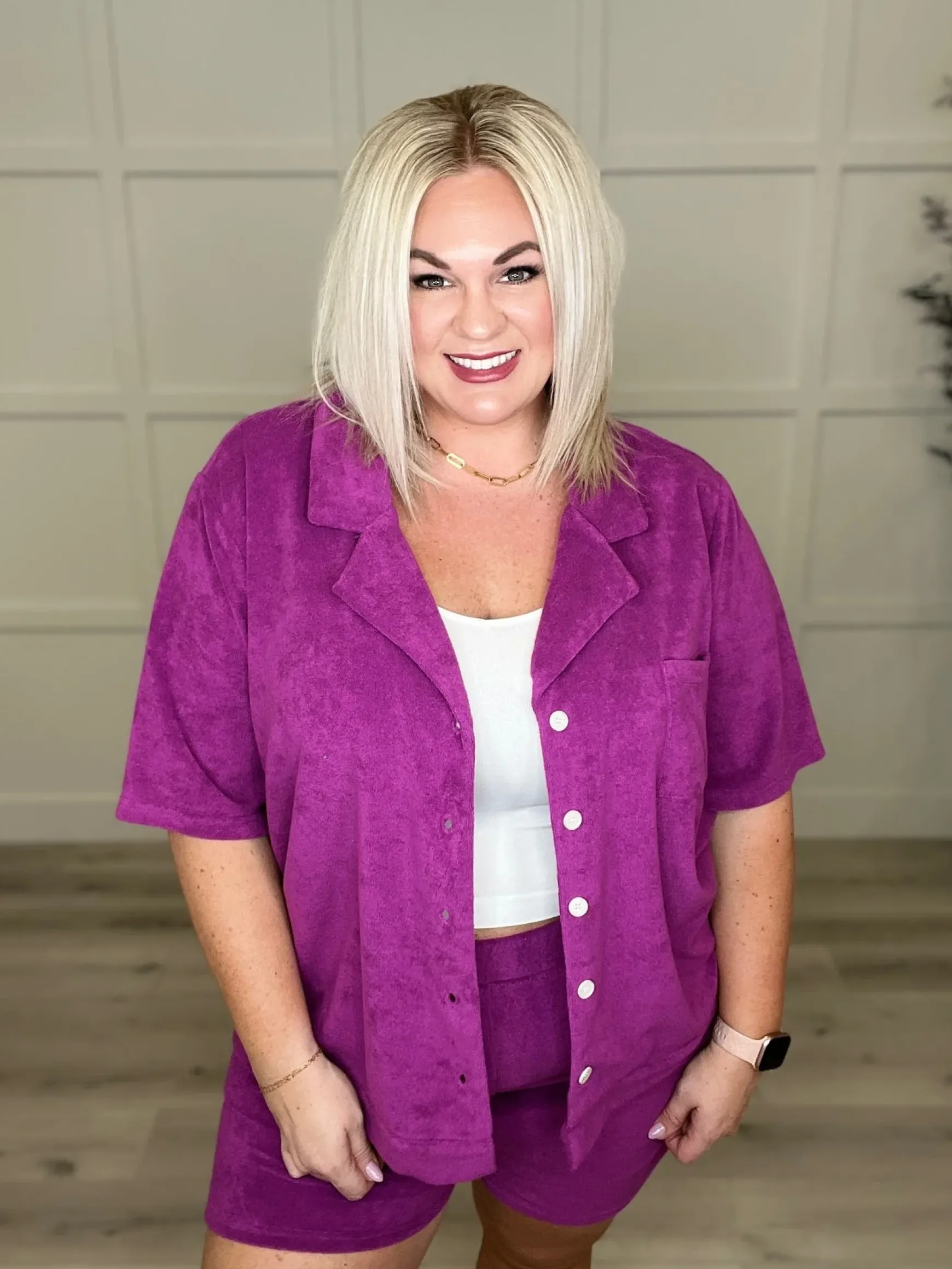 Our French Terry Button Down Top is perfect for an effortless, comfy chic look. Crafted with a soft French terry material, this top features a button down front, v-neckline, and notched lapel for an elevated, casual look.