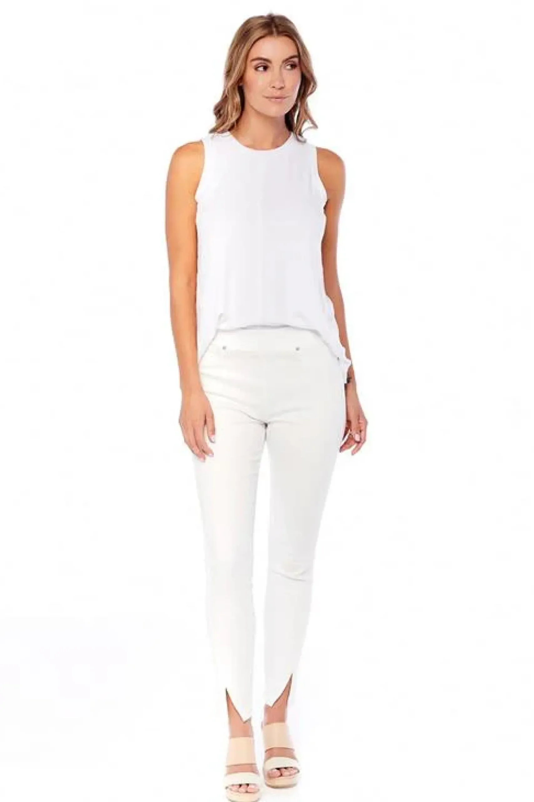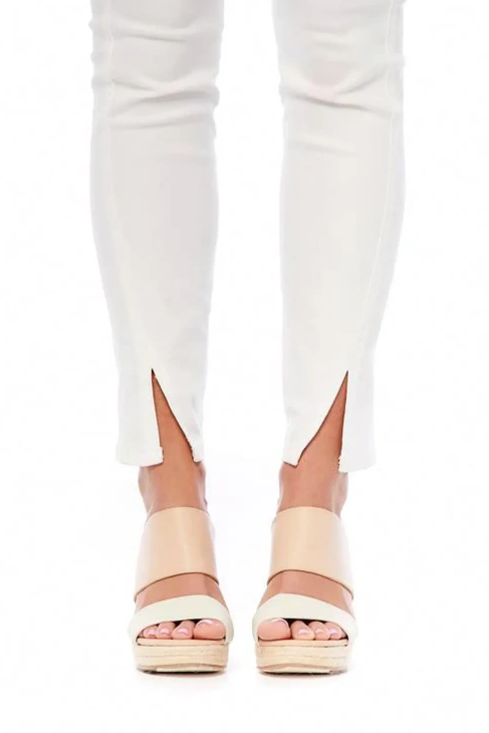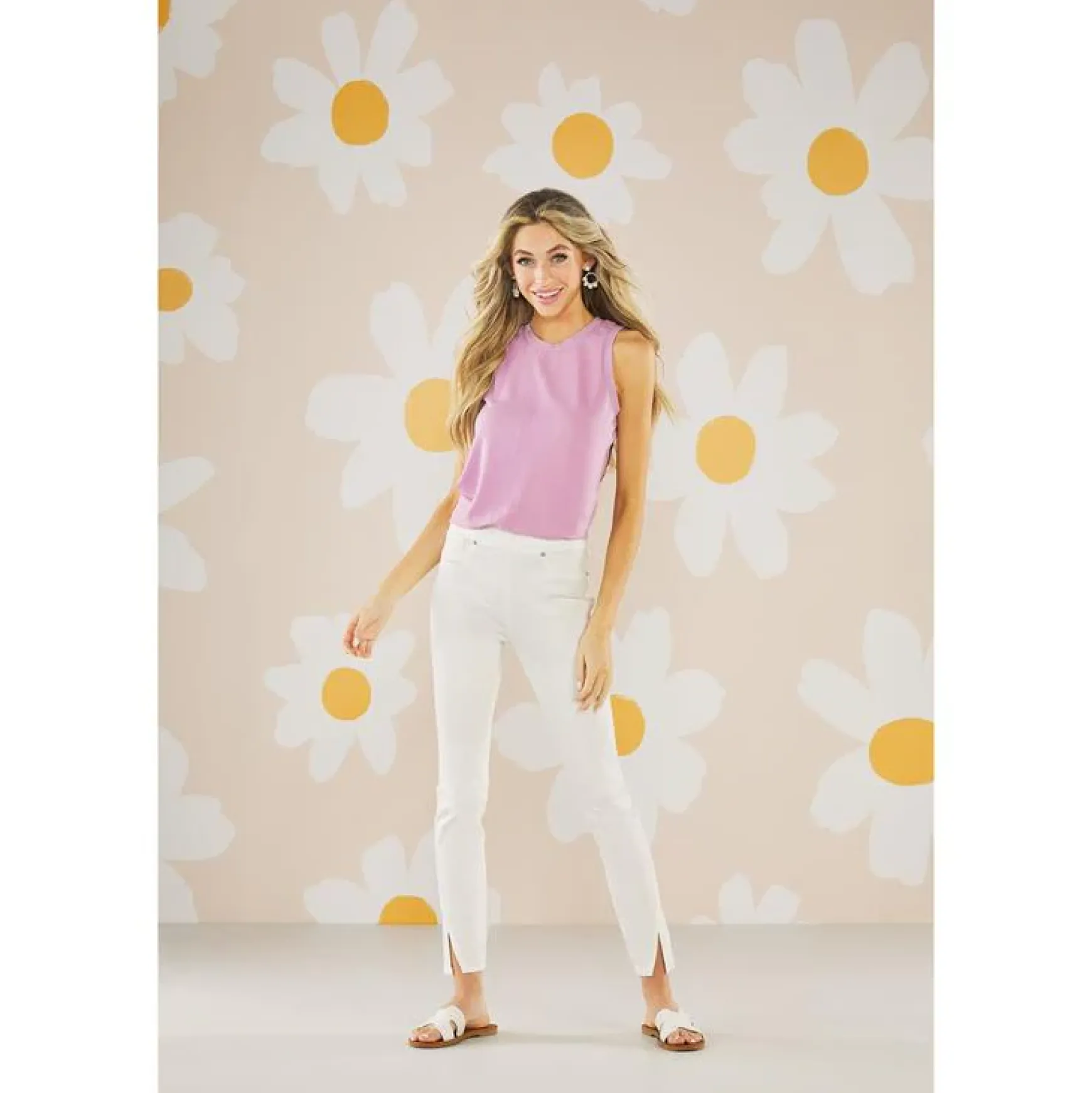 Cotton spandex denim jeans feature elastic waist, faux front pockets, functional back pockets and angled side seam slit hem.