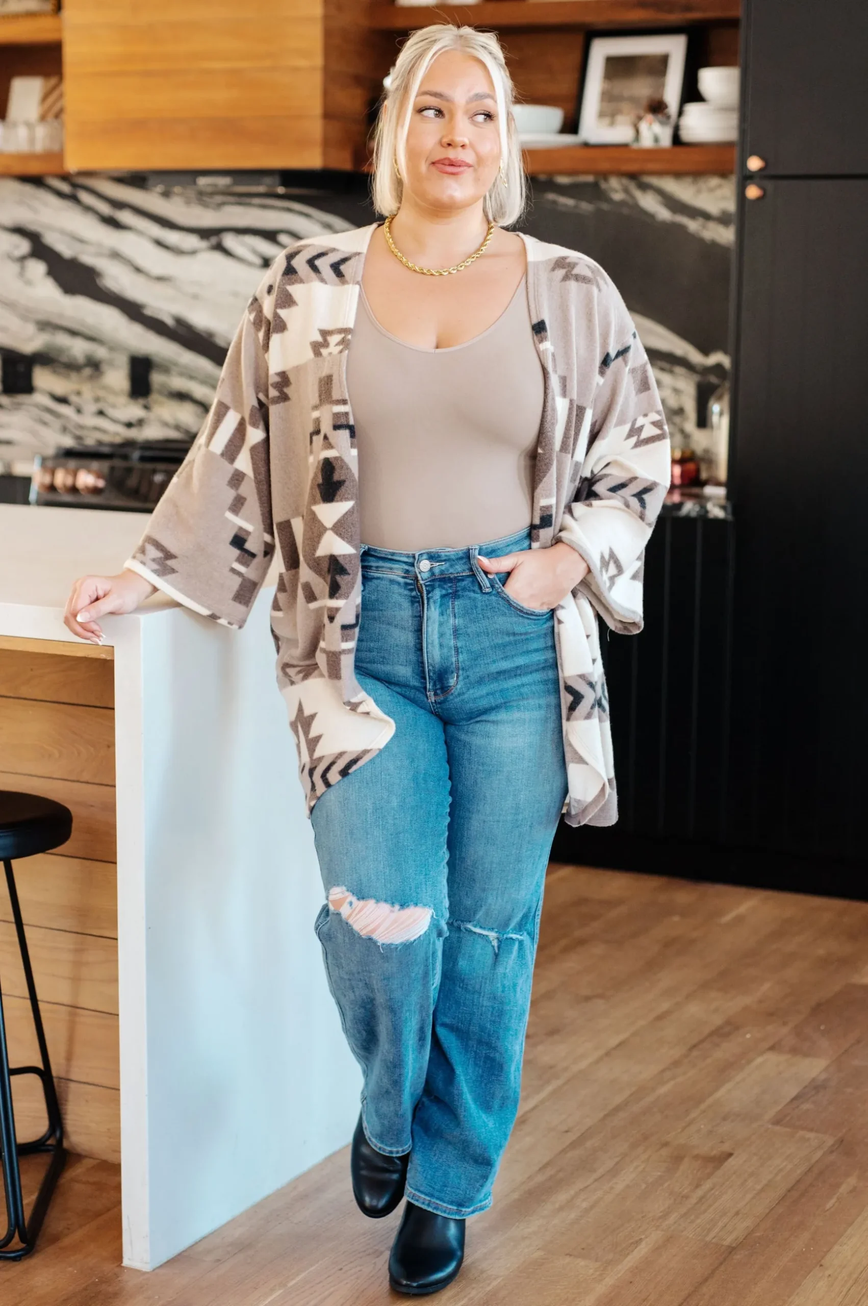 Our Full of Character Blanket Kimono is perfect for cozying up on chilly nights. Made with brushed Hacci fabric, it’s as soft as a blanket and will keep you warm. The dropped shoulder and 3/4 sleeves add a stylish touch, while the open front and geometric design make it the perfect layering piece.