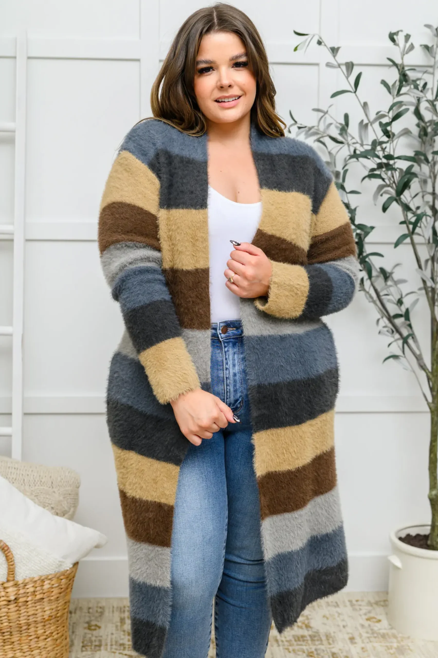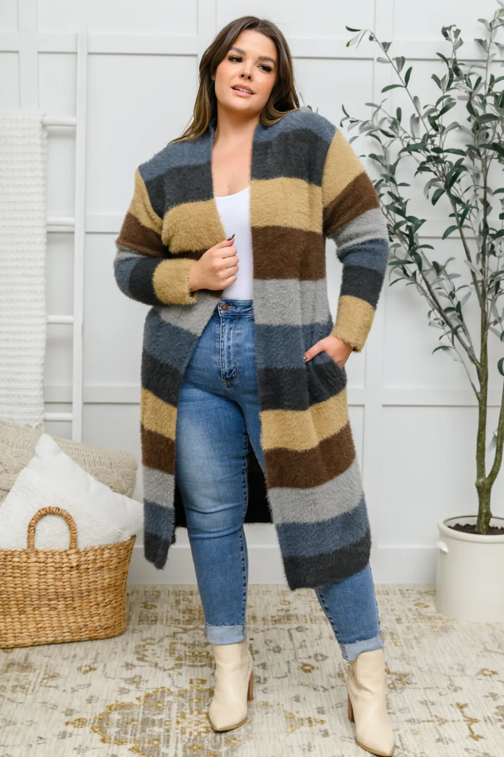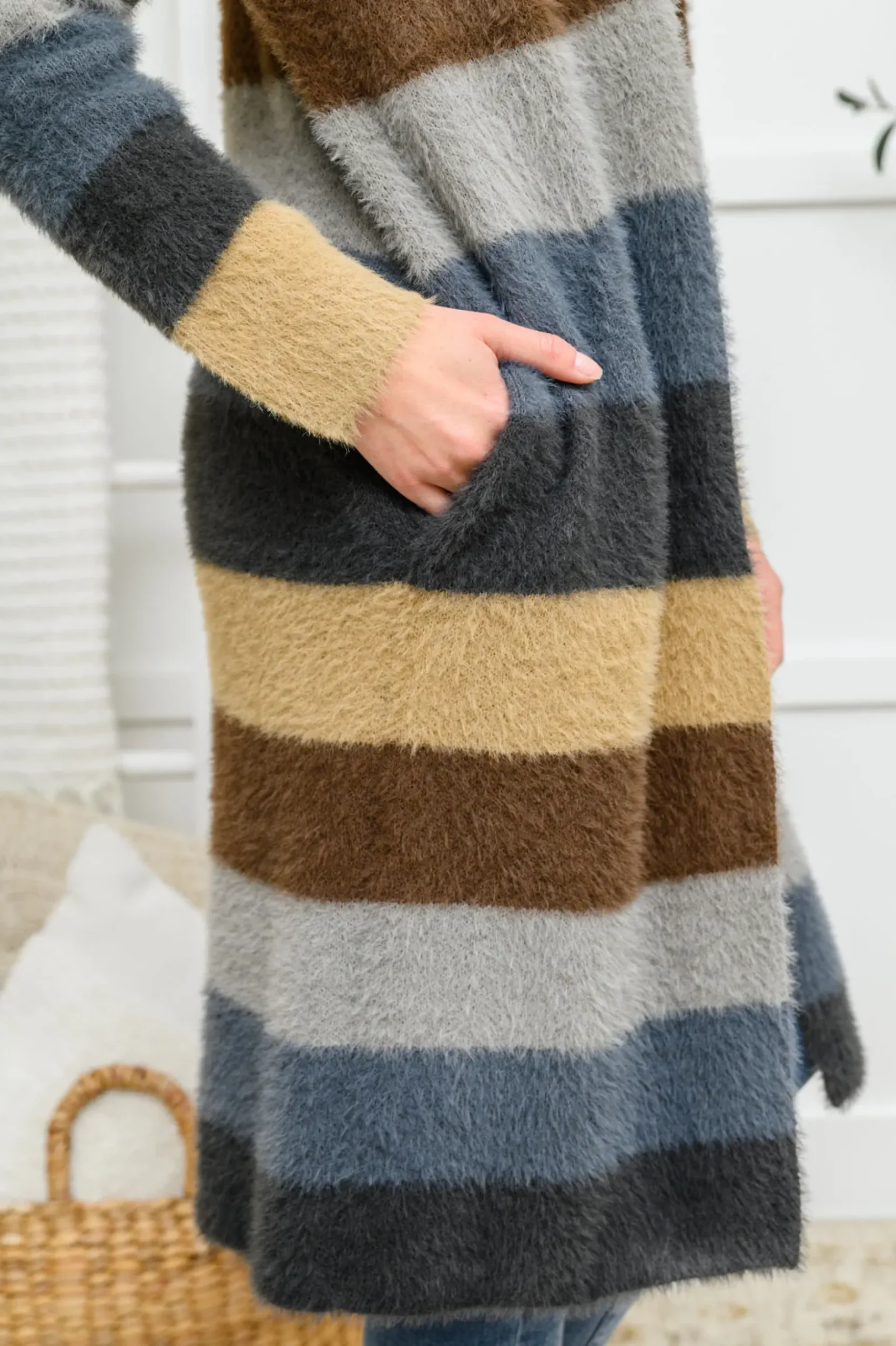 The Fuzzy Longline Cardigan In Blue & Cocoa features a fuzzy medium-weight knit that shapes long sleeves, with an open front, midi length hem, and side pockets. Tones of blue and tan create a cute color block design.