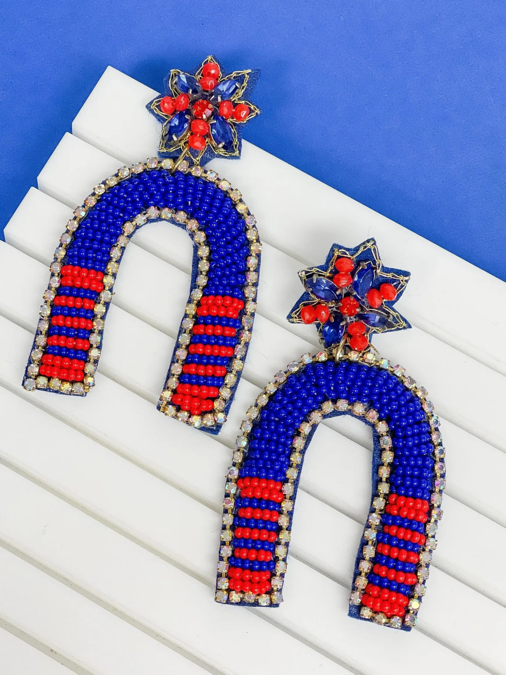 Show off your game day spirit with these blue and red beaded arch dangle earrings. The fun, eye-catching design ensures you’ll be the center of attention wherever you go. Perfect for any sports fan.