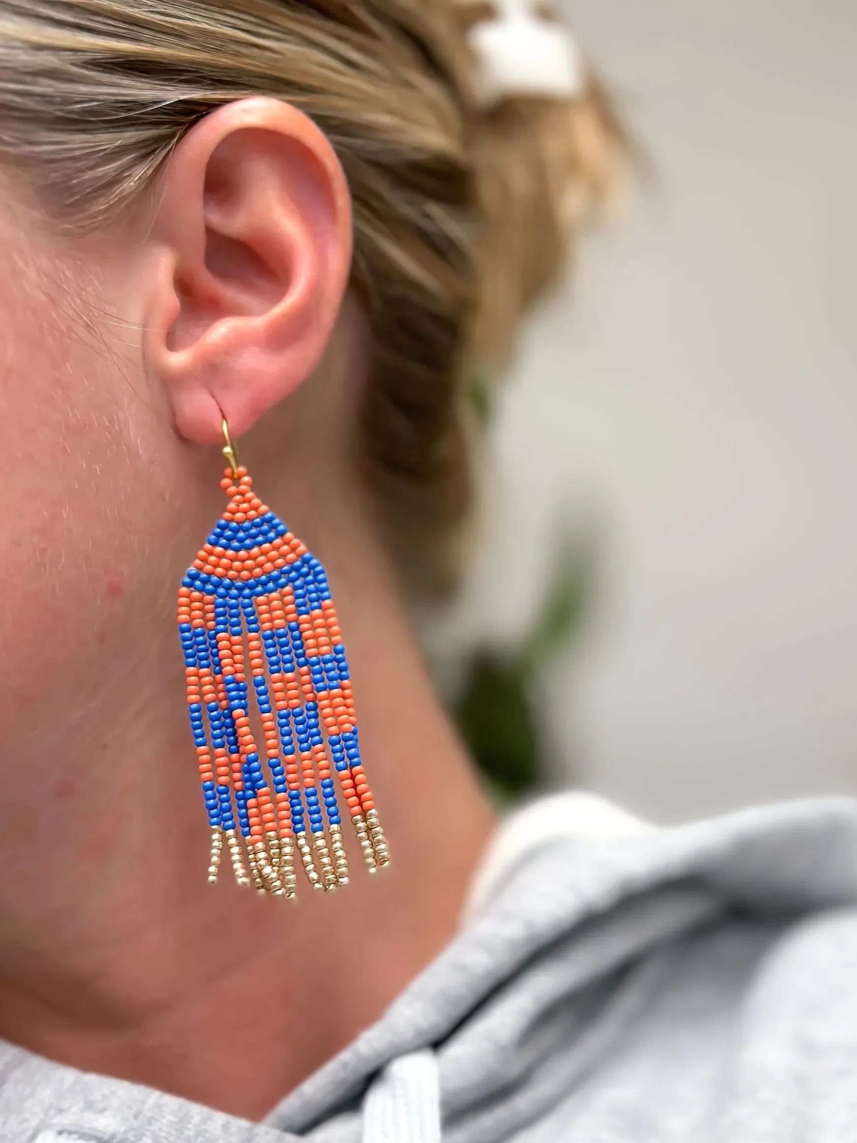Game Day Seed Bead Fringe Dangle Earrings – Orange & Blue