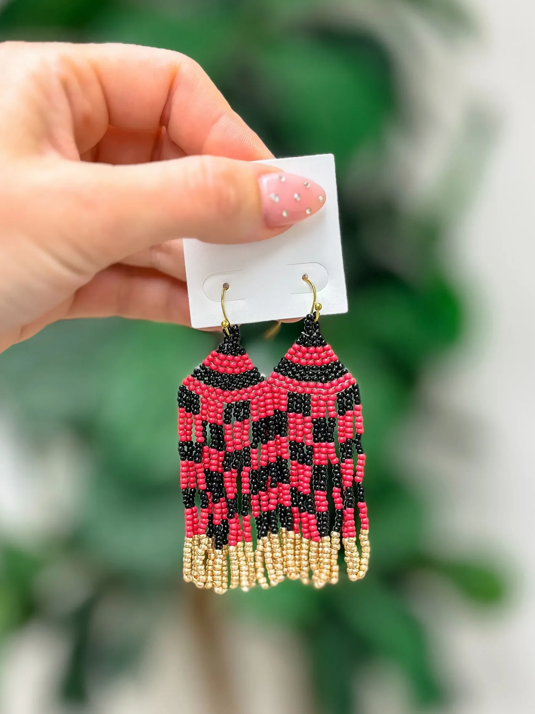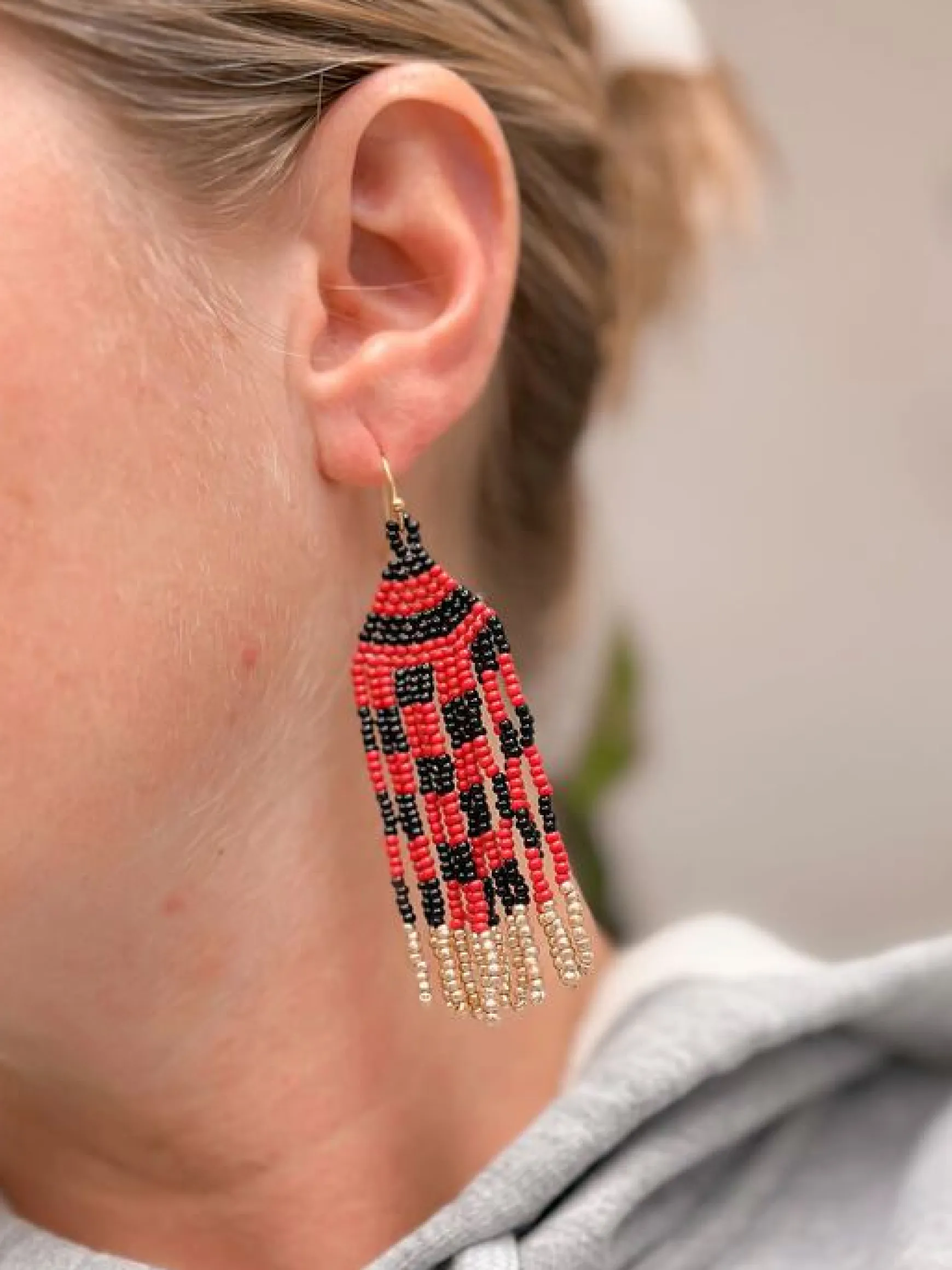 Game Day Seed Bead Fringe Dangle Earrings – Red & Black