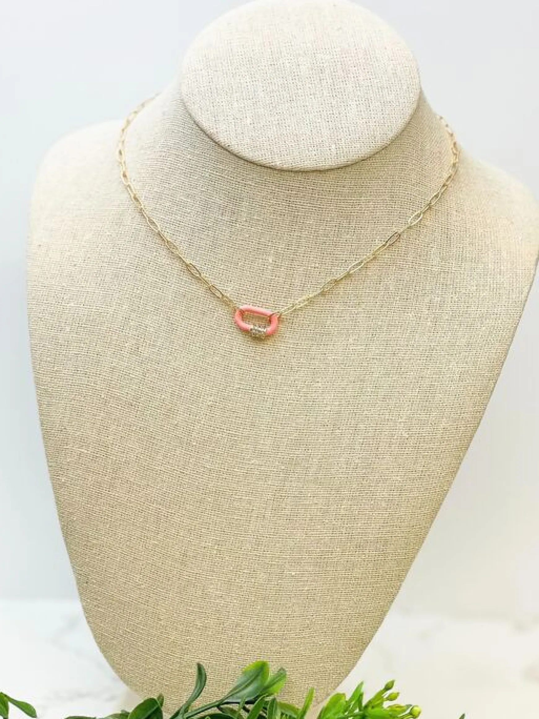 This elegant pendant necklace features intricate locked link design with a pop of glitzy pink color. Perfect for adding a touch of fun and style to any outfit.