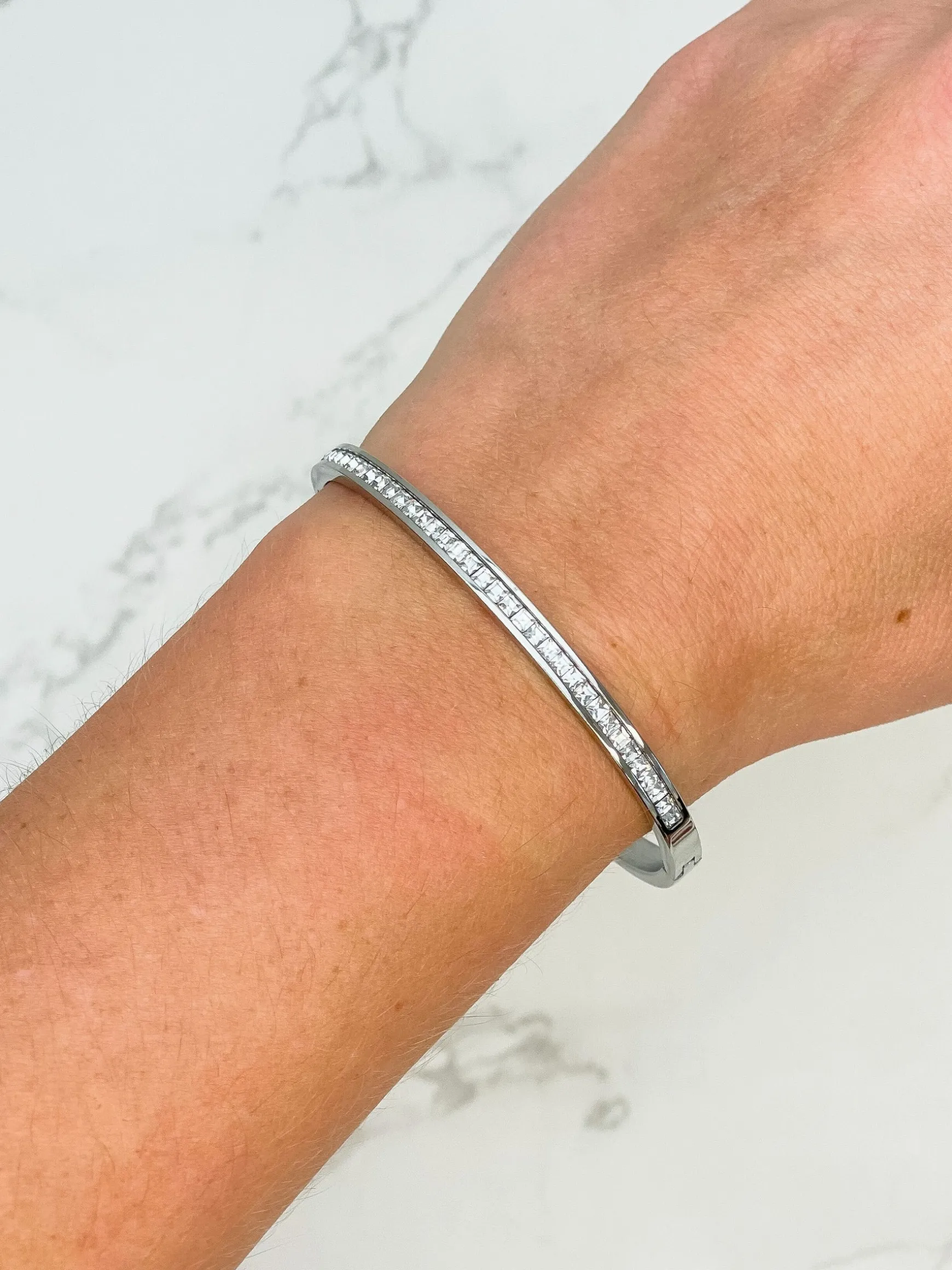 Glitzy Stainless Steel Hinge Bangle Bracelet – Silver