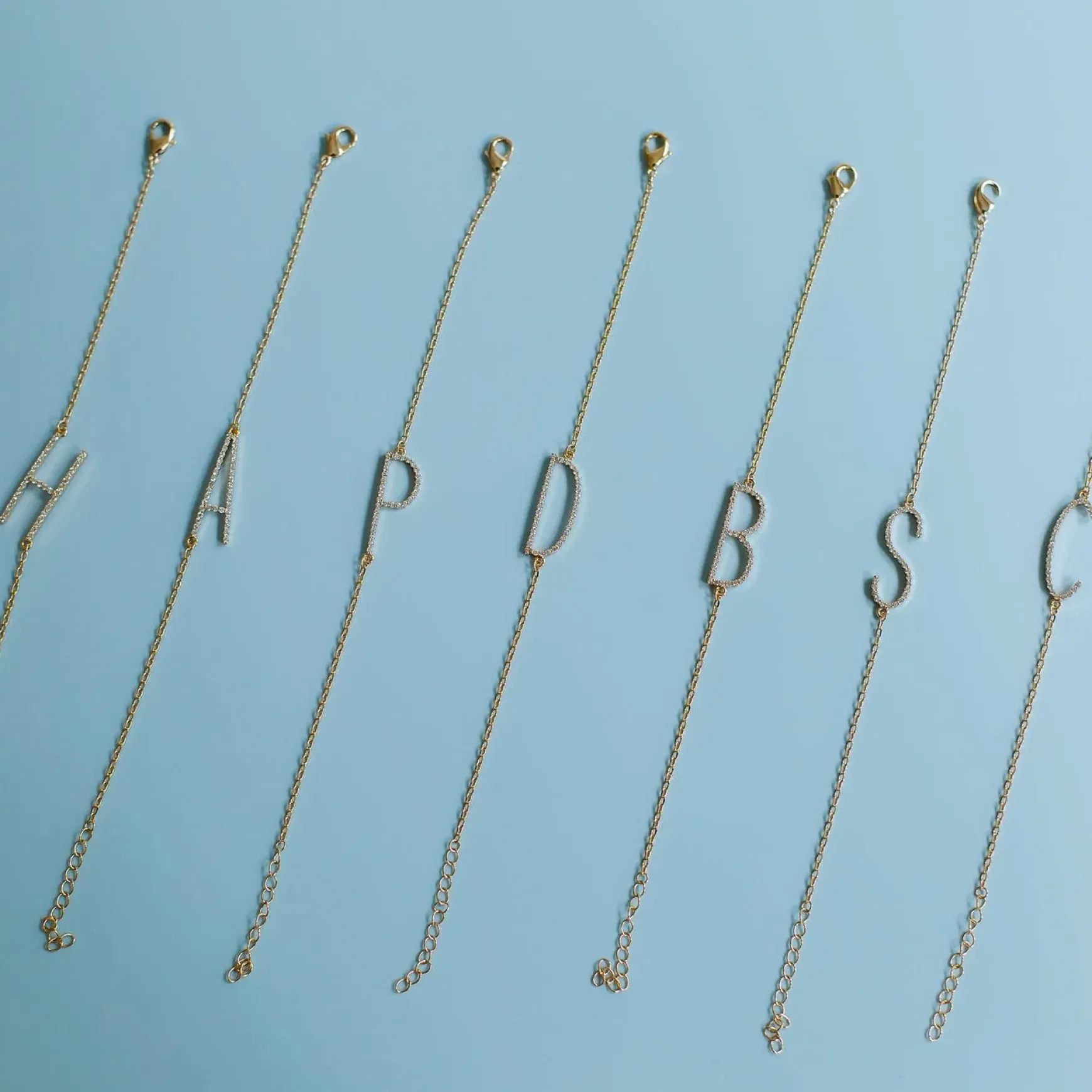This Gold Glitzy Initial Bracelet is crafted with a delicate gold chain and a shimmering initial charm, this bracelet effortlessly combines elegance and personalization.