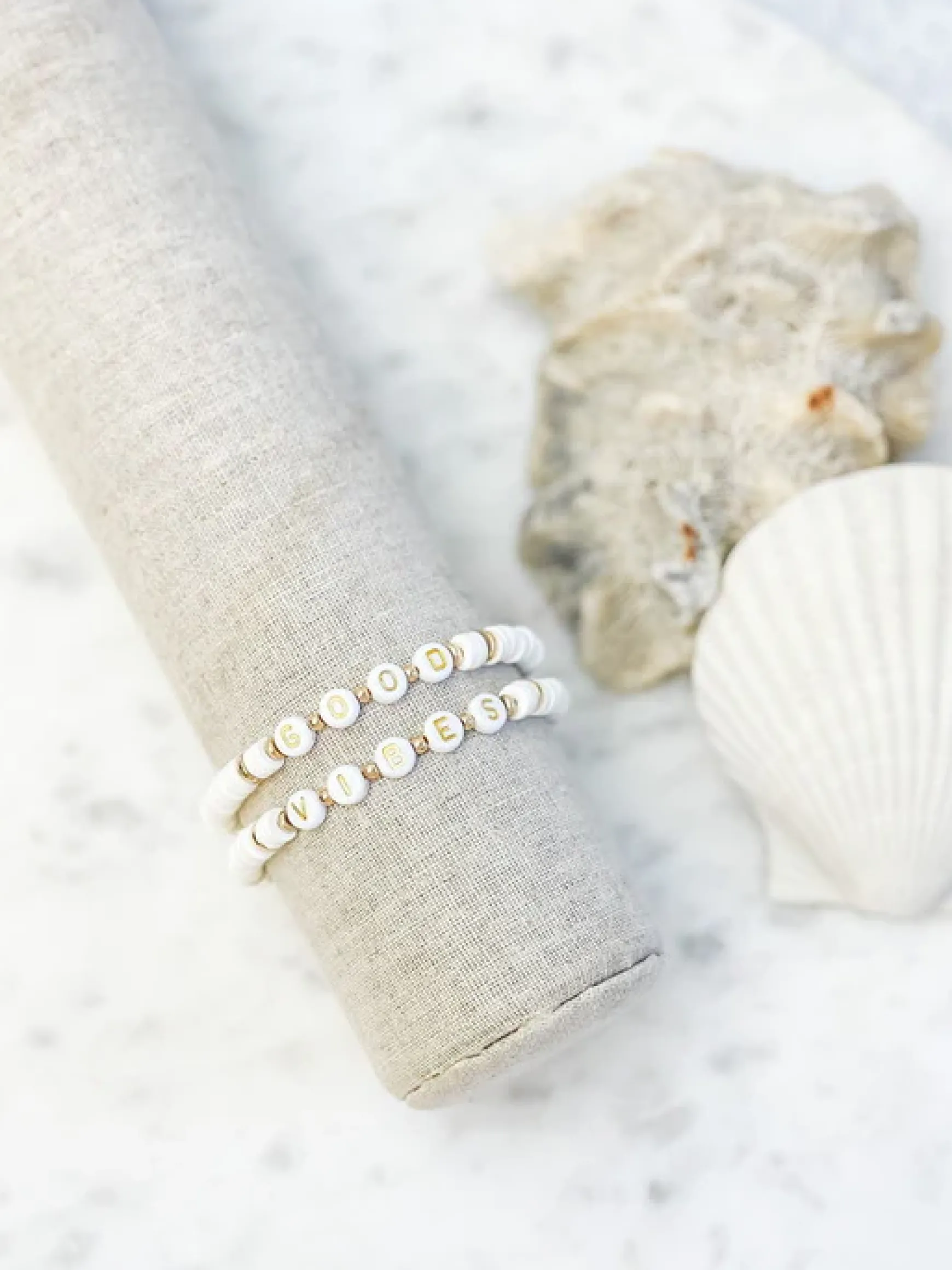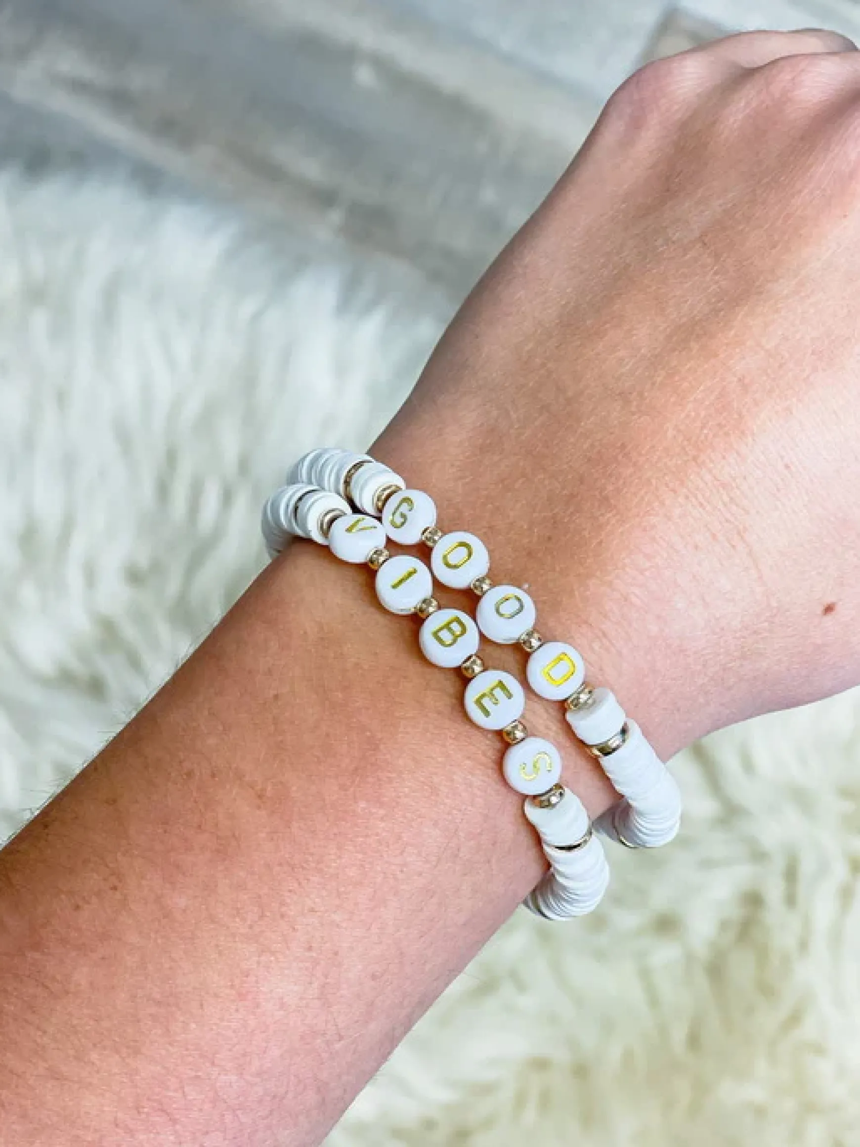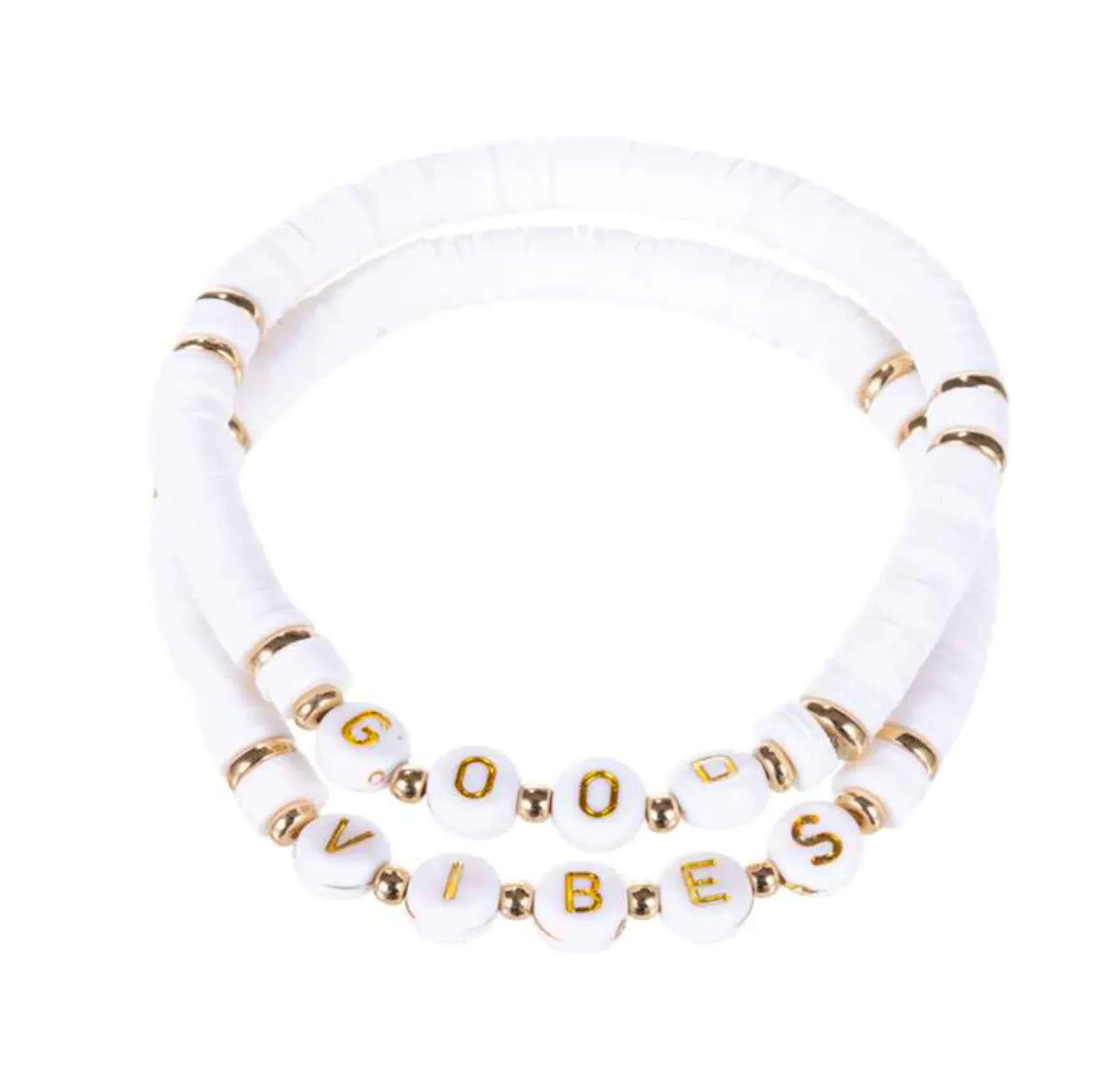 Be the first to review “‘Good Vibes’ Stretch Bracelet Set – White” Cancel reply