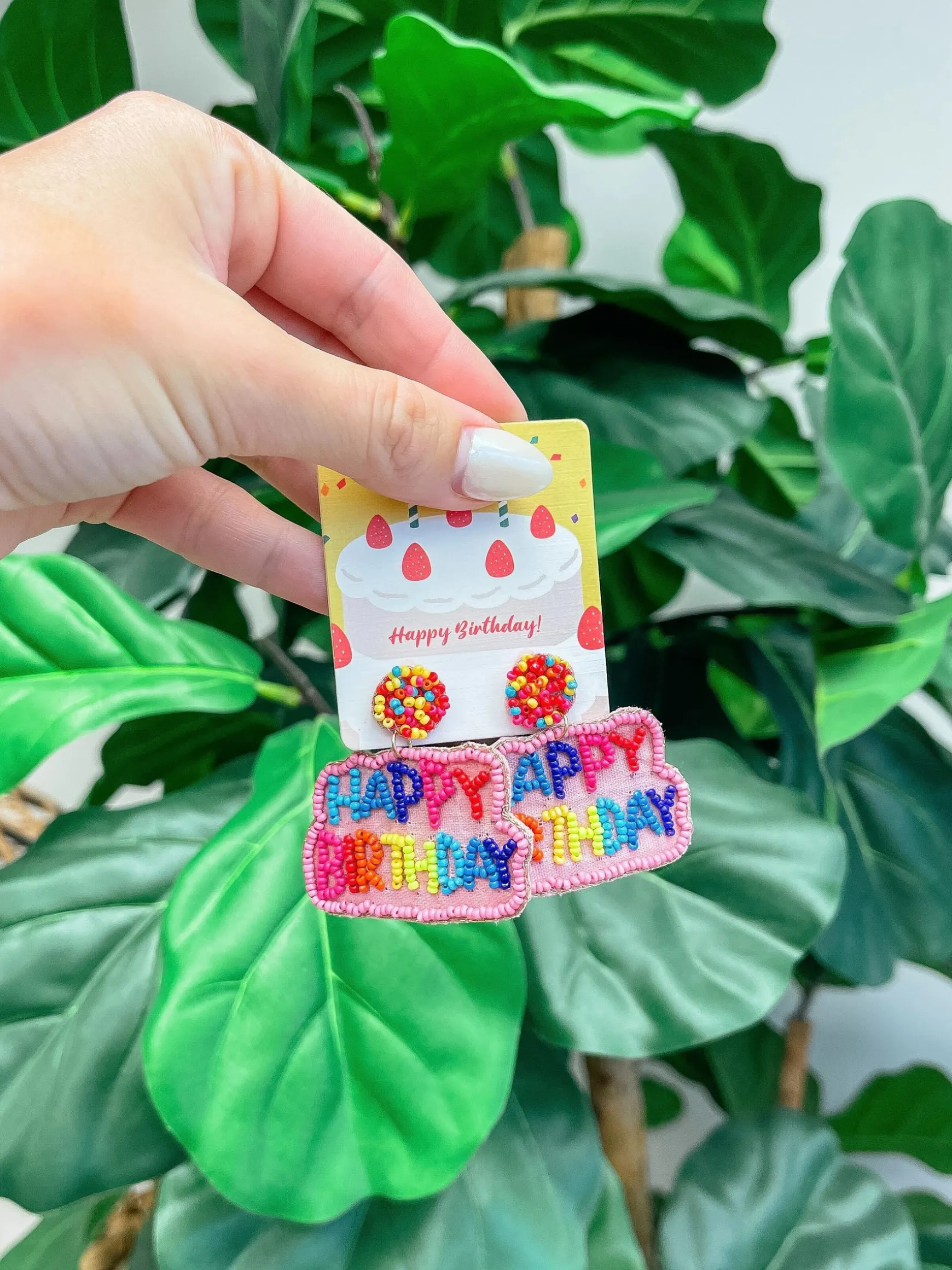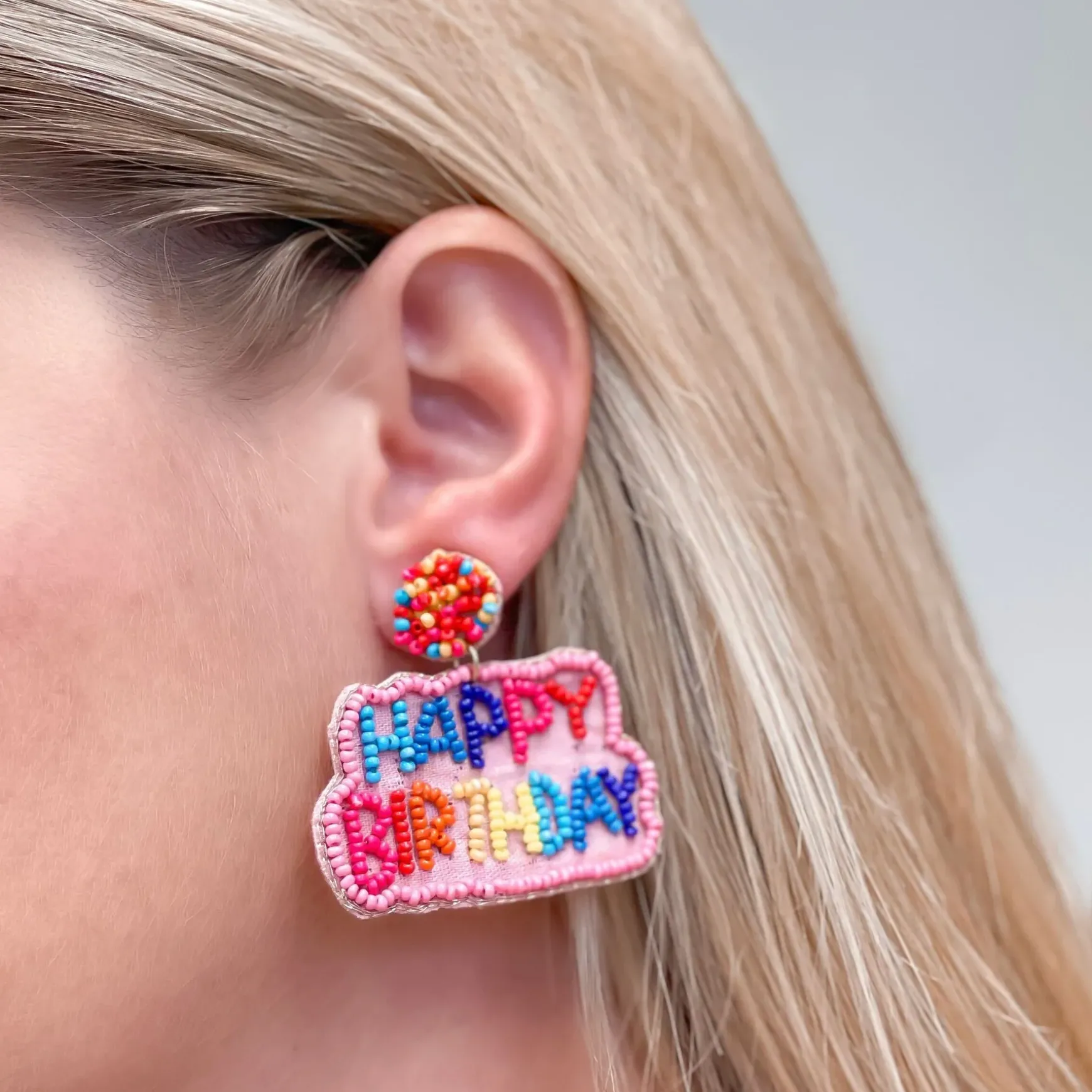 These ‘Happy Birthday’ Seed Bead Embroidered Dangle Earrings are a unique and special way to celebrate the special day.