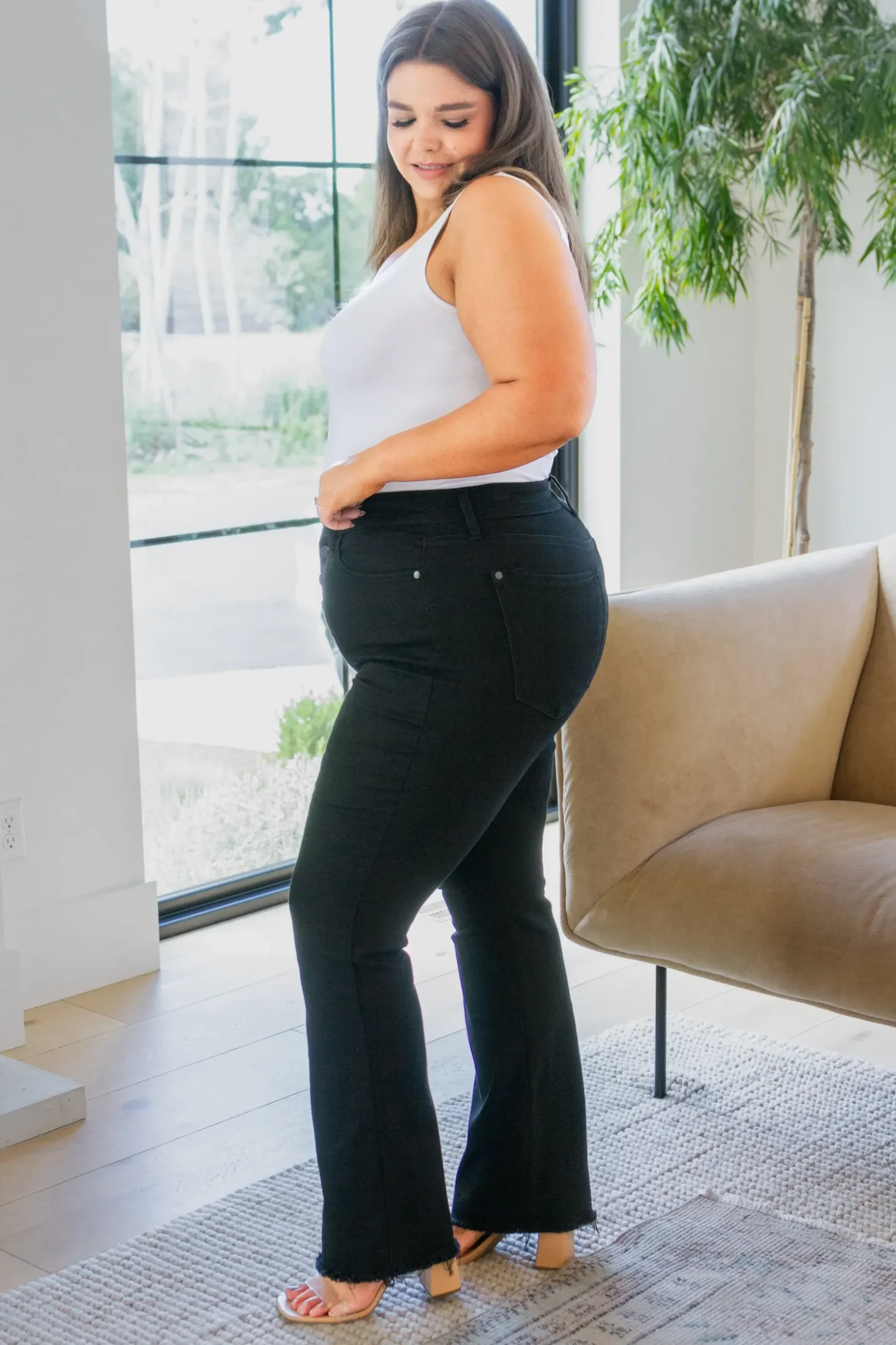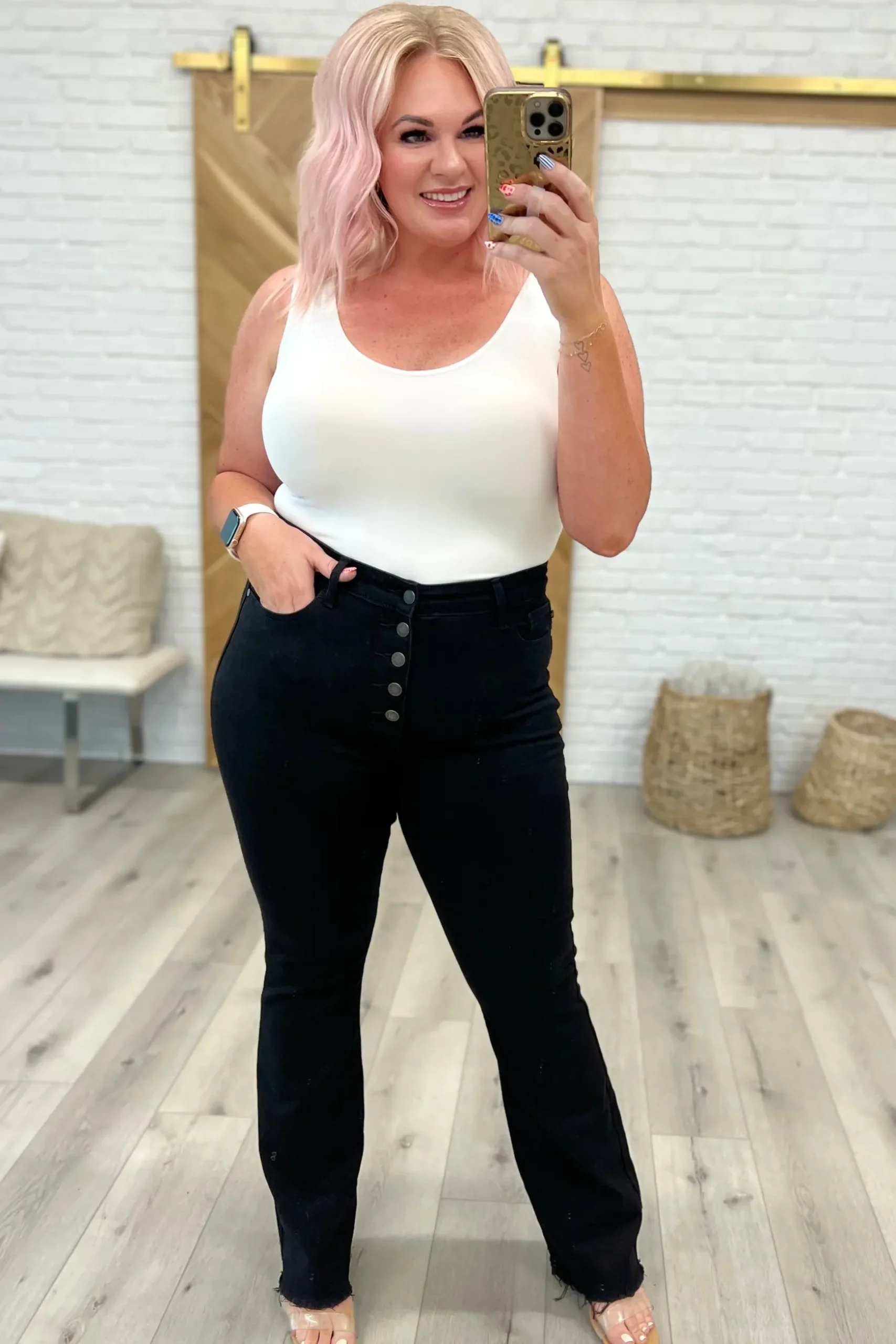 Look and feel your best in our stylish Harriet High Rise Button Fly Bootcut Jeans from Judy Blue. With a comfortable high rise, button fly, bootcut style & raw hem, these timeless jeans add a subtle texture and rich black color to your wardrobe. A must-have for any fashionista!
