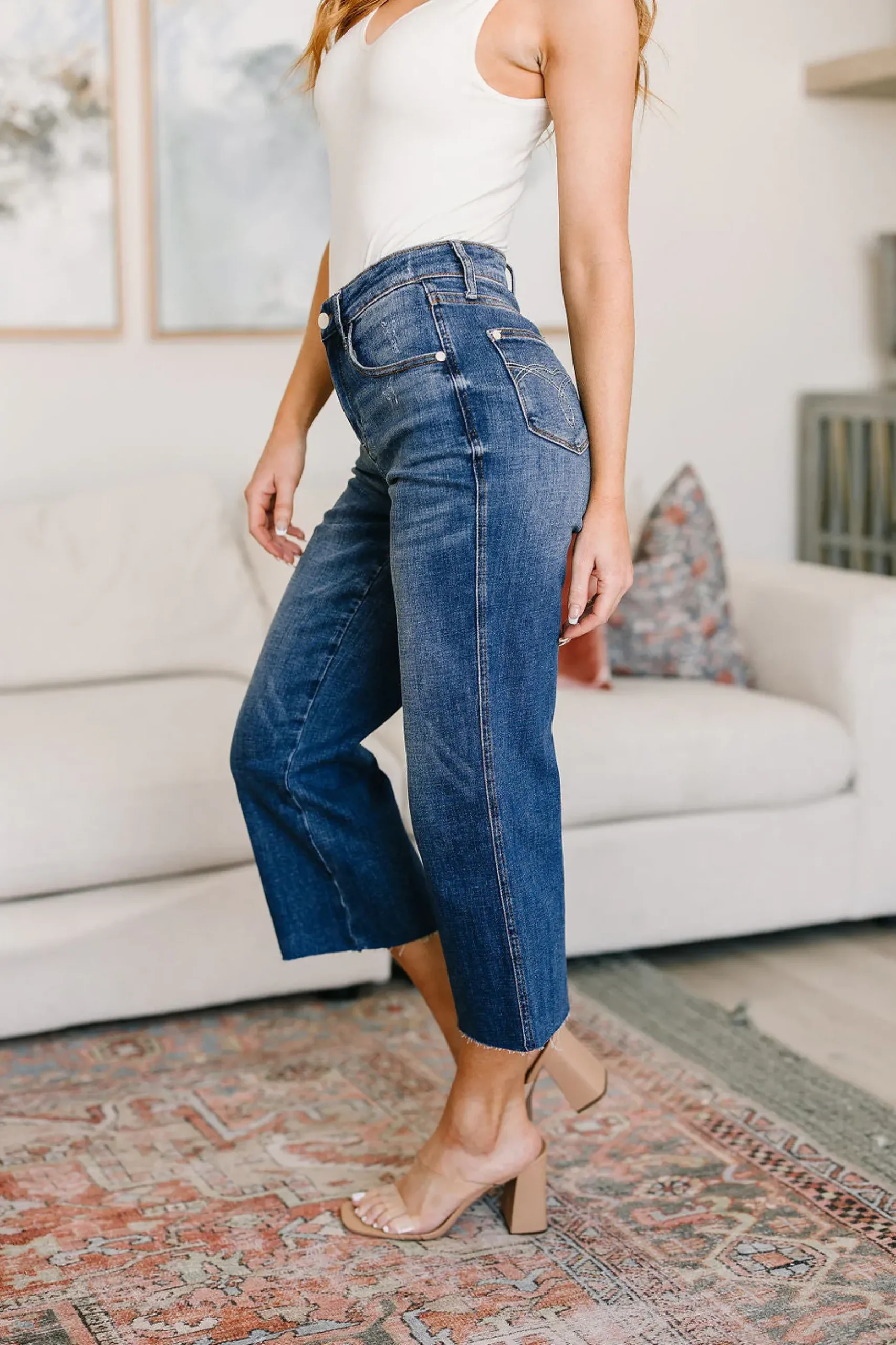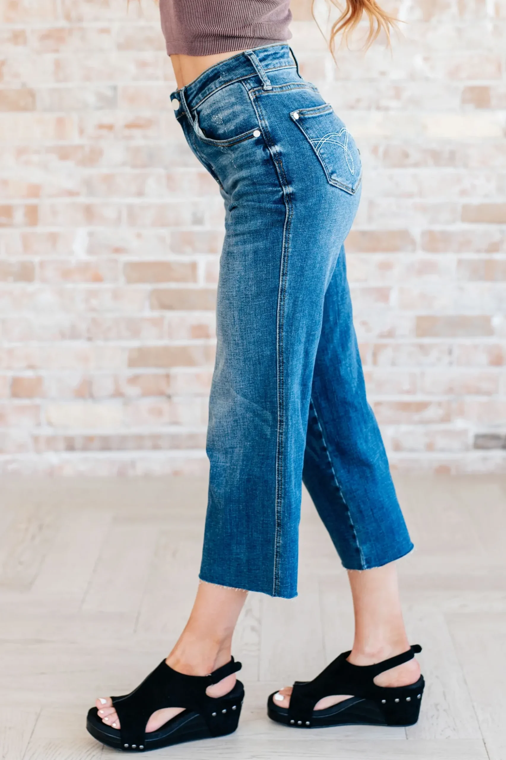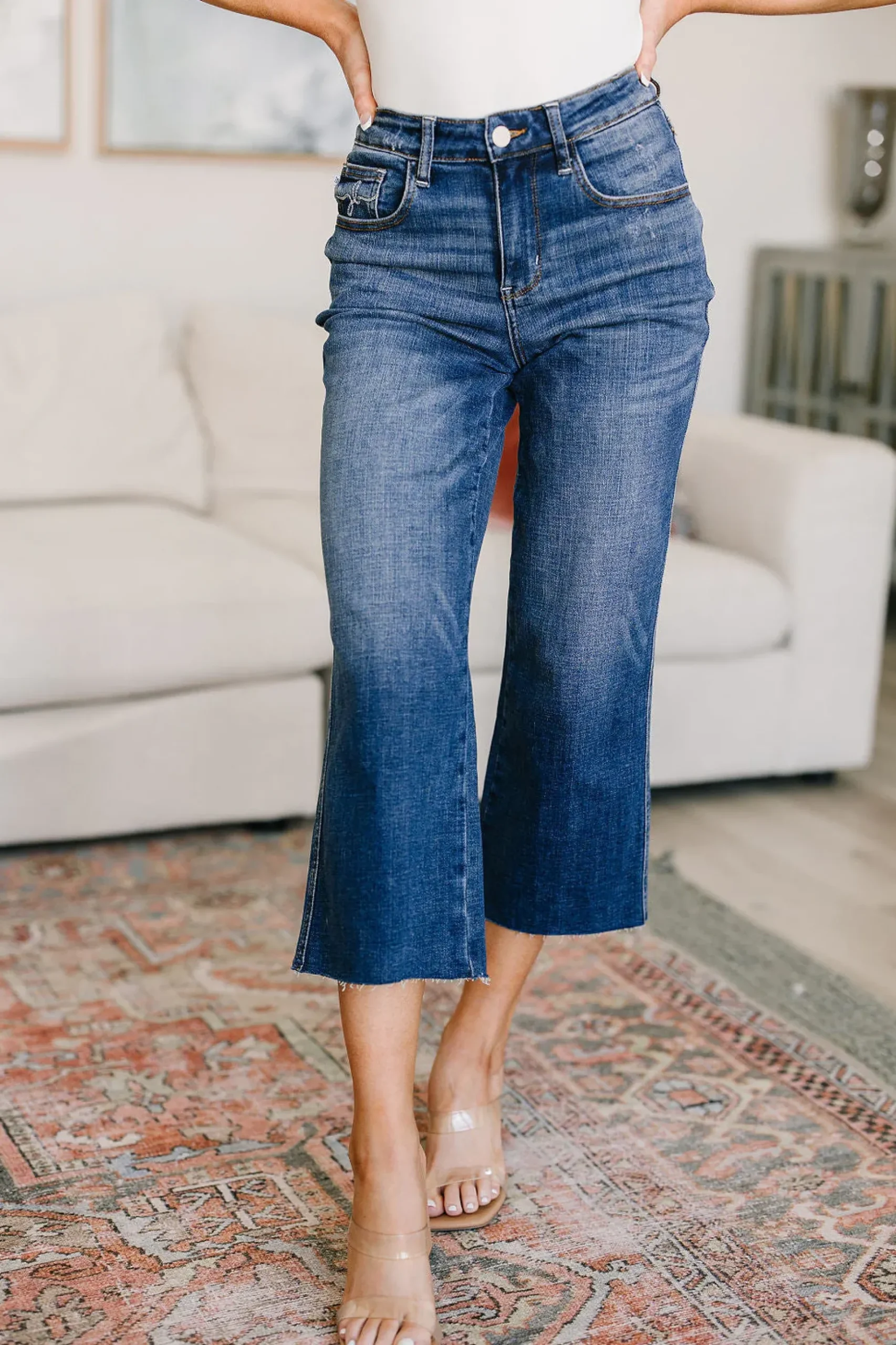 Discover effortless summer style with the Hayes High Rise Wide Leg Crop Jeans. This medium-wash denim is cut with a relaxed wide leg for a flattering, modern fit, embroidered accents, plus a cropped length and raw hem for a cool contemporary feel. With minimal distressing and a high-rise waist for the perfect silhouette, these jeans check all the boxes.