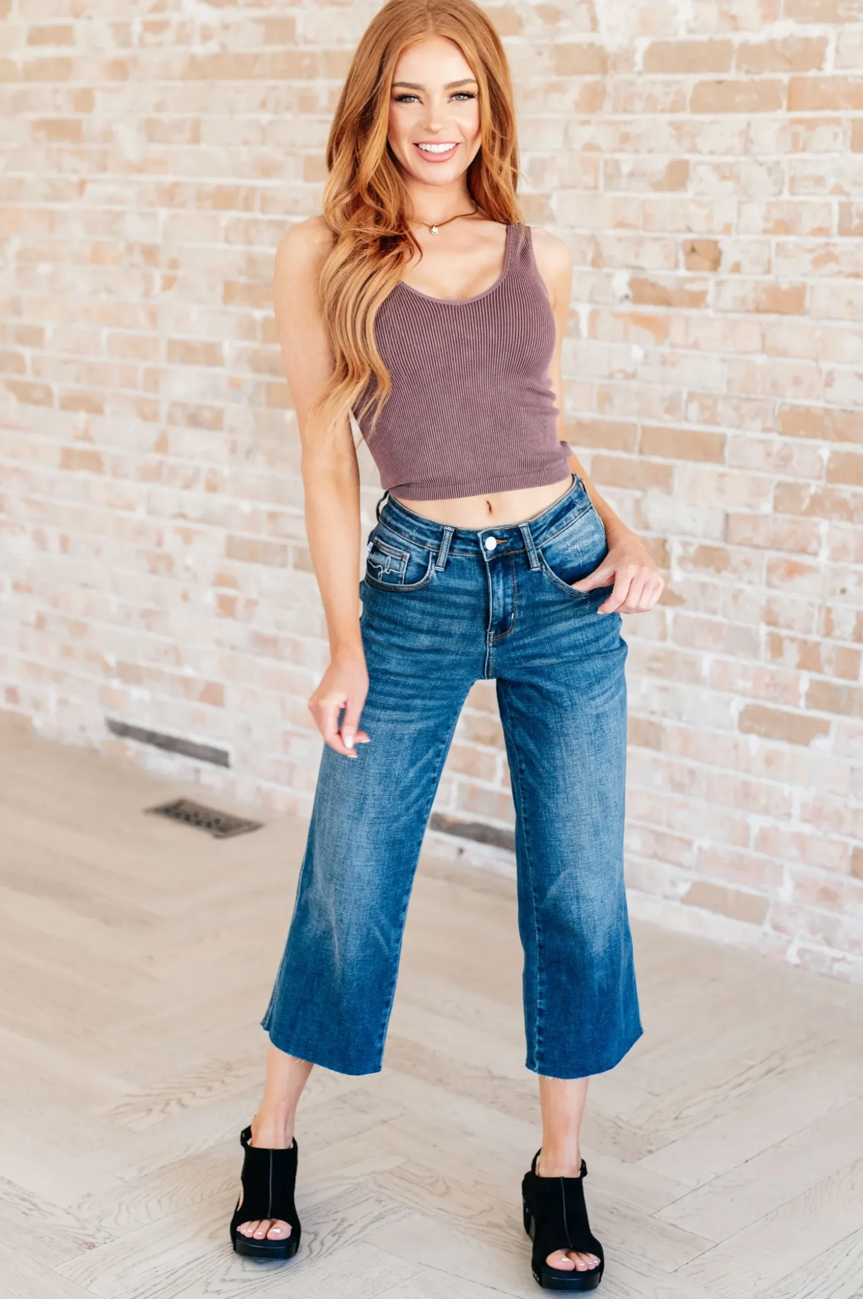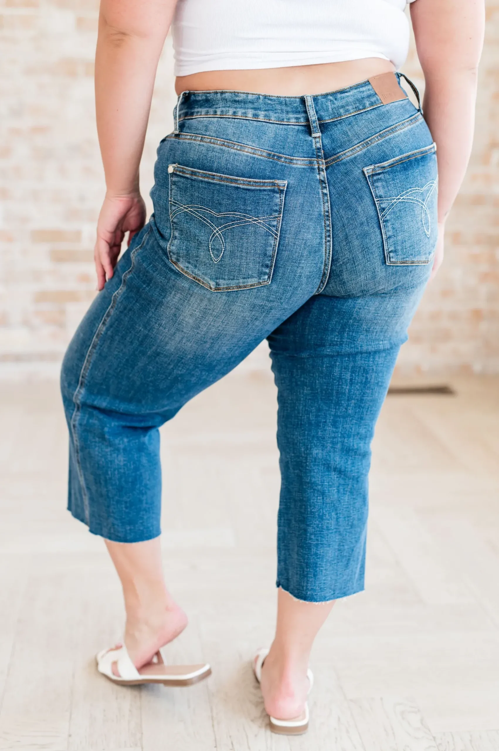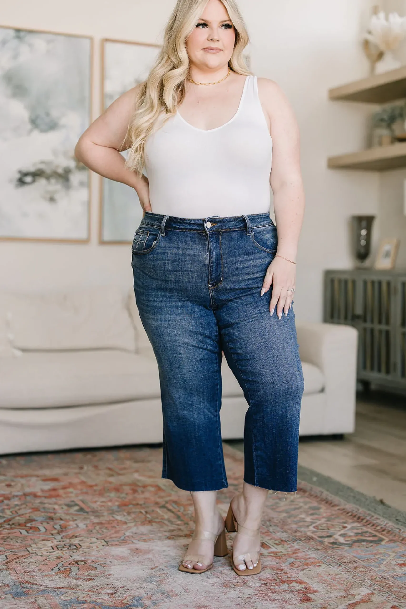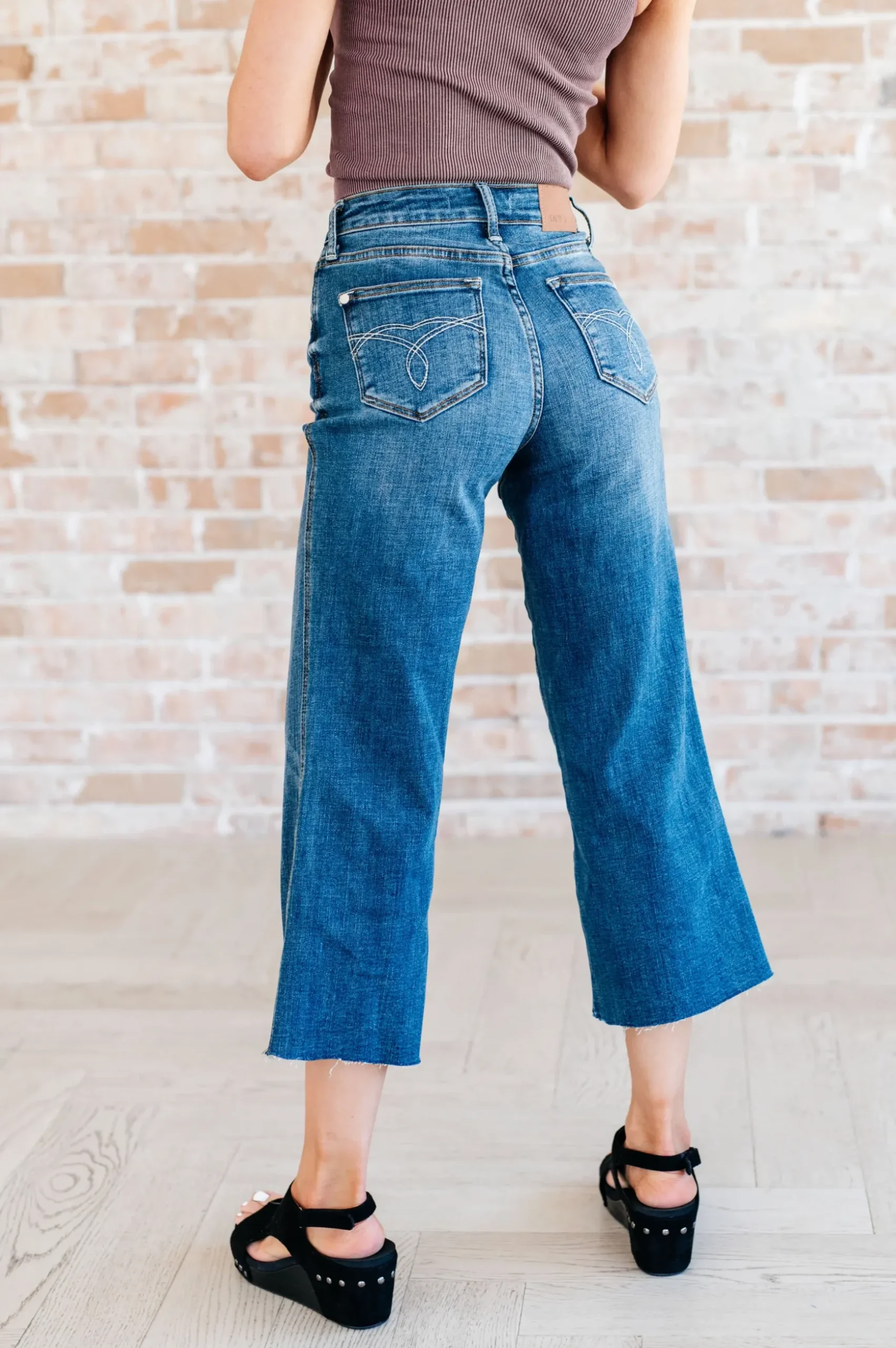 Discover effortless summer style with the Hayes High Rise Wide Leg Crop Jeans. This medium-wash denim is cut with a relaxed wide leg for a flattering, modern fit, embroidered accents, plus a cropped length and raw hem for a cool contemporary feel. With minimal distressing and a high-rise waist for the perfect silhouette, these jeans check all the boxes.