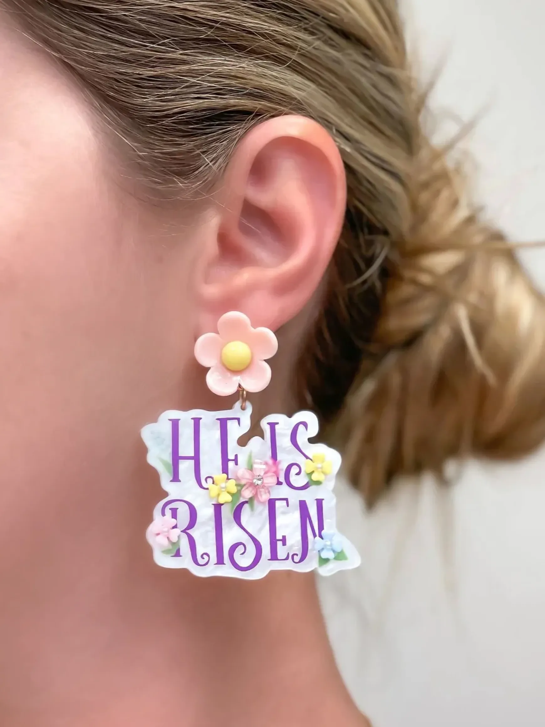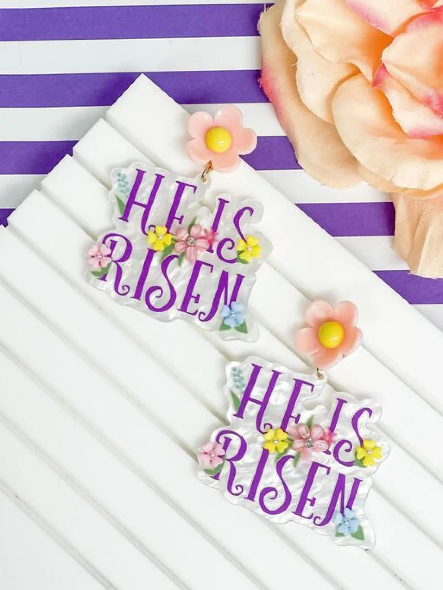 Celebrate Easter with these stunning ‘He Is Risen’ Acrylic Dangle Earrings. The perfect accessory to add a touch of faith-based elegance to your outfit.