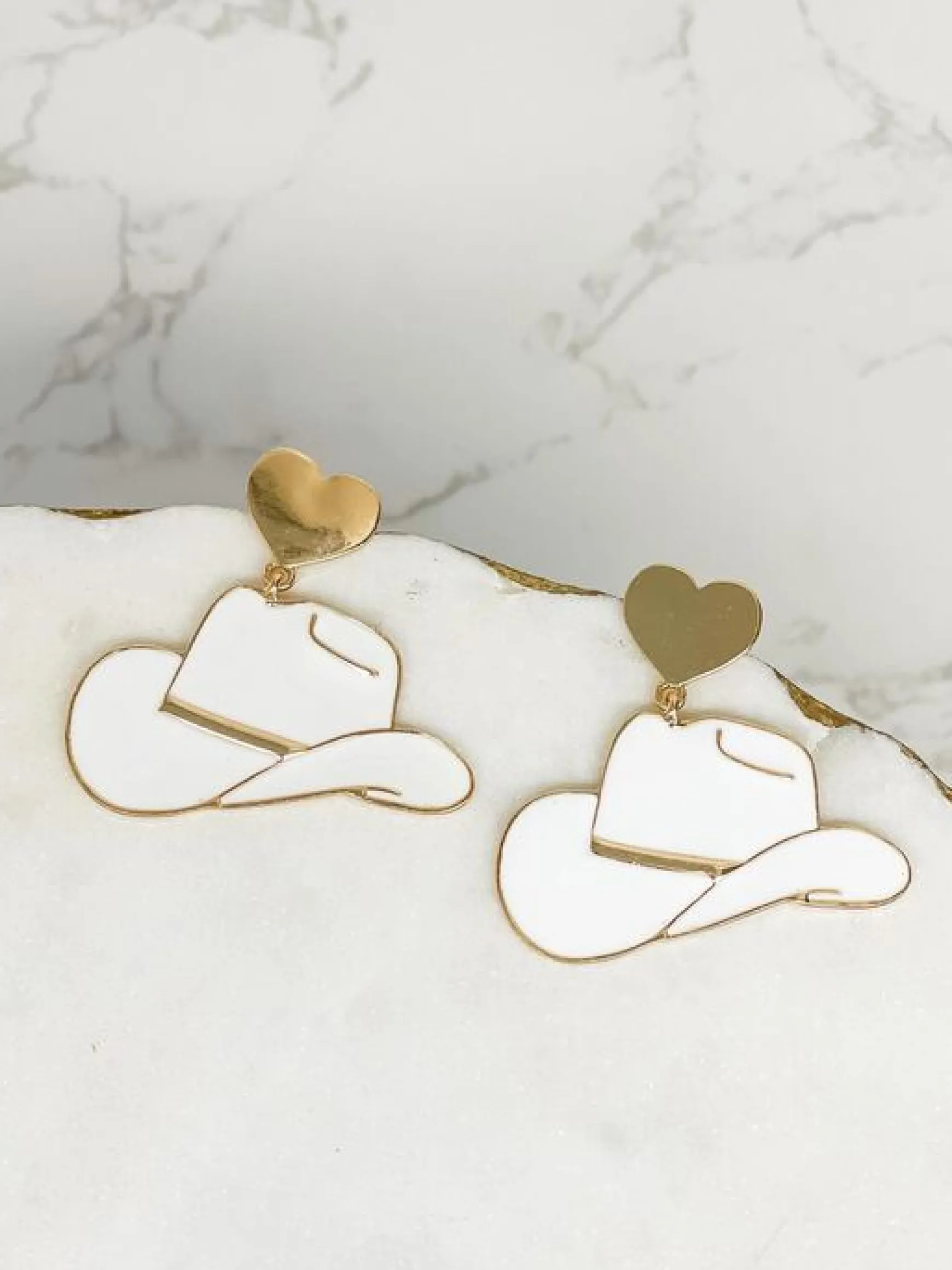 Heart Cowboy Hat Enamel Dangle Earrings – White