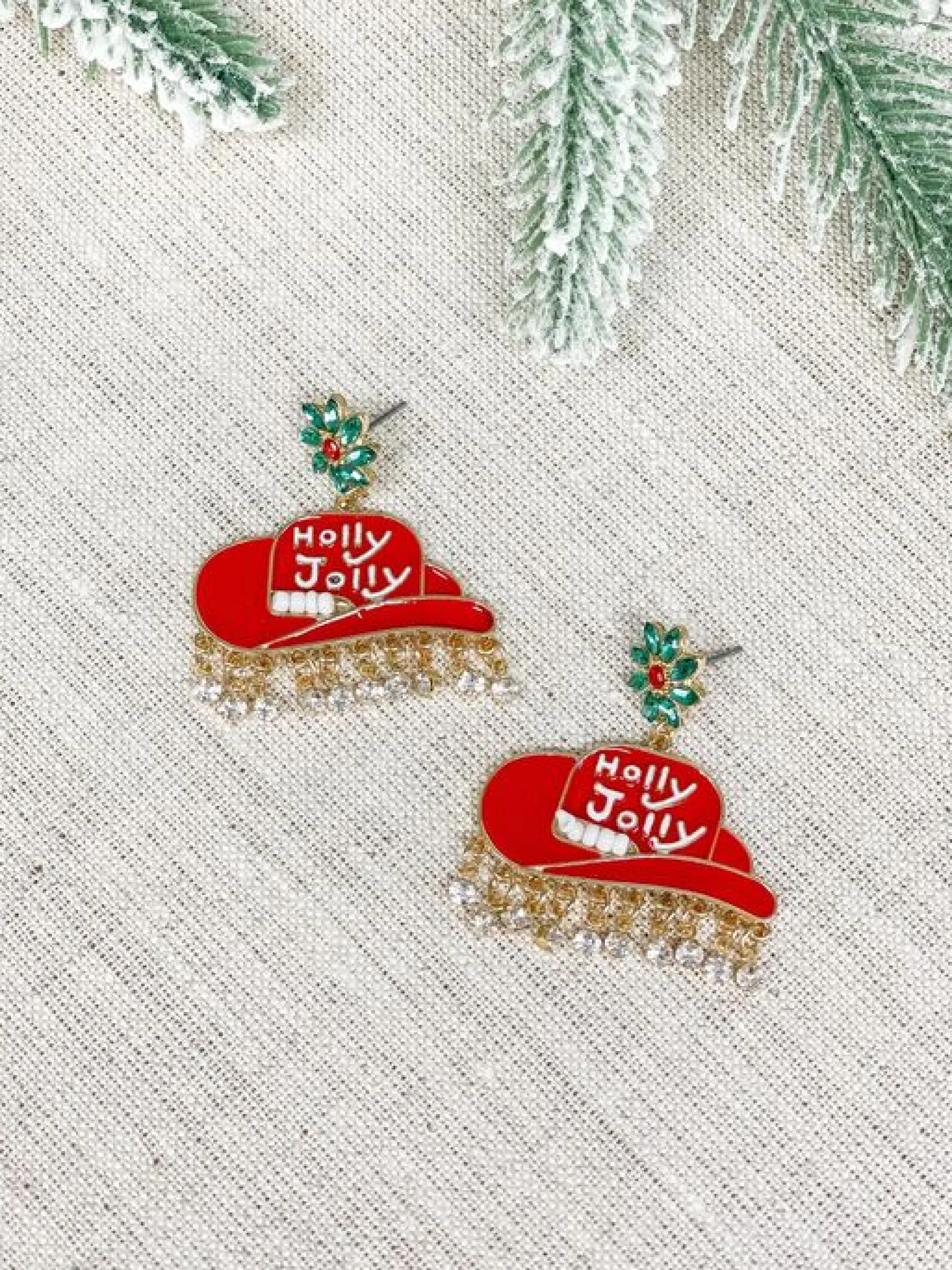 ‘Holly Jolly’ Cowgirl Hat Enamel Dangle Earrings