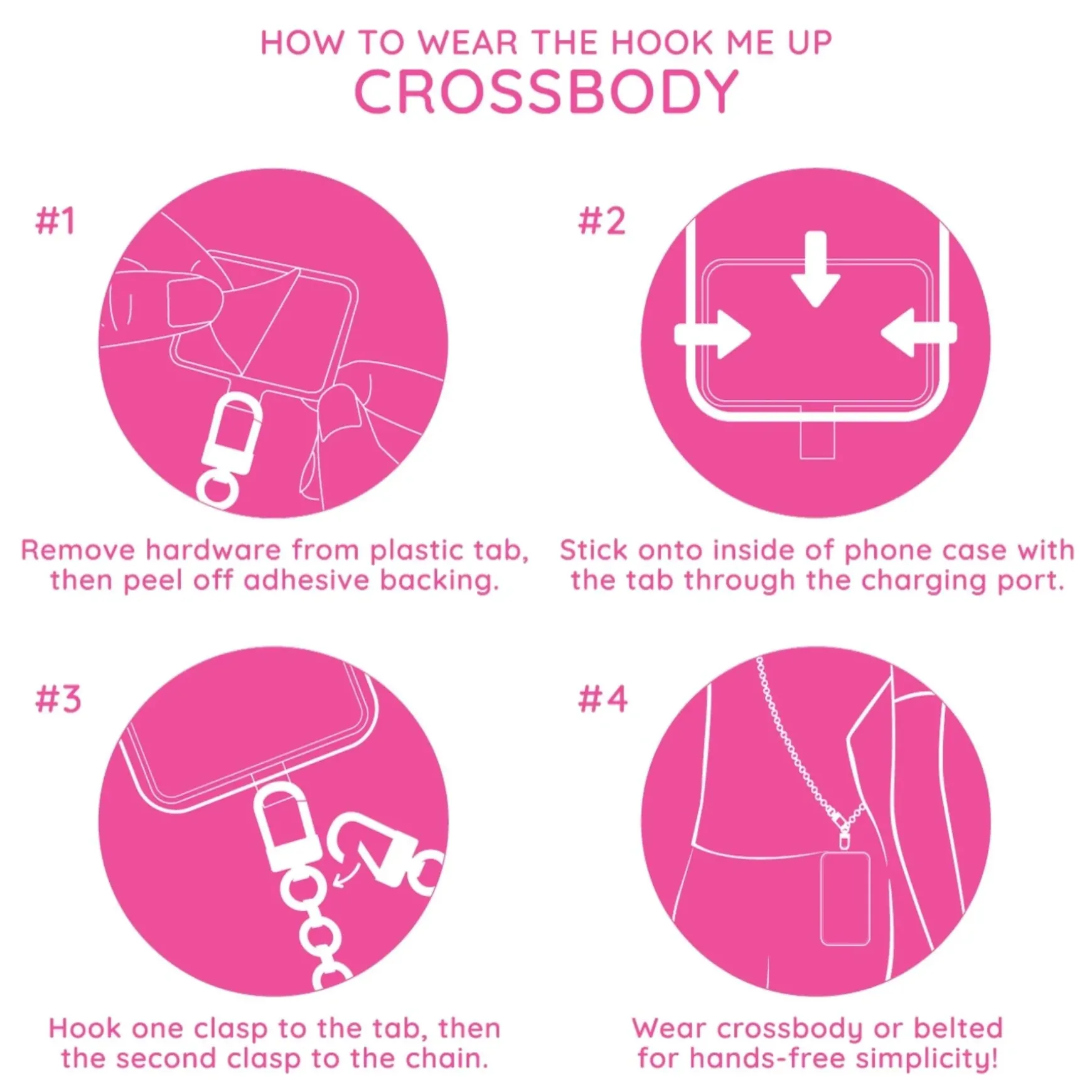 No matter the size, brand or style of your phone case, it can now be worn completely hands-free with The Hook Me Up Crossbody. This fan favorite style has a reinforced PVC base, ultra-strong adhesive, and unique swiveling mechanism so you can always catch a call (or leave it hanging) while wearing your essentials hands-free. Not only is The Hook Me Up Crossbody functional, durable, and oh so cute, it’s easy to use, too. Just peel it, stick it, clip it, and you’ve got a hands-free life hub!