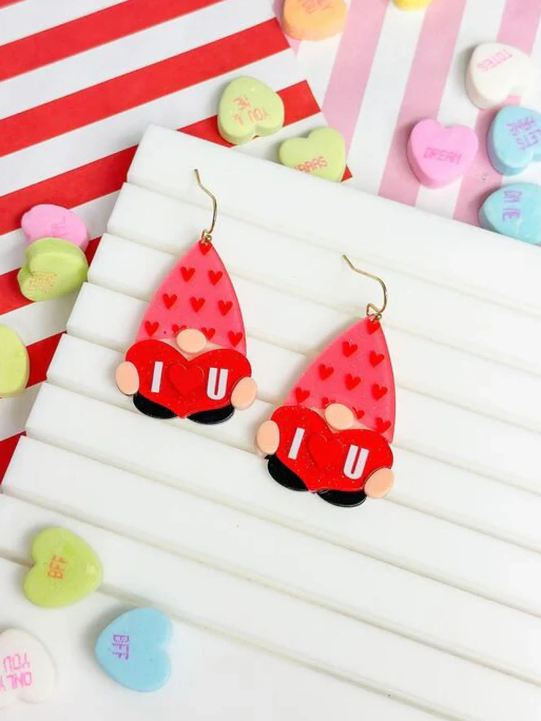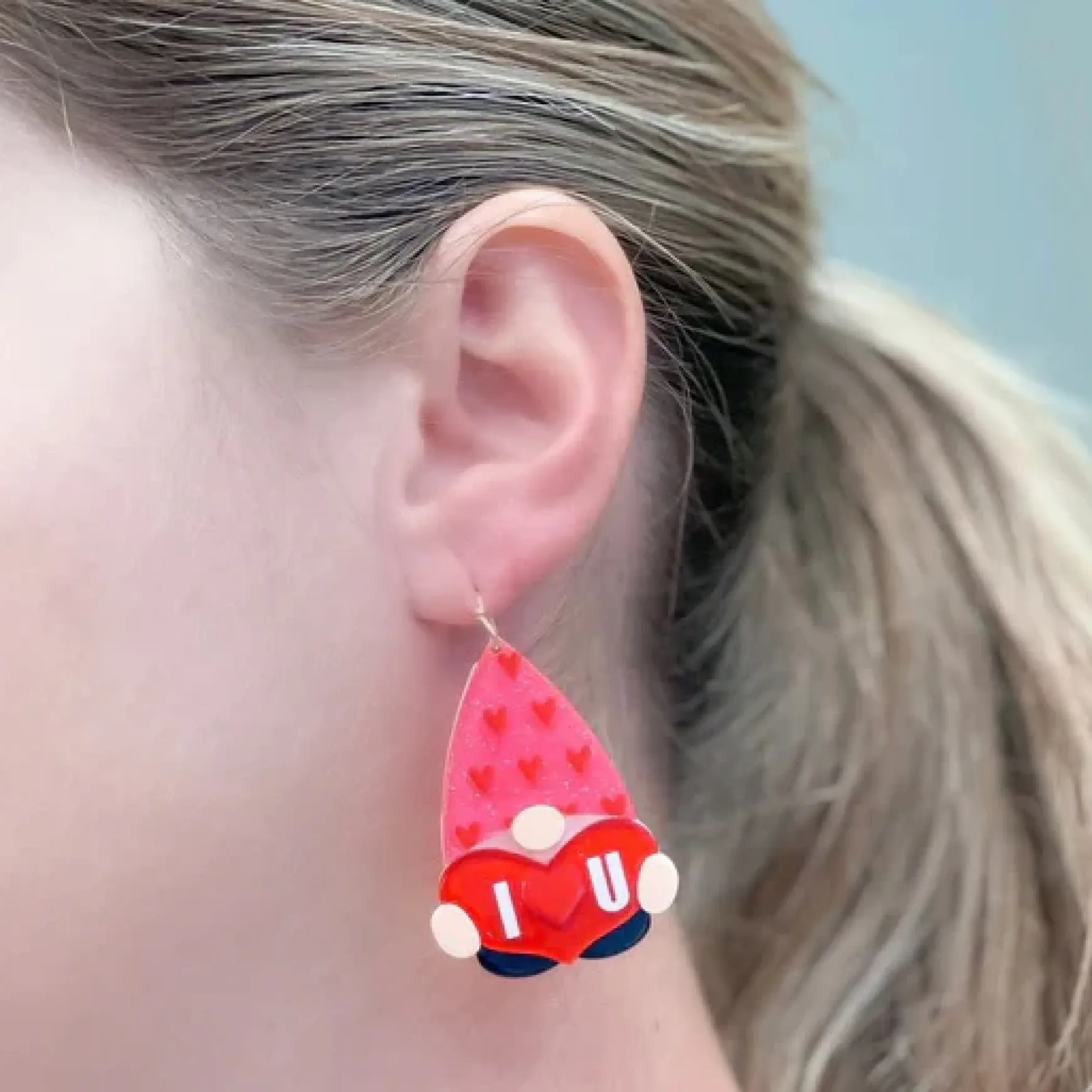 These charming ‘I Heart You’ Gnome Dangle Earrings feature a heart-shaped gnome design, adding a touch of whimsy to every outfit.