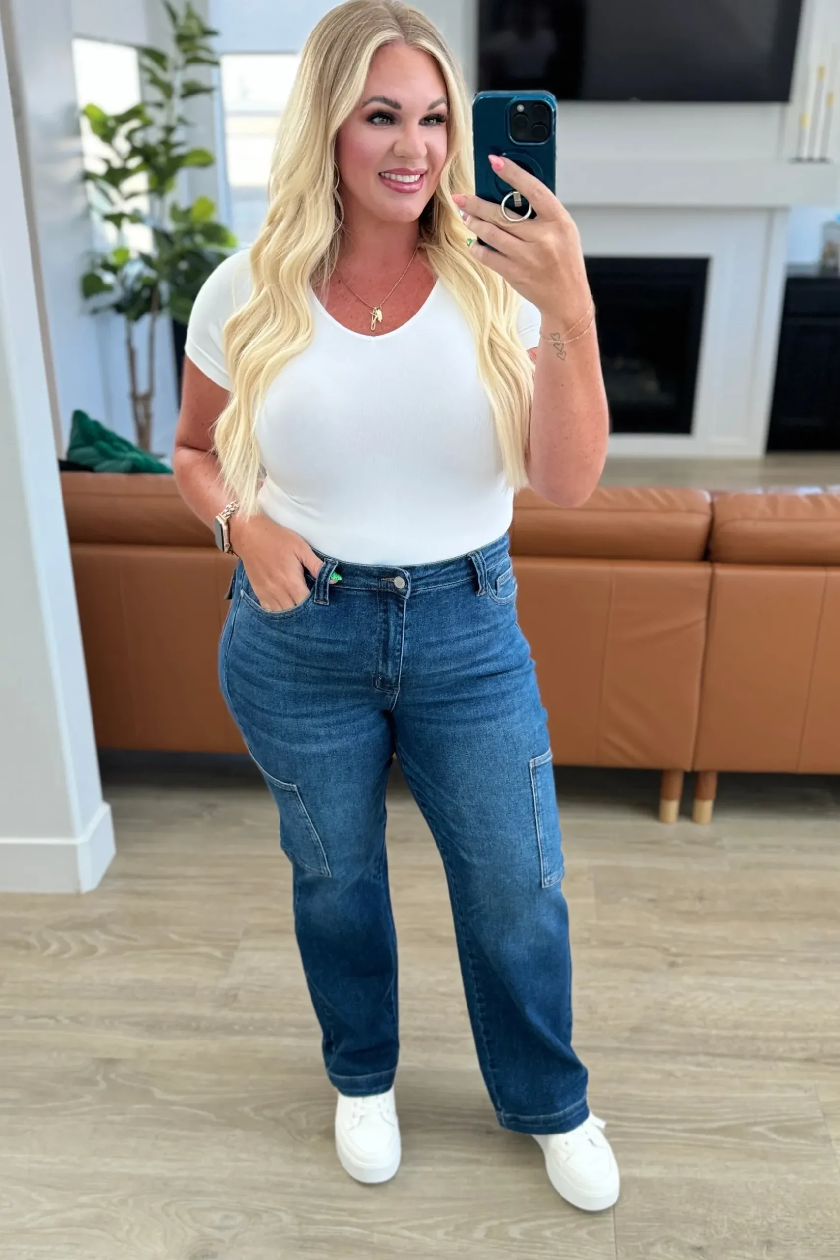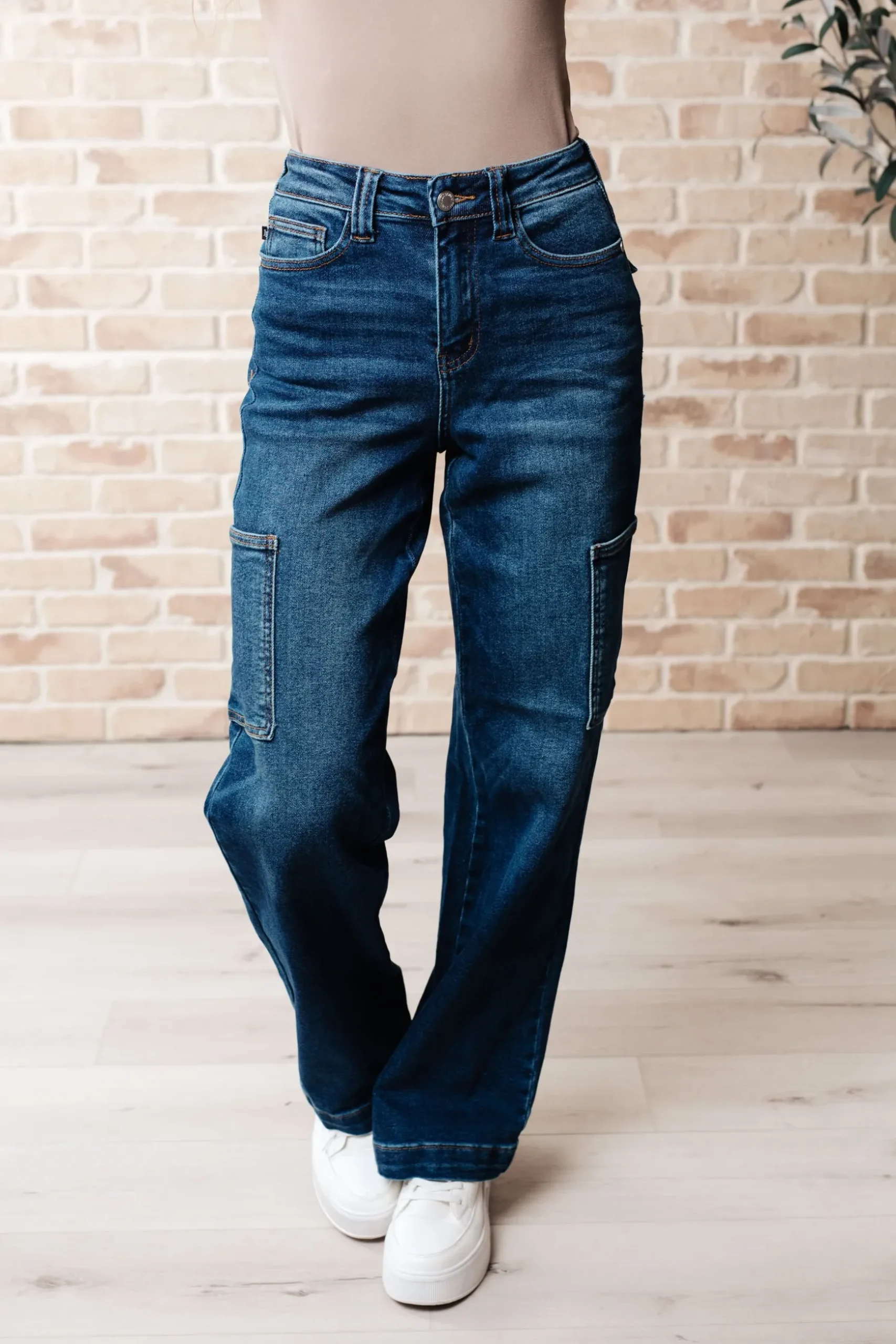 The Leila High Rise Cargo Straight Jeans feature a trendy high rise fit and versatile straight cut. The 4-way stretch fabric ensures a comfortable and flexible wear, while the non-distressed design offers a clean and polished look. With the addition of cargo pockets, these jeans are both practical and stylish. Upgrade your wardrobe with these must-have jeans.