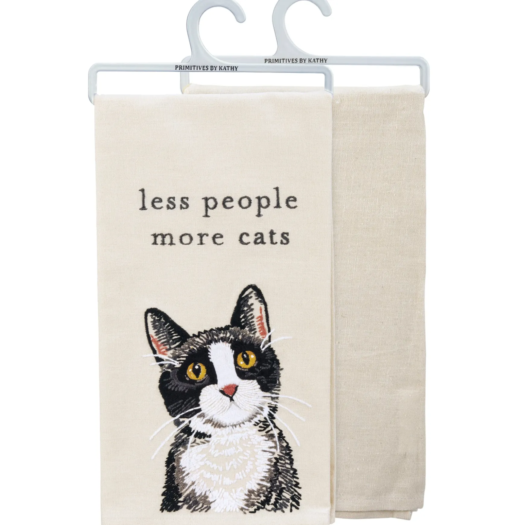 A cotton linen blend kitchen towel featuring an embroidered “Less People More Cats” sentiment and cat design. Machine-washable.