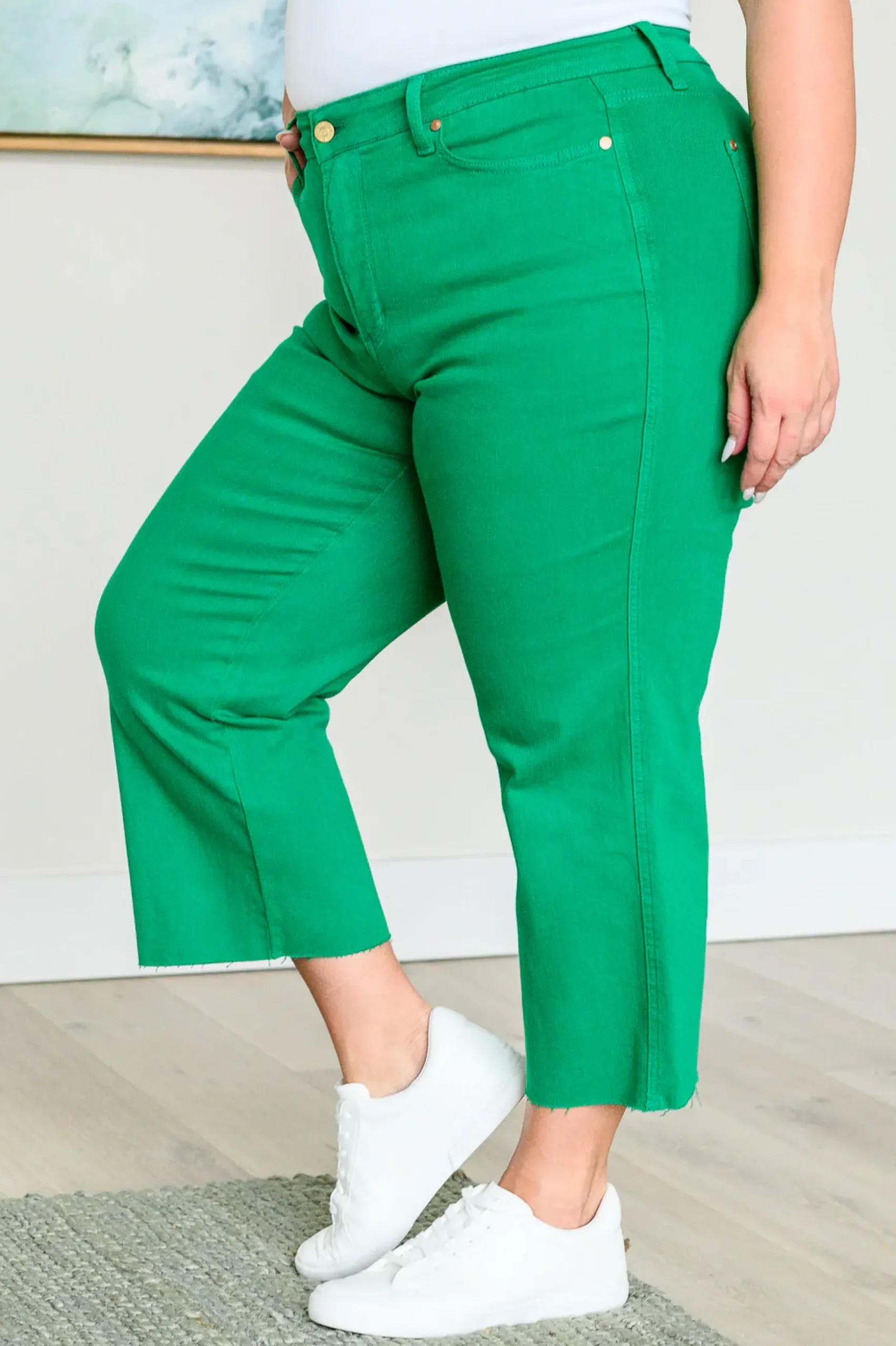 Slip into style and comfort with our Lisa High Rise Control Top Crop Jeans from Judy Blue. Featuring tummy control technology and 4-way stretch, these jeans provide a flattering fit. The wide leg crop and raw hem add trendy details, while the fun kelly green color will brighten up any outfit. Garment dyed for lasting color.