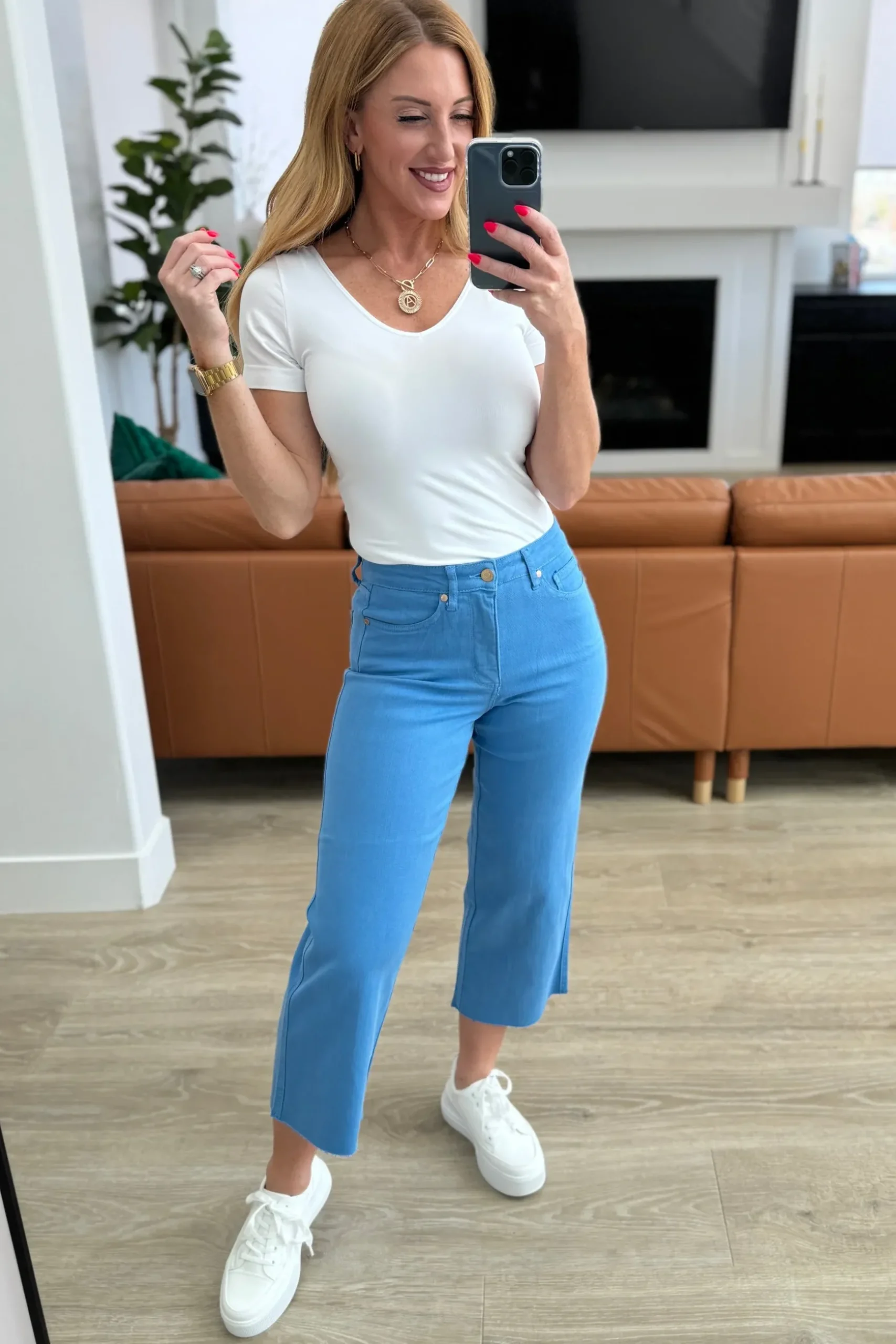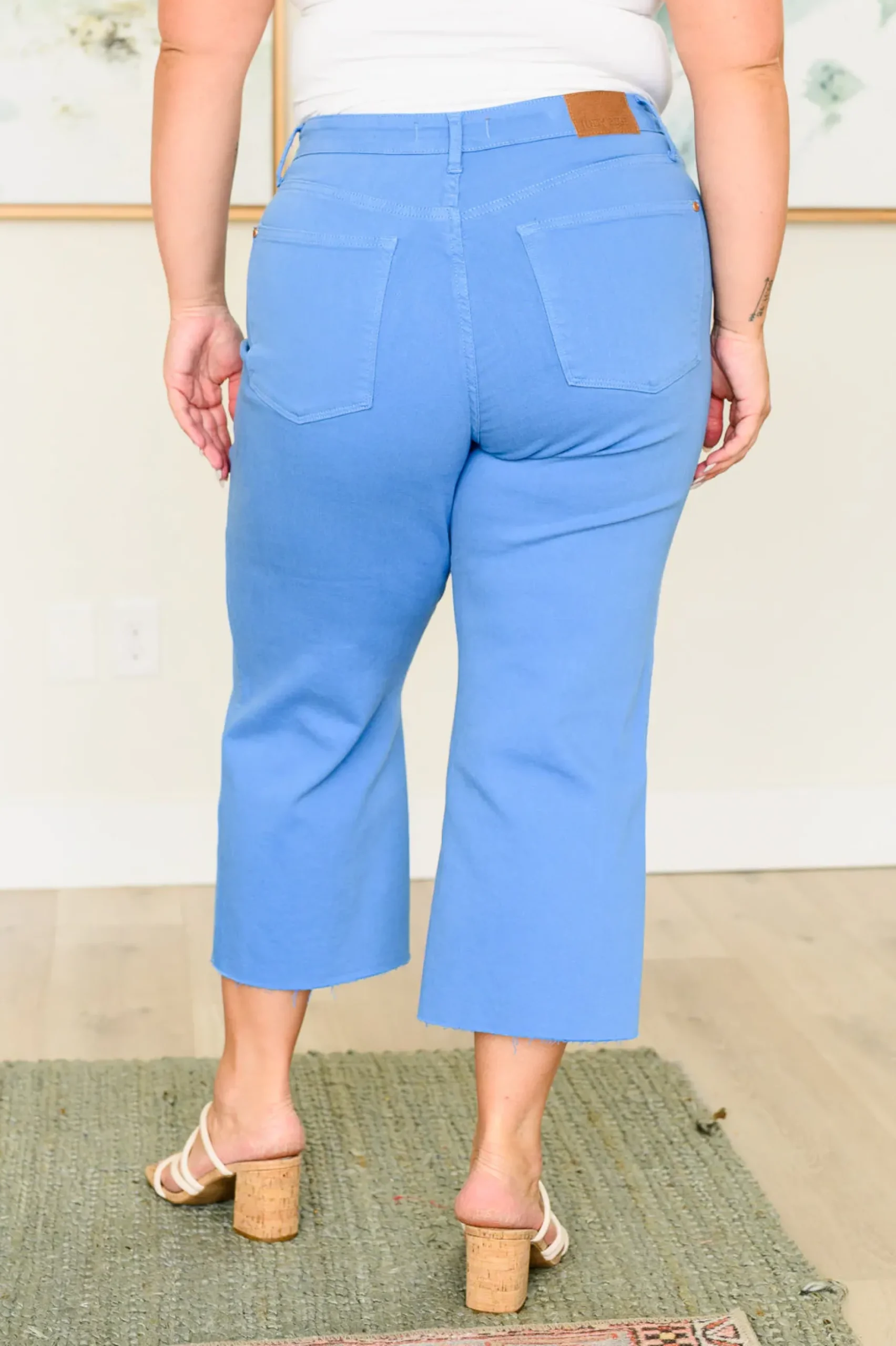 Slip into style and comfort with our Lisa High Rise Control Top Crop Jeans from Judy Blue. Featuring tummy control technology and 4-way stretch, these jeans provide a flattering fit. The wide leg crop and raw hem add trendy details, while the fun sky blue color will brighten up any outfit. Garment dyed for lasting color.