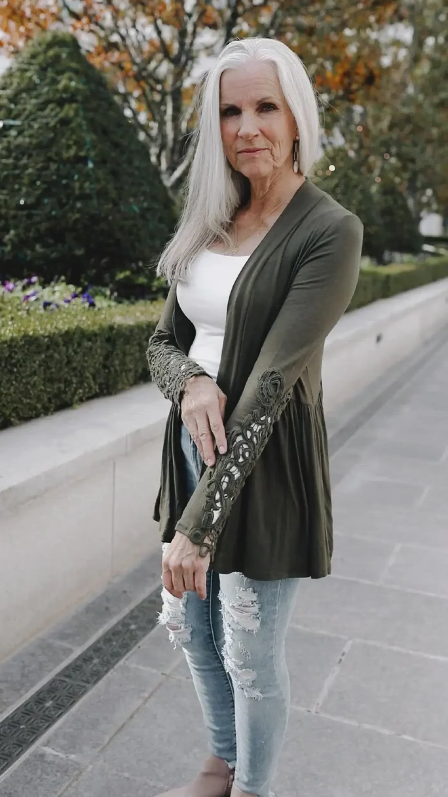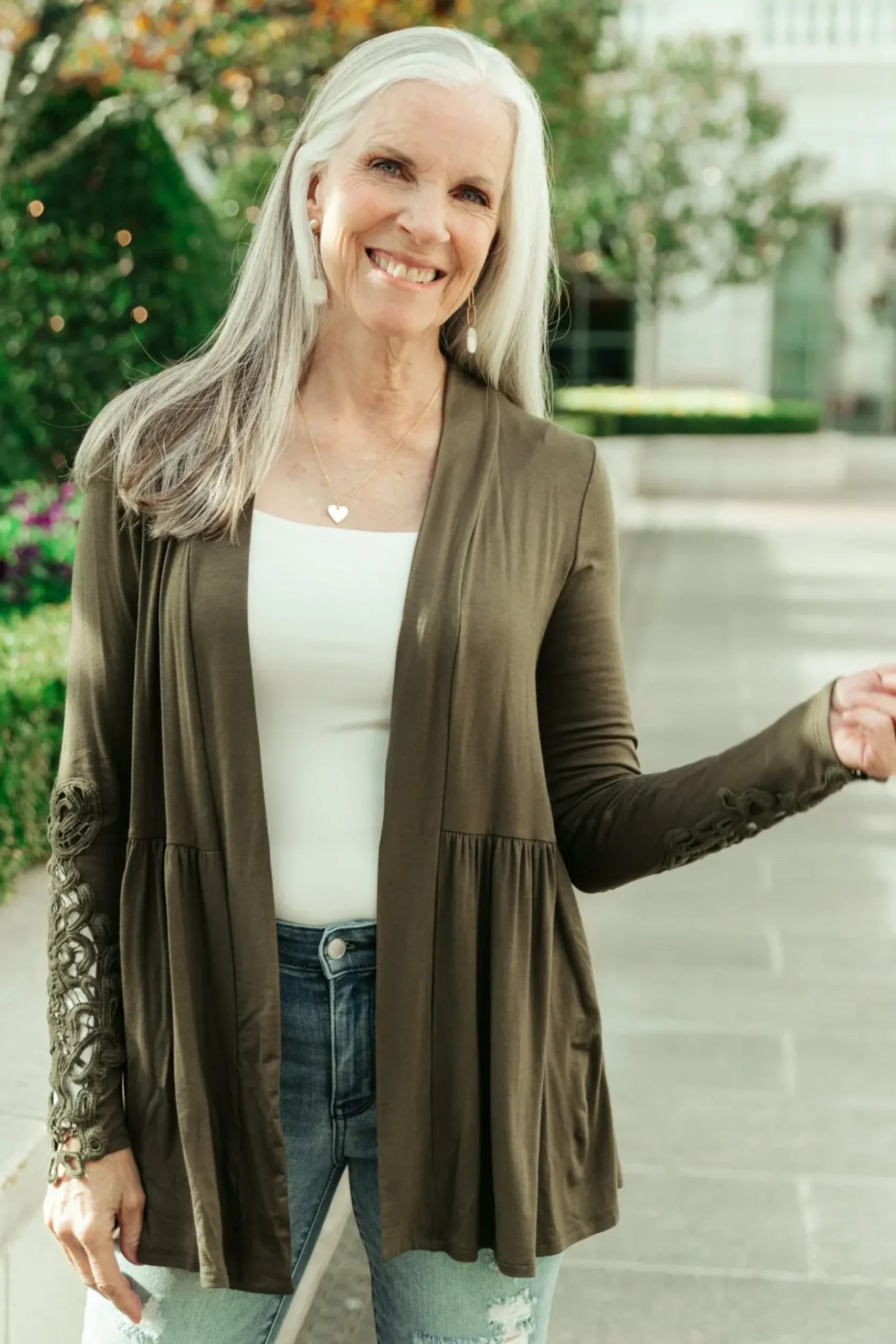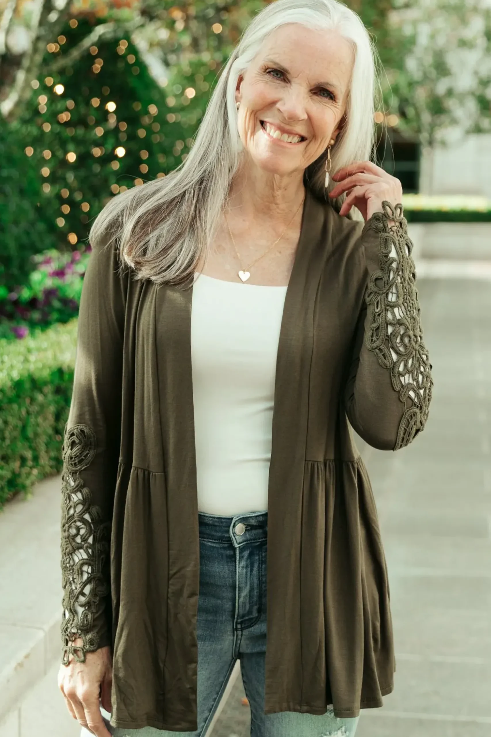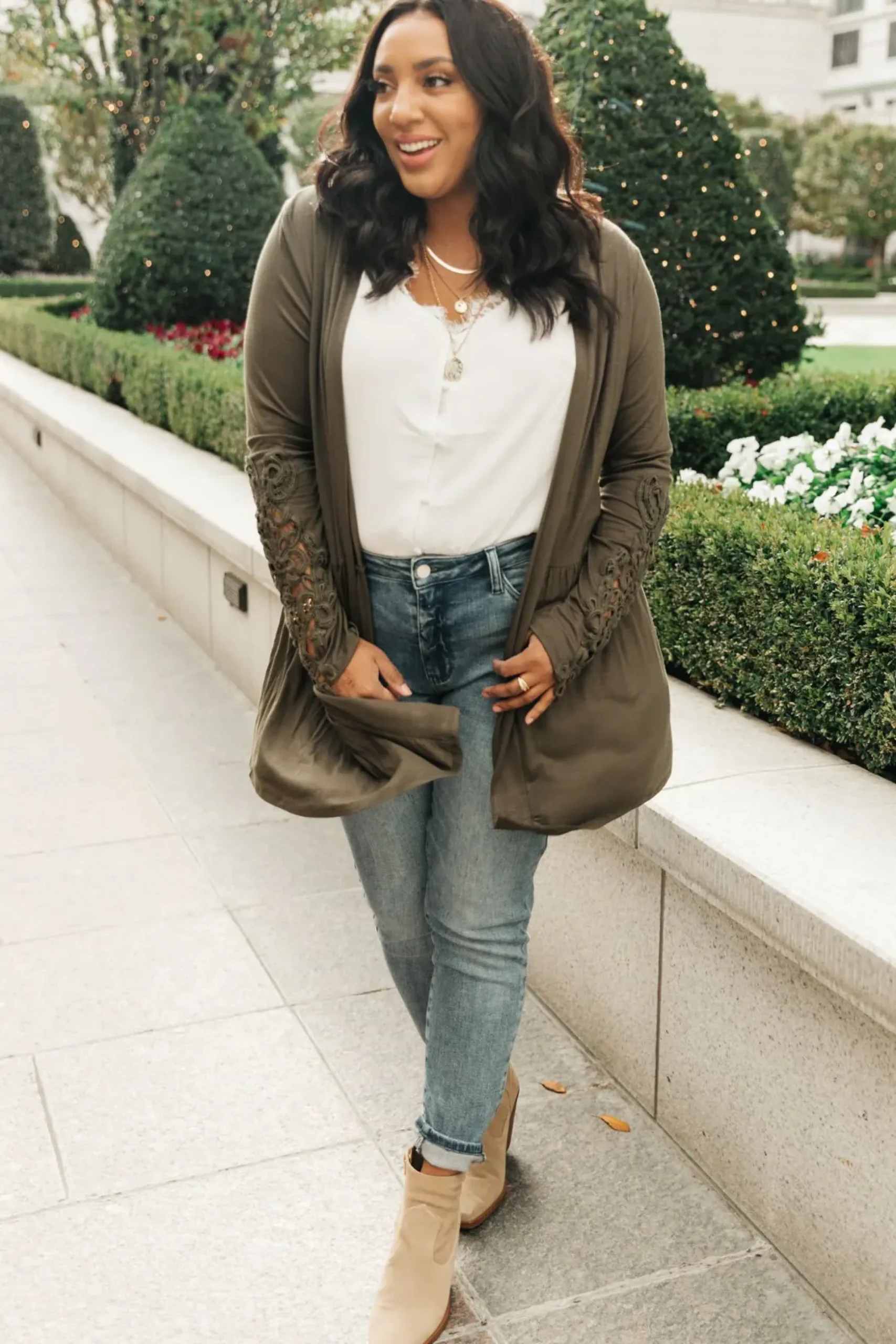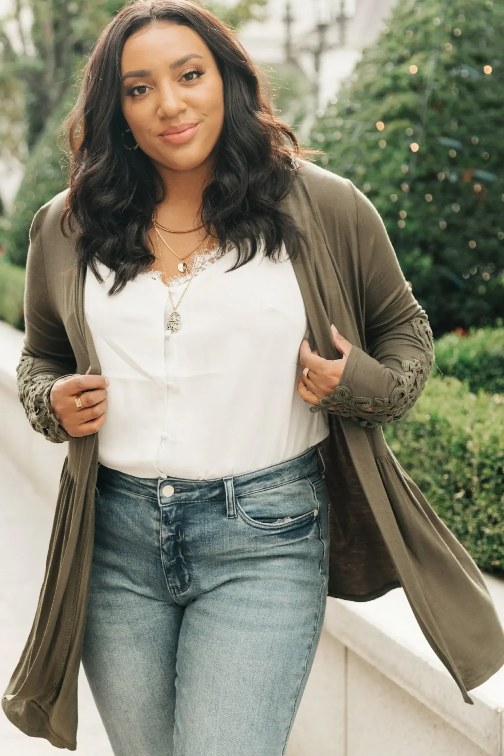 Flow through the seasons in style with the Little Bit Of Lace Cardigan In Olive! Lightweight and a comfortable mid length, lace detailed sleeve gives that extra flair. Pair with a bodysuit underneath and your favorite pair of jeans.