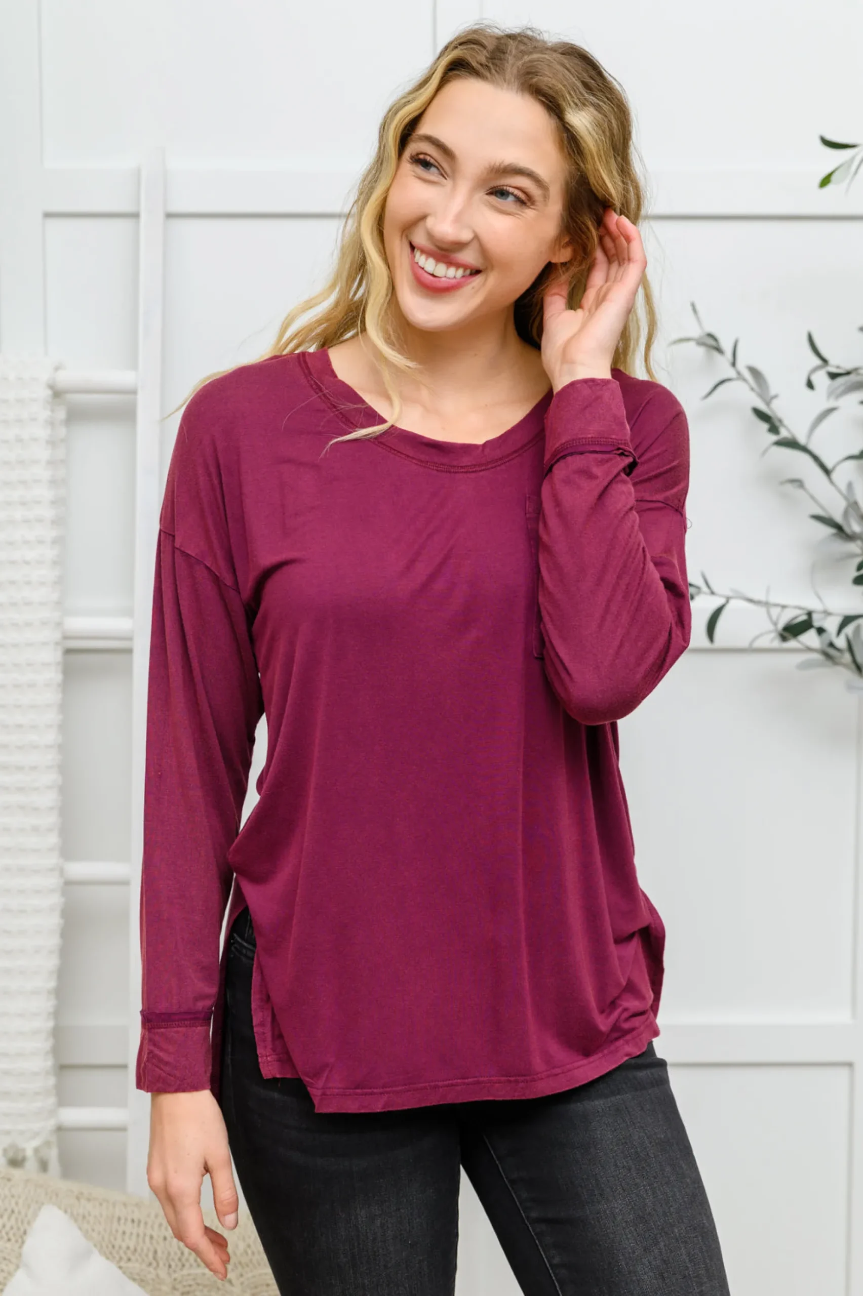 The Long Sleeve Knit Top with Pocket in Burgundy features a lightweight, stretchy fabric that shapes a round neckline with long sleeves, and a hi-low hem with side slits. A chest patch pocket decorates a loose fit bodice for a comfortable and stylish look.