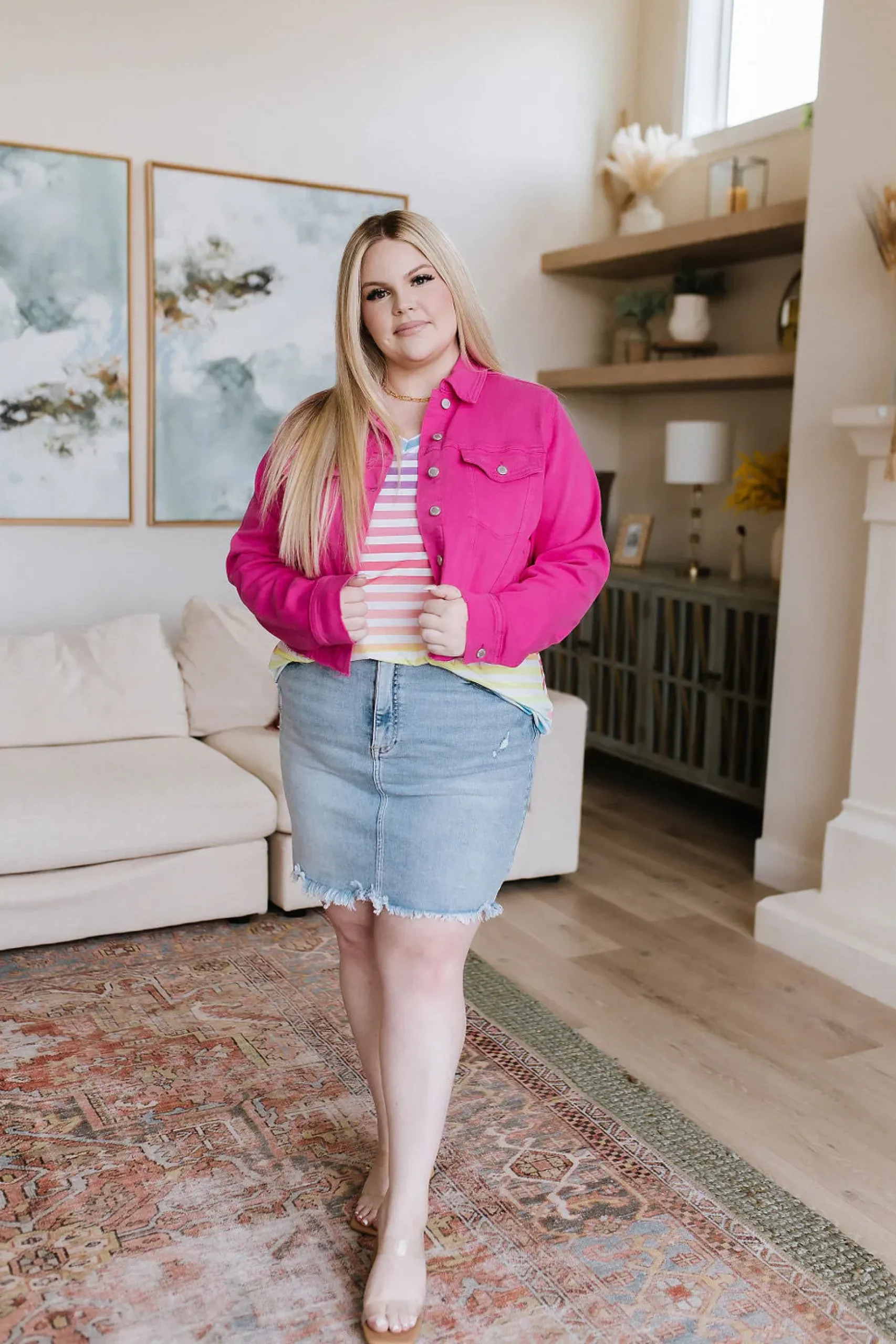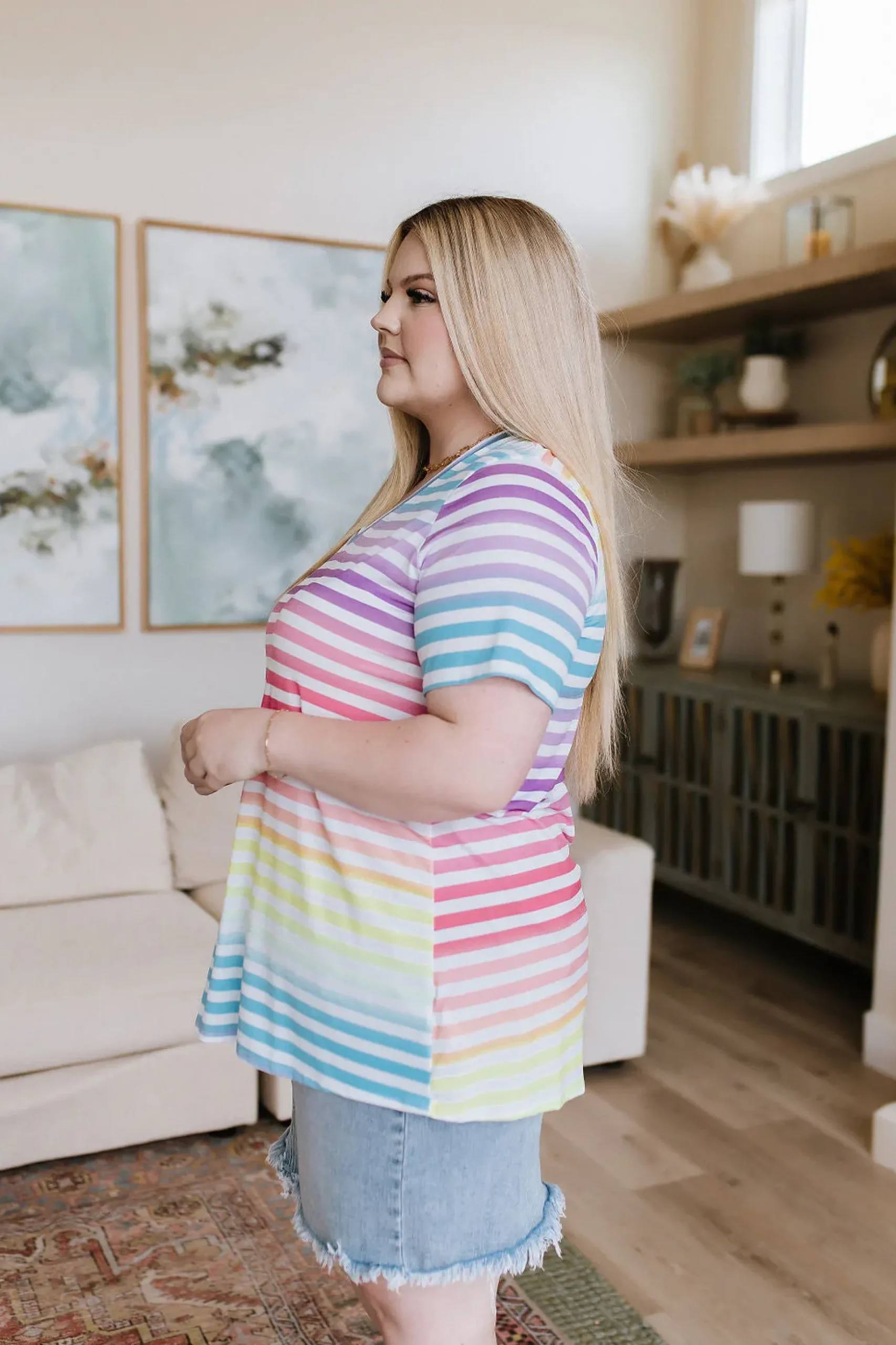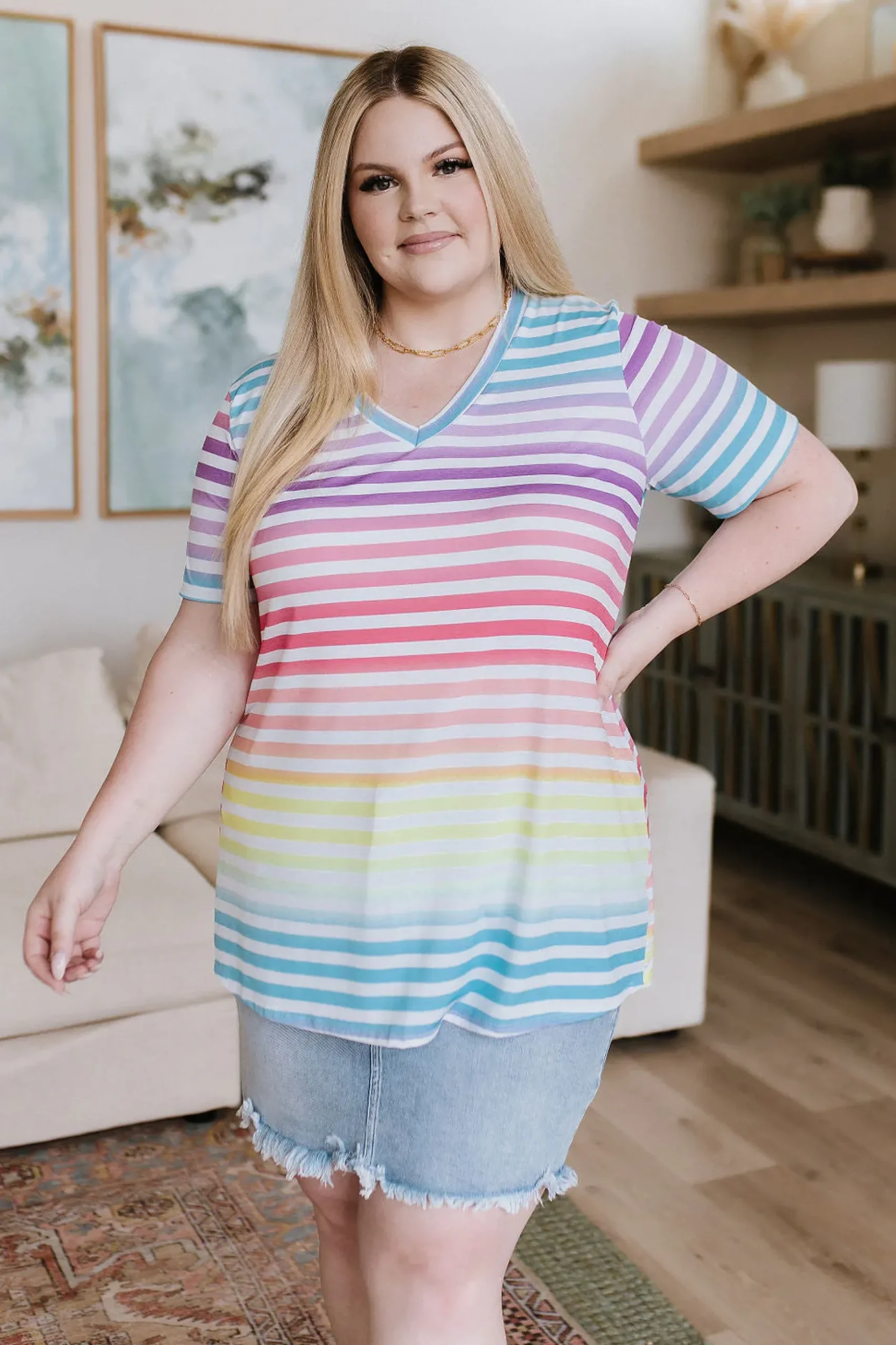 The Looking for Rainbows V-Neck Striped Top is the perfect choice for those looking for an effortless, stylish look. Lightweight, Wrinkle Free, Soft fabric offers all-day comfort, while a relaxed fit and casual v-neckline provide a flattering, modern silhouette. Completing the look with a burst of color with the ombre rainbow stripe design. Ready for a rainbowful day?