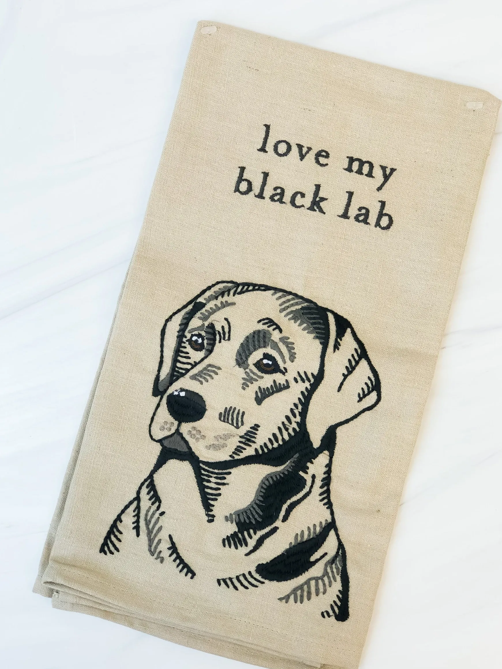A cotton linen blend dish towel lending a “Love My Black Lab” sentiment with fully embroidered black lab portrait design. Machine-washable. Complements well with other pieces in collection to create a cohesive display!
