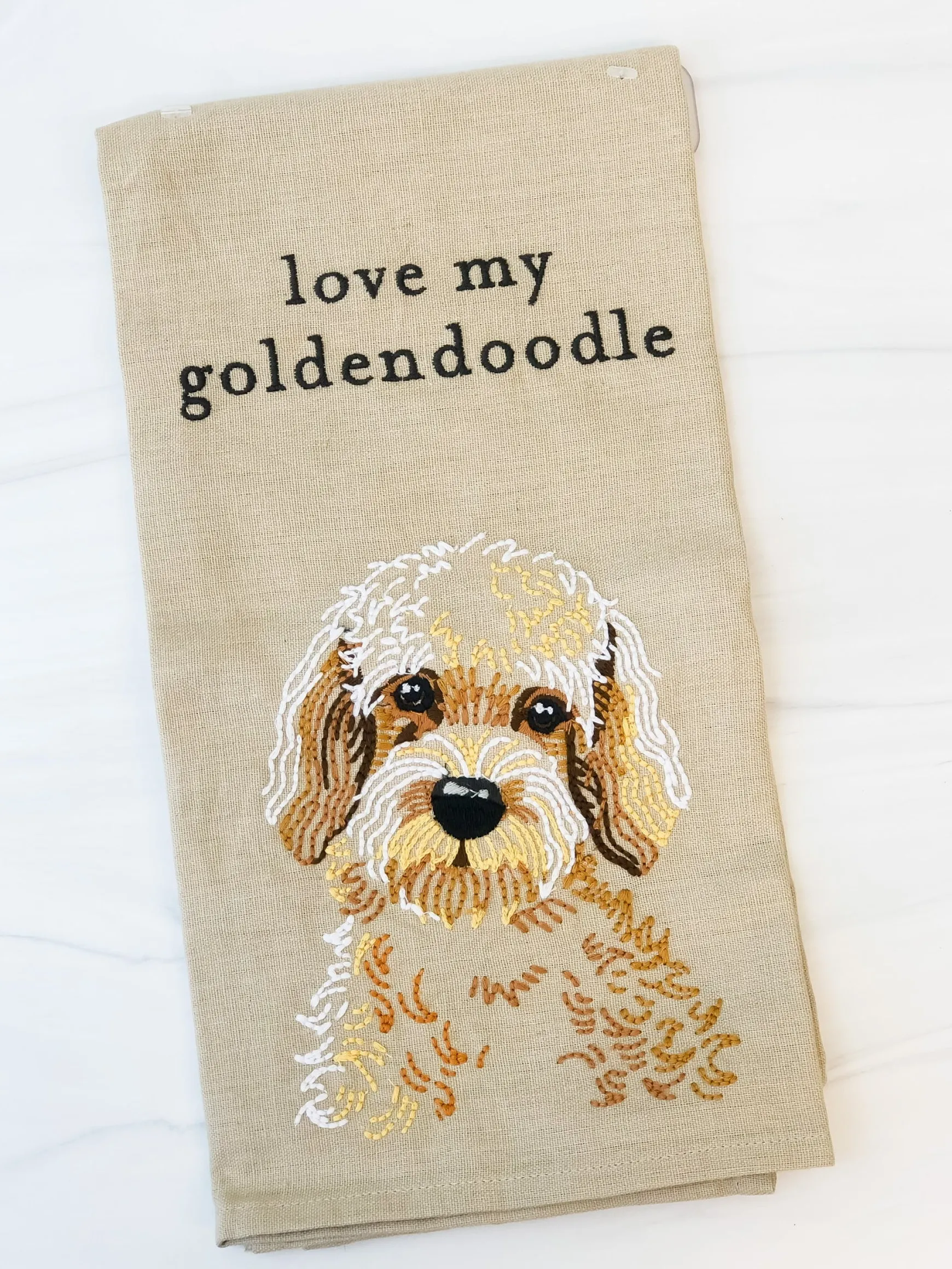 A cotton linen blend dish towel lending a “Love My Goldendoodle” sentiment with fully embroidered goldendoodle portrait design. Machine-washable. Complements well with other pieces in collection to create a cohesive display!