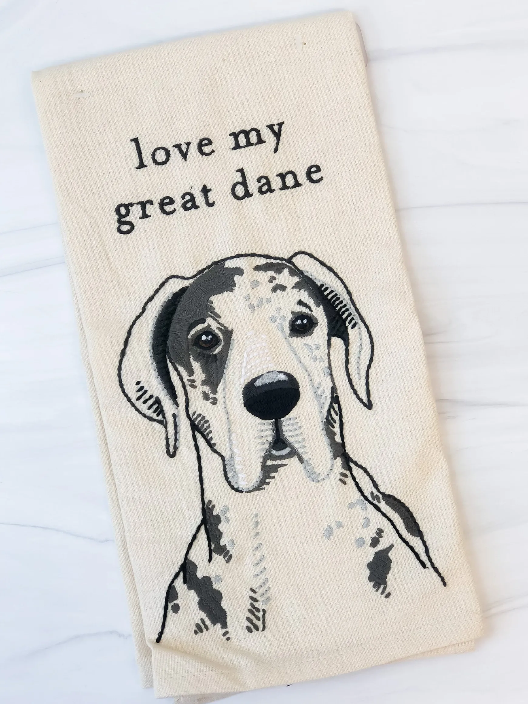 A cotton linen blend dish towel lending a “Love My Great Dane” sentiment with fully embroidered great dane portrait design. Machine-washable. Complements well with other pieces in collection to create a cohesive display!