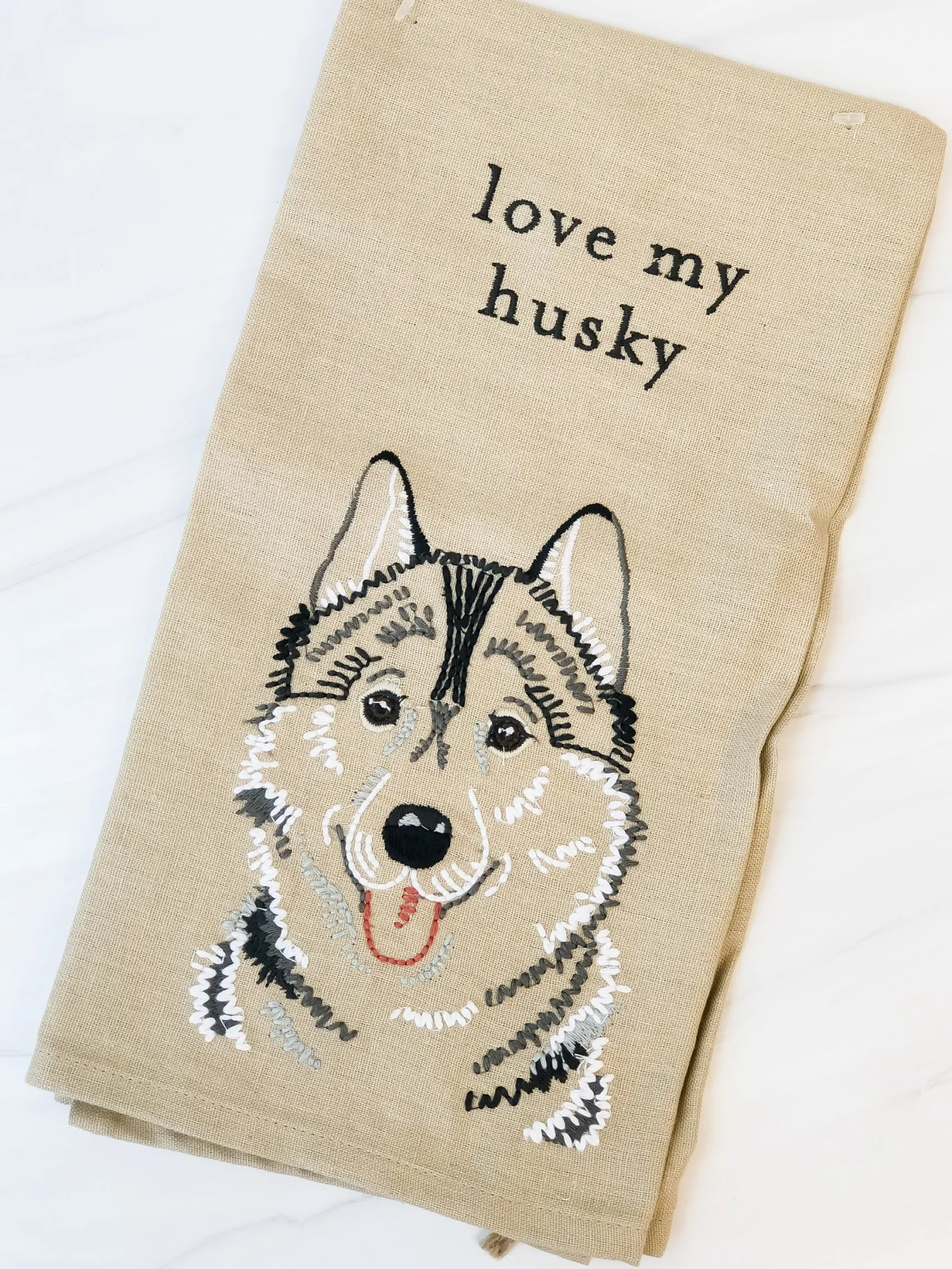 A cotton linen blend dish towel lending a “Love My Husky” sentiment with fully embroidered husky portrait design. Machine-washable. Complements well with other pieces in collection to create a cohesive display!