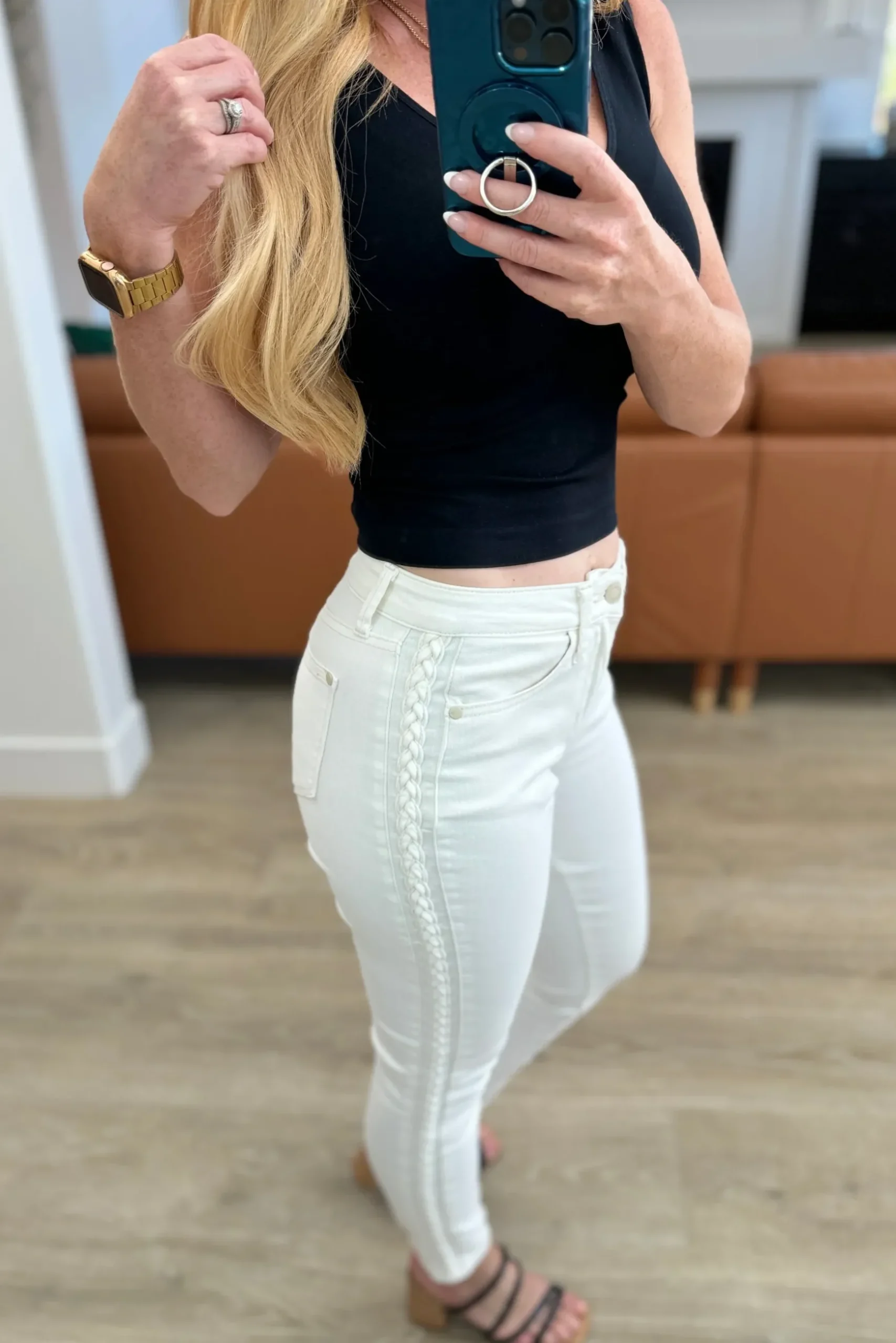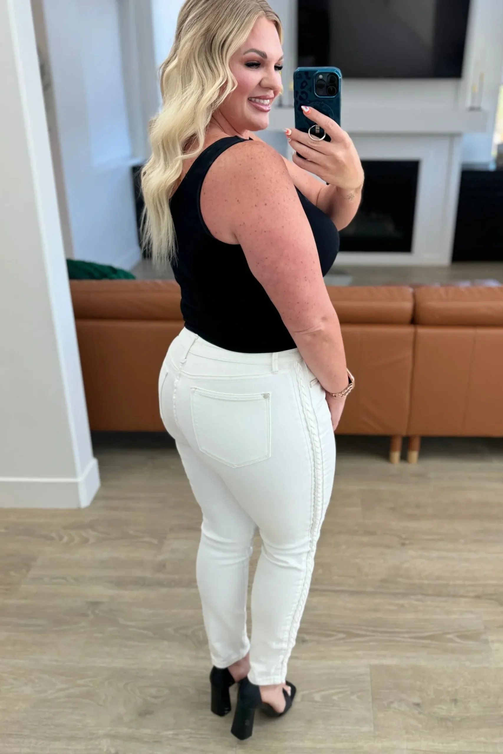 Introducing Maddie Mid Rise Jeans from Judy Blue – the perfect blend of comfort and style. Made with crisp off-white denim and a relaxed fit, these jeans offer 4-way stretch for ultimate comfort. The unique braided side seam detail adds a touch of flair to any outfit.