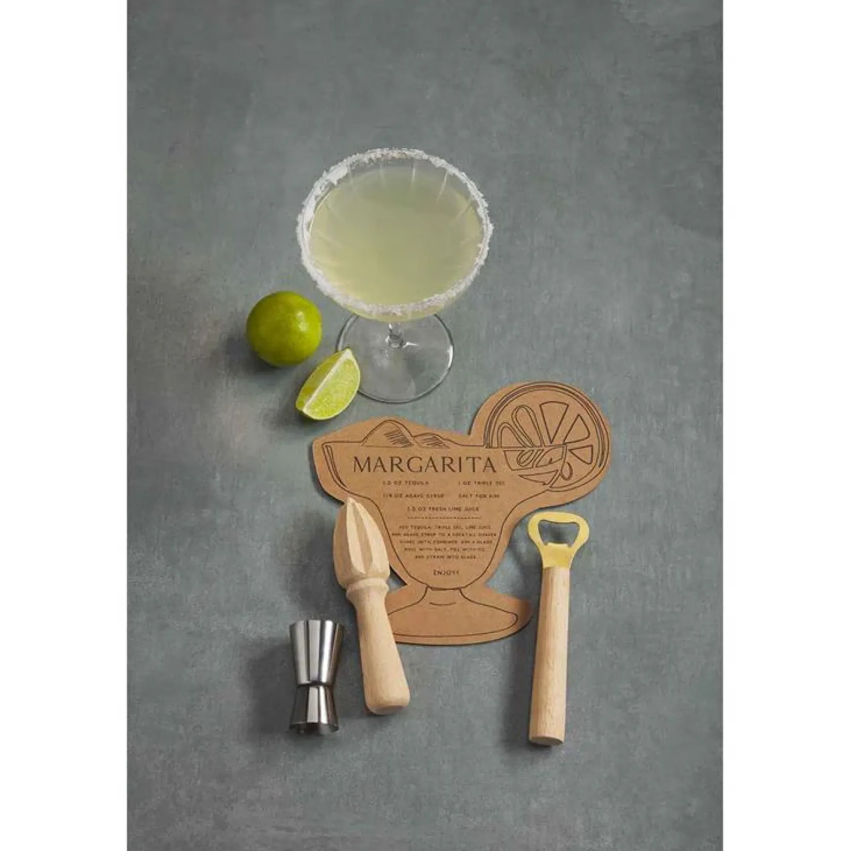 3-piece set: wooden juicer, stainless steel jigger and wood and brass finished bottle opener comes on kraft margarita recipe display card