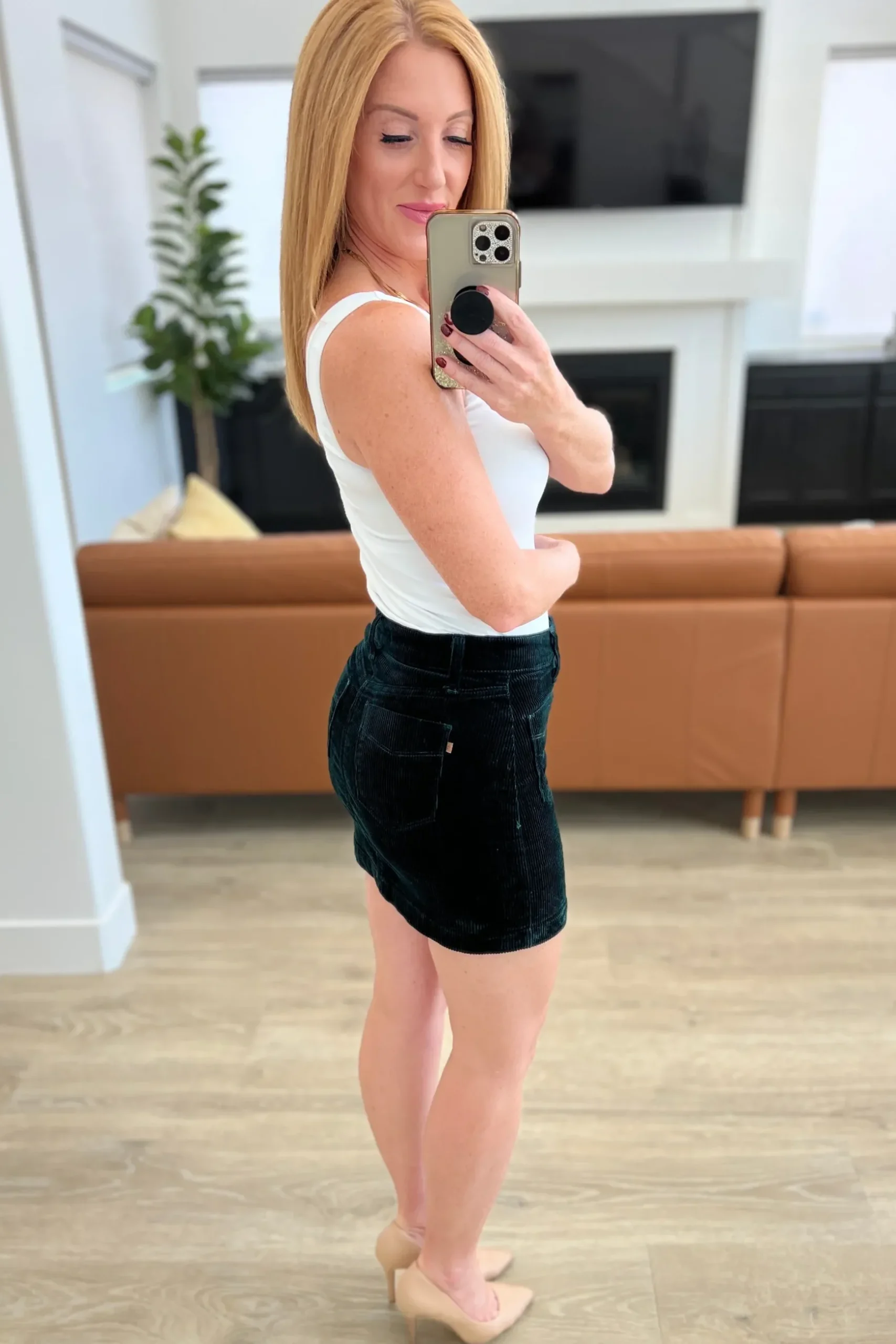 Create a timeless look with the Melinda Corduroy Patch Pocket Skirt from Judy Blue. Crafted with a classic tailored fit from mid weight corduroy, this dark emerald skirt features stylish patch pockets and a flattering silhouette. Look timeless and feel amazing!