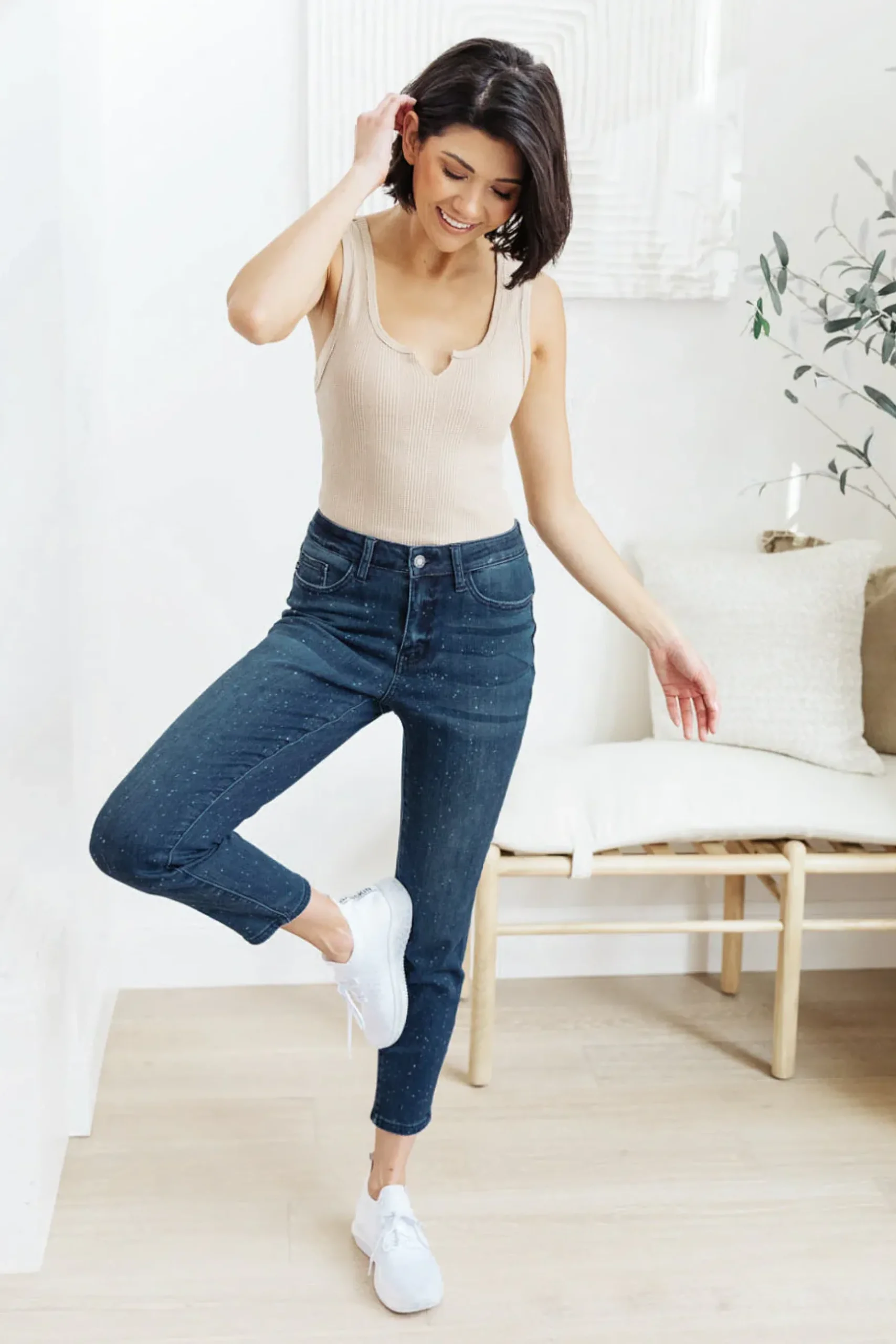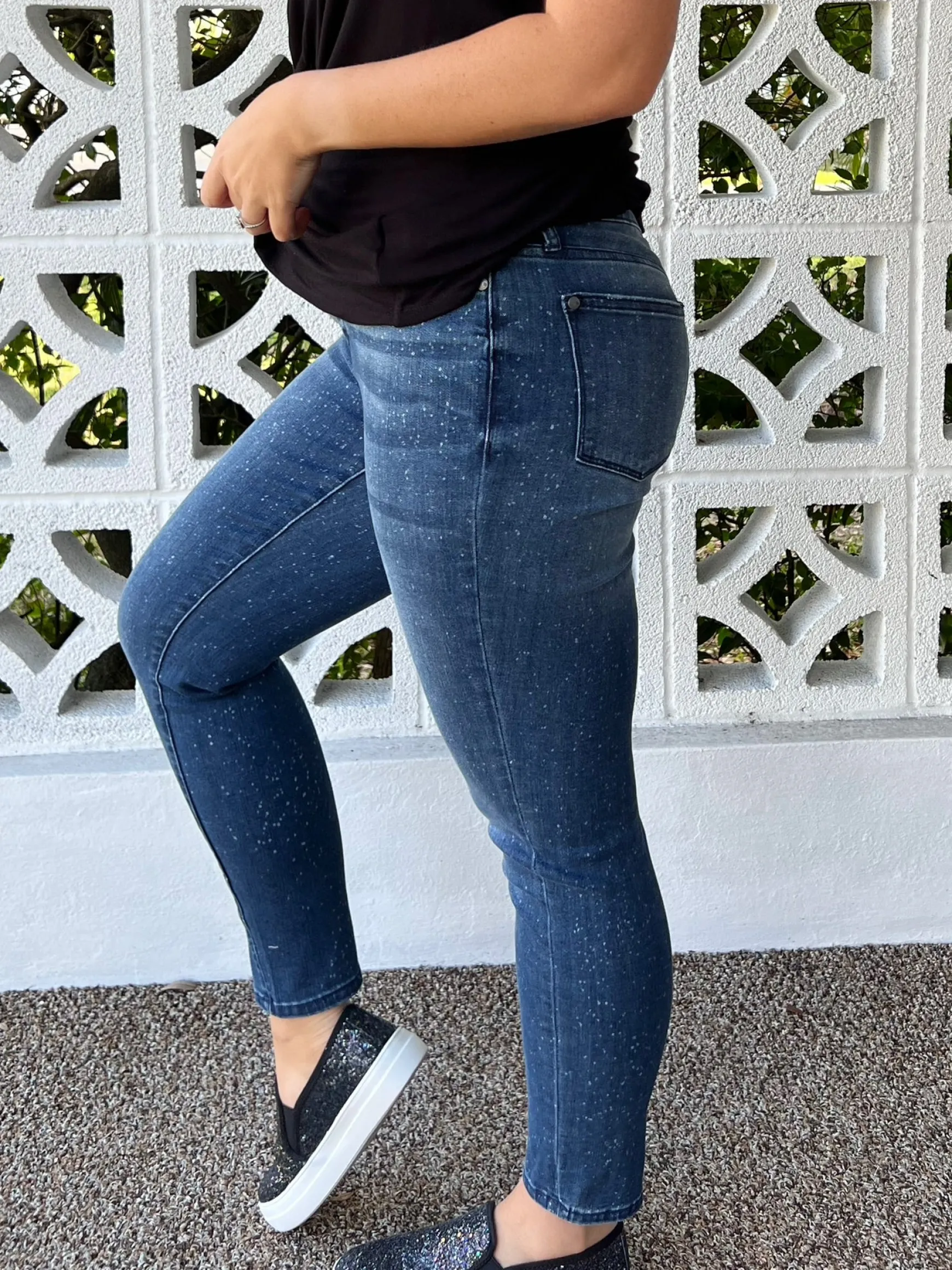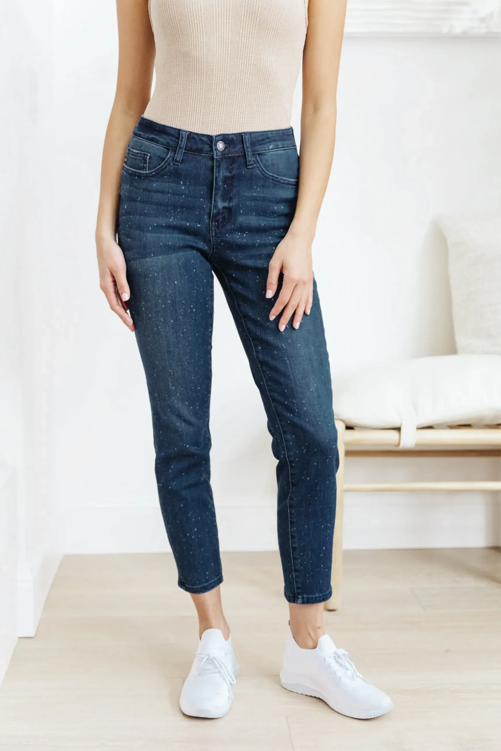 A perfect everyday jean with an added twist. The Mid-Rise Relaxed Fit Mineral Wash Jeans are a dark wash, ankle length skinny jean, painted in a subtle bleach splatter all throughout. We love adding these jeans to any outfit to add an extra splash of fun!