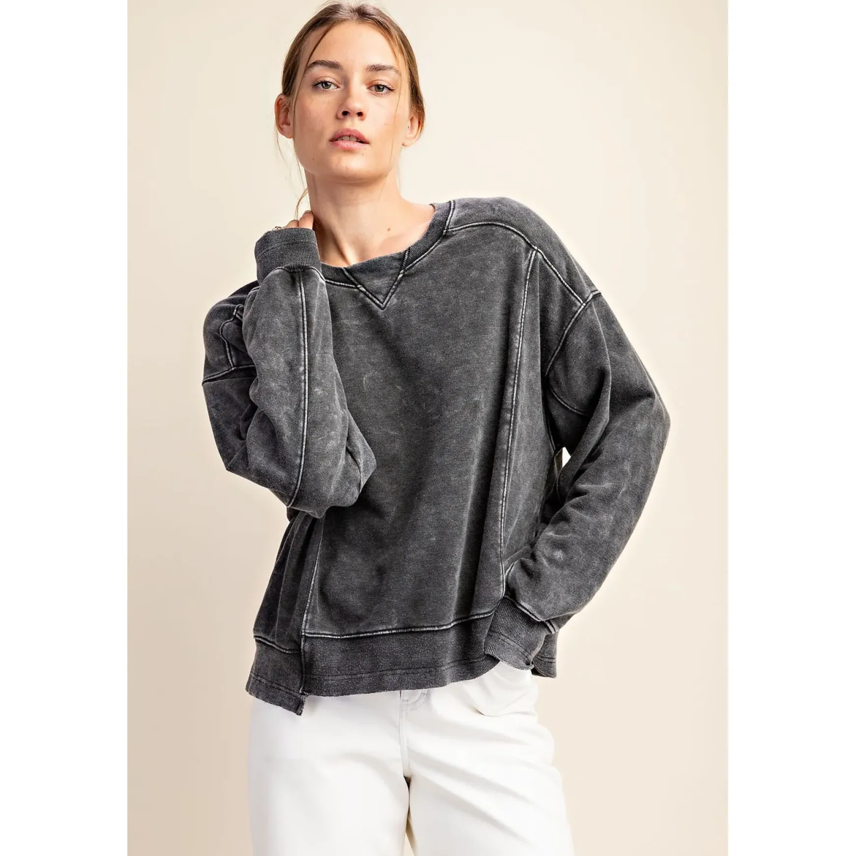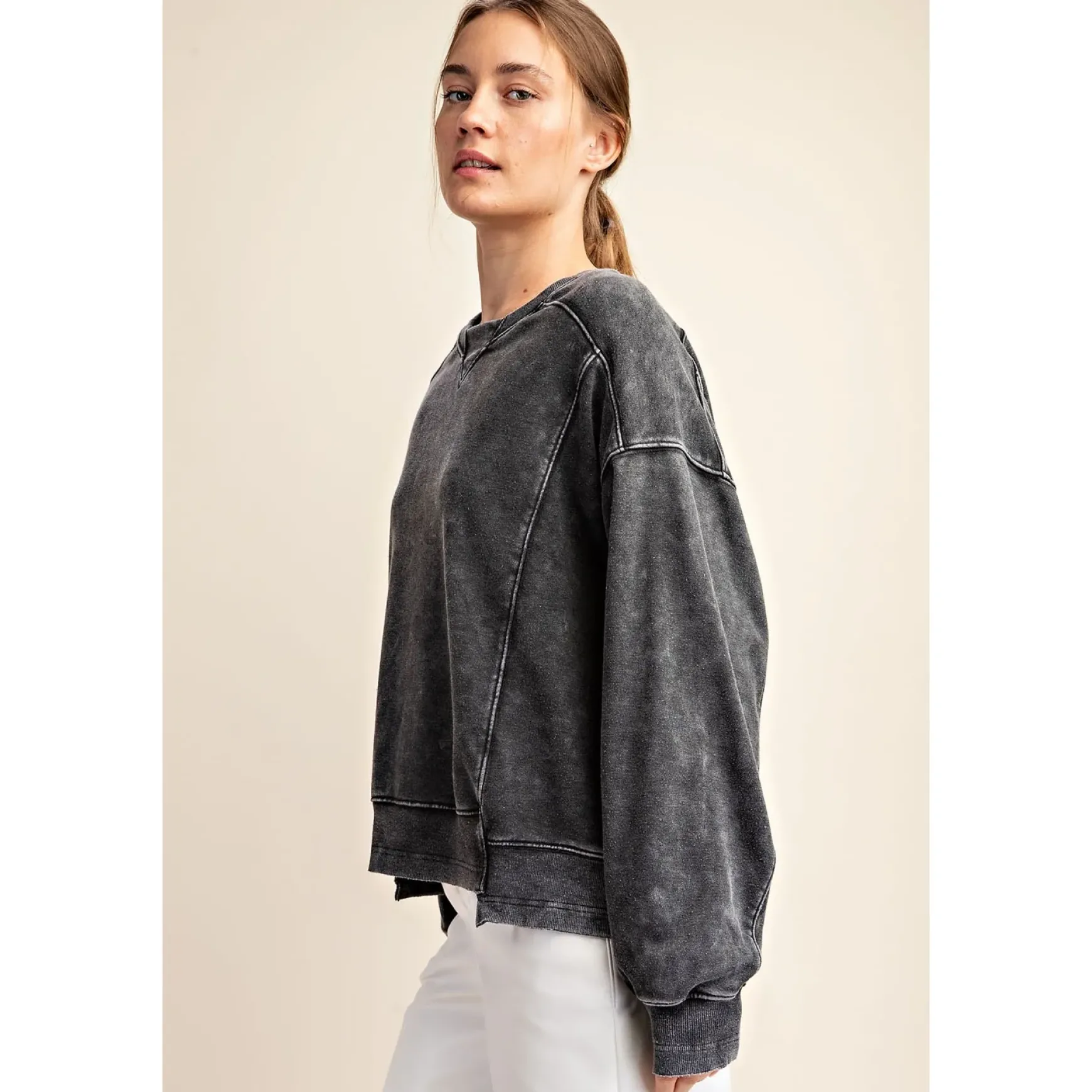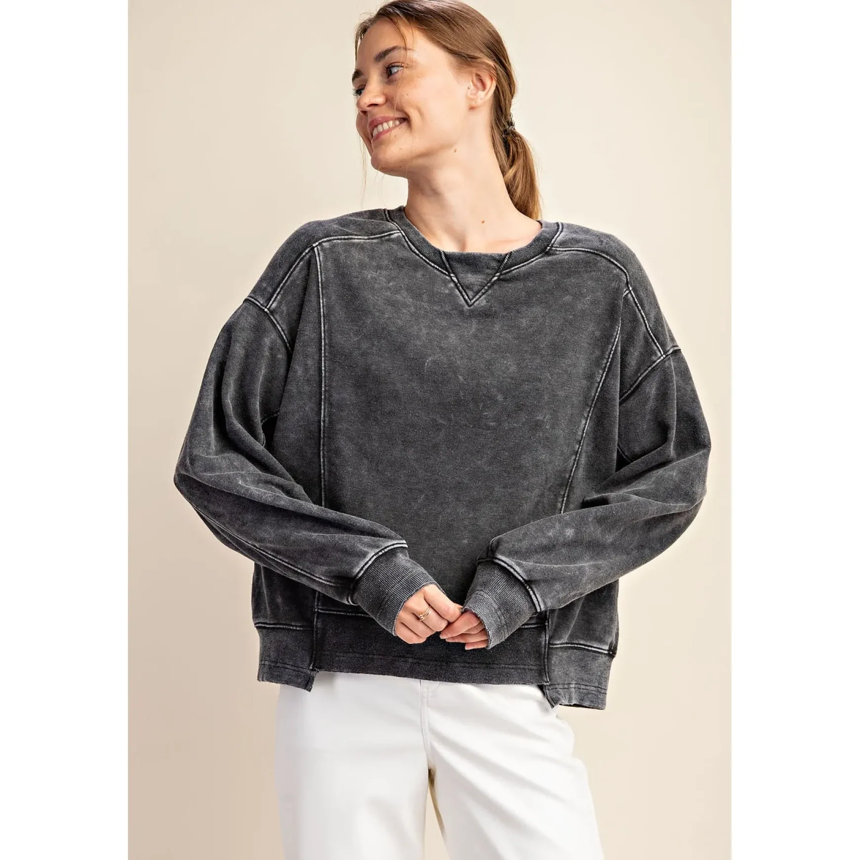 Crafted from mineral-washed French terry fabric, this pullover offers the perfect blend of style and comfort. With a relaxed fit, this pullover features a classic crew neckline, long sleeves with dropped shoulders, and seaming details. The raw edge ribbed neckline, cuffs, and hem add a unique touch, making it a versatile wardrobe essential.