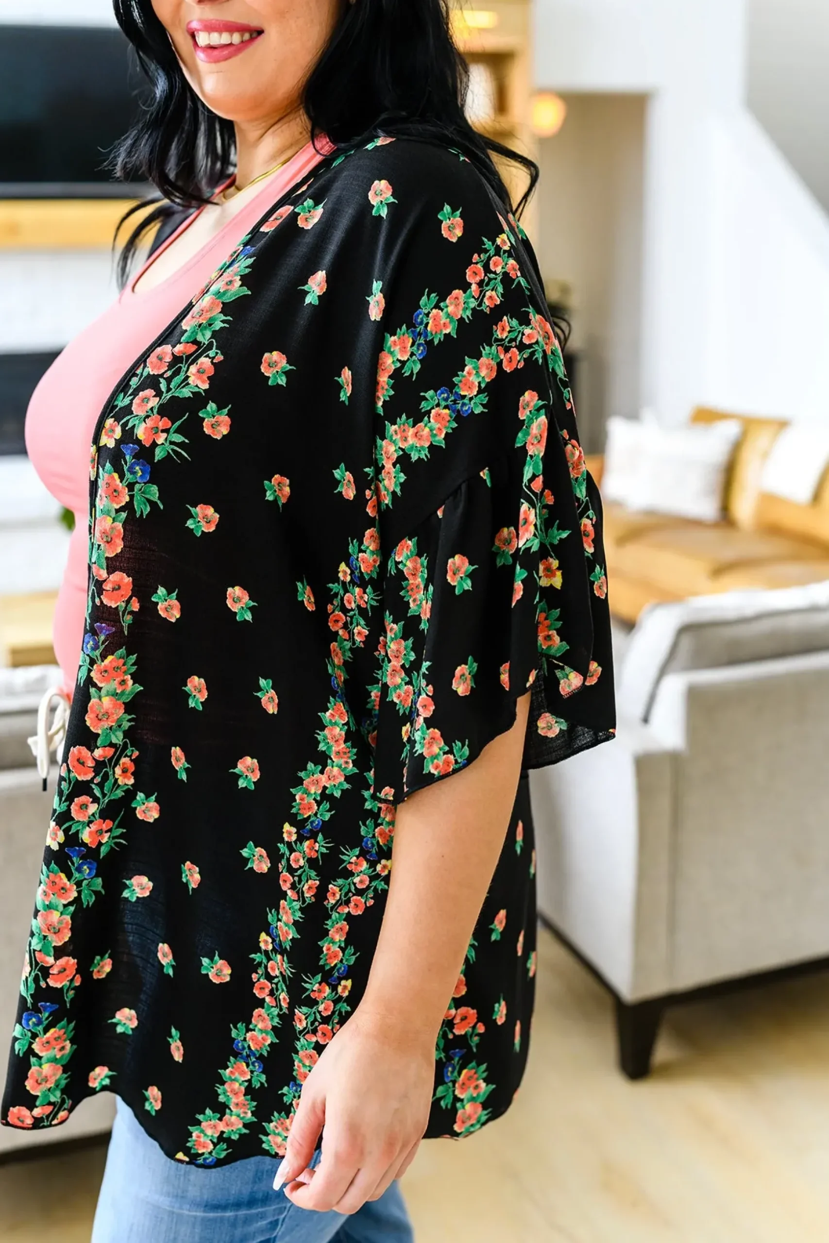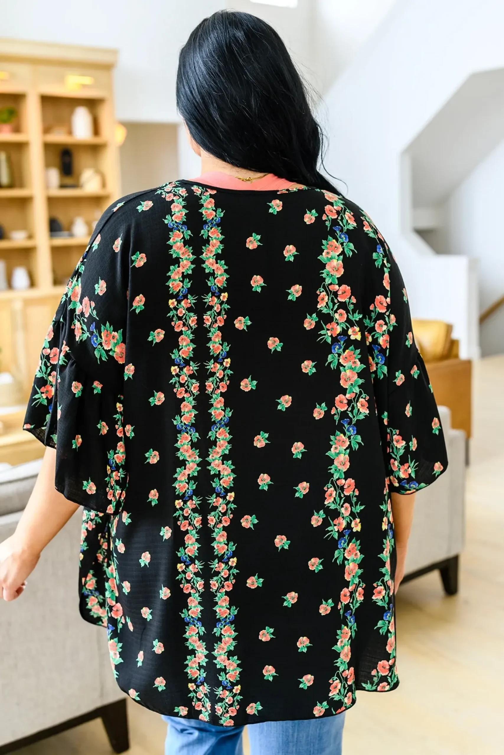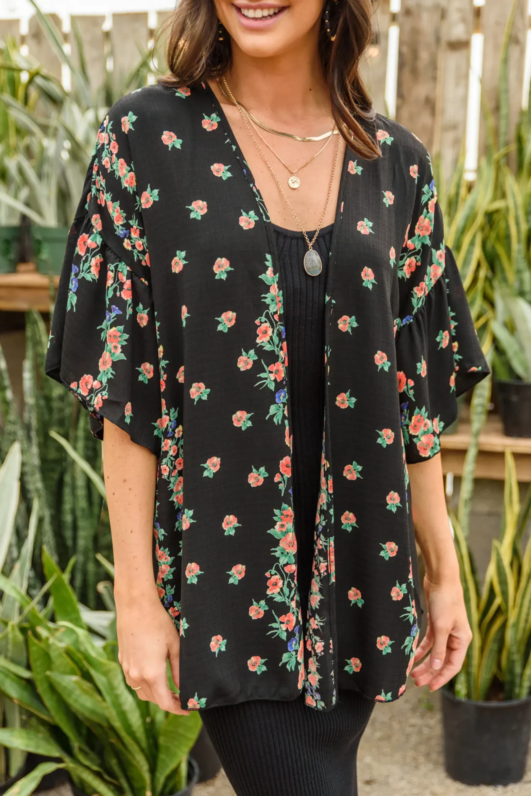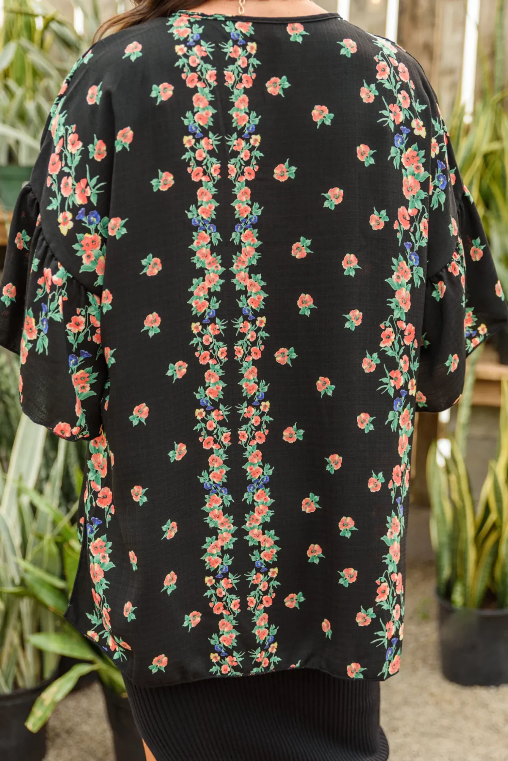 Stay up to date with this season’s current trends with the Moment In Time Kimono! What’s not to love about this piece!? Featuring a pink and blue floral print on sheer black fabric, an open front, dramatic gathered sleeves, and a flowy silhouette. Pair with denim and a tank or throw it over a dress, either way you’re going to look stunning!