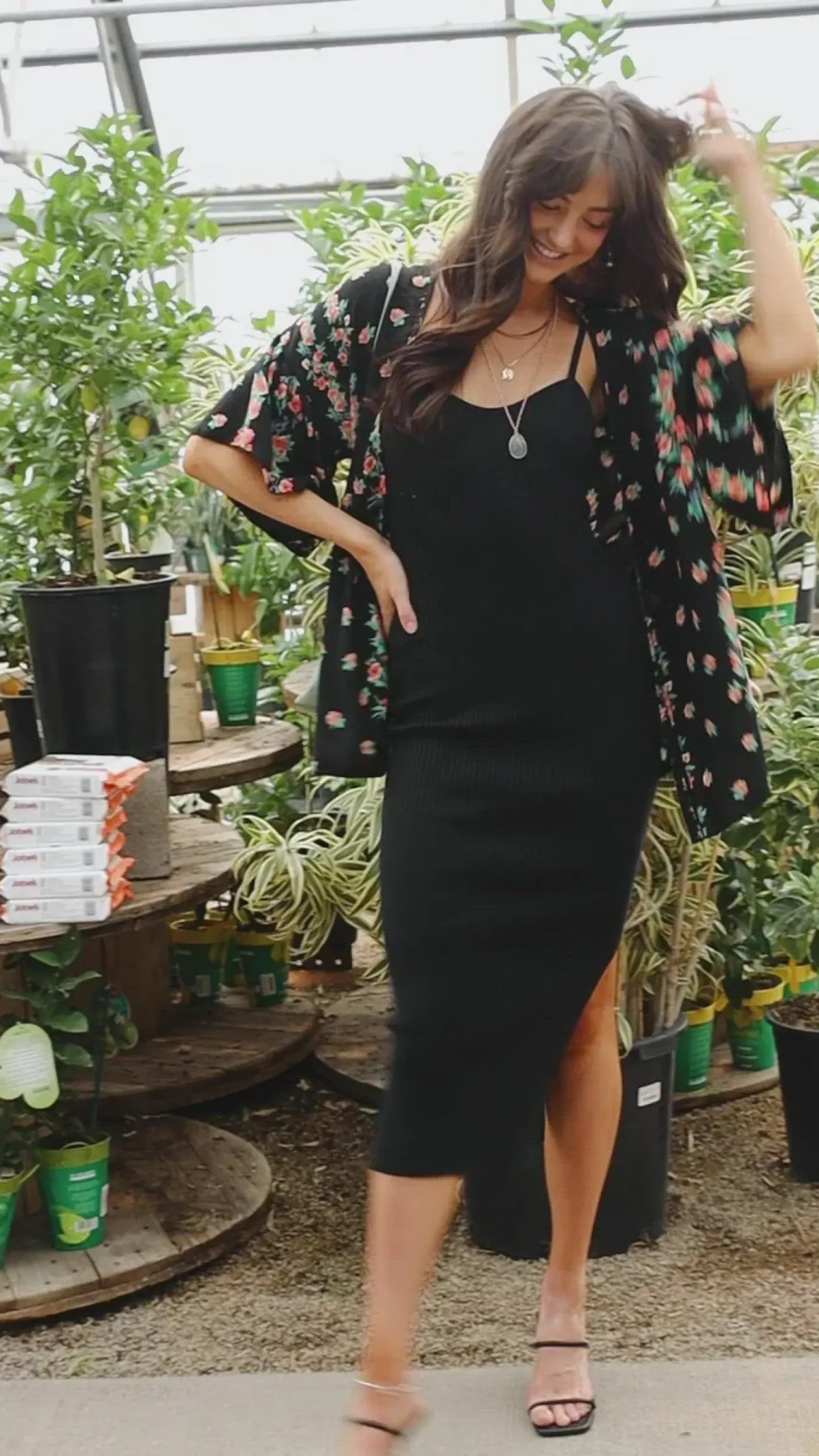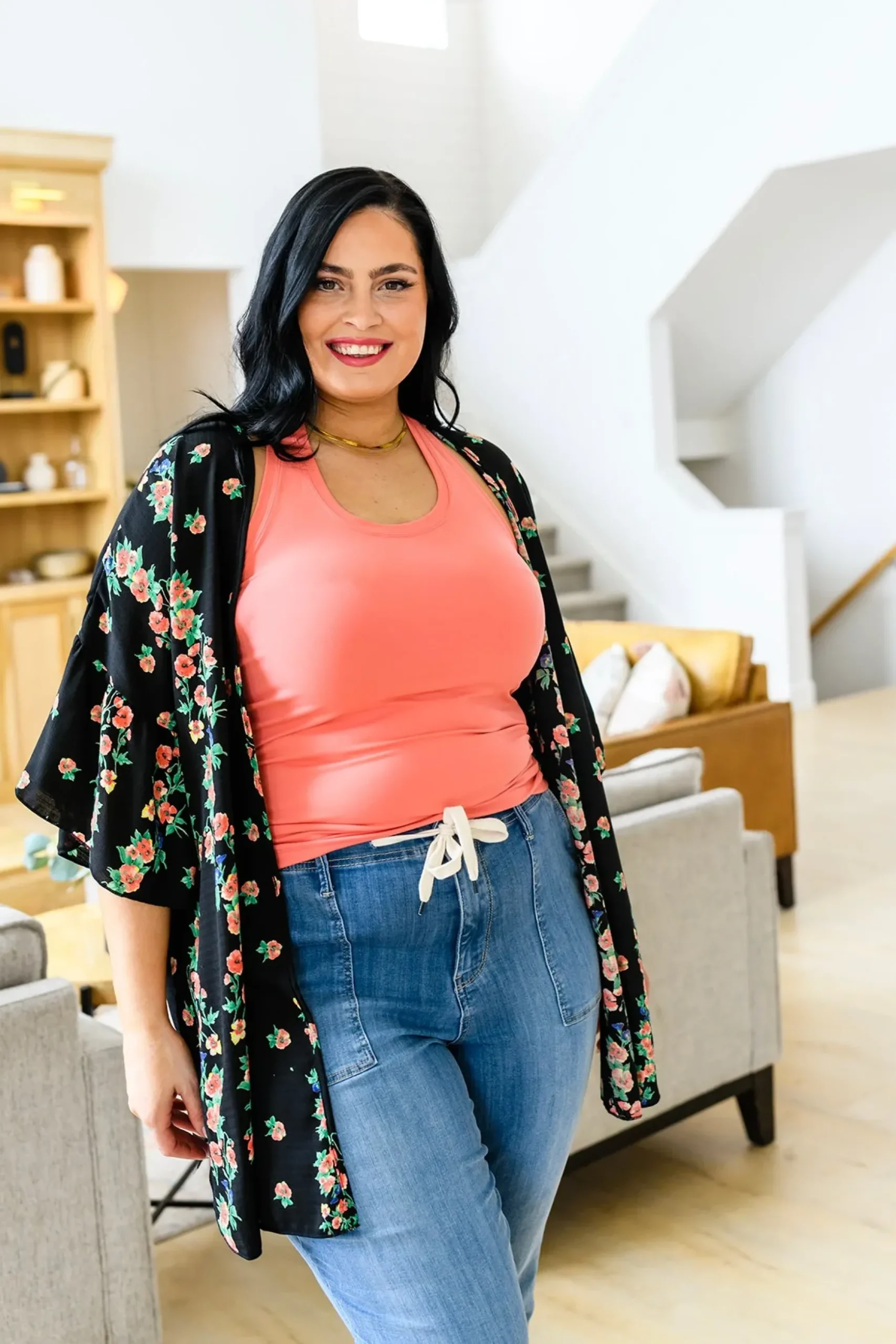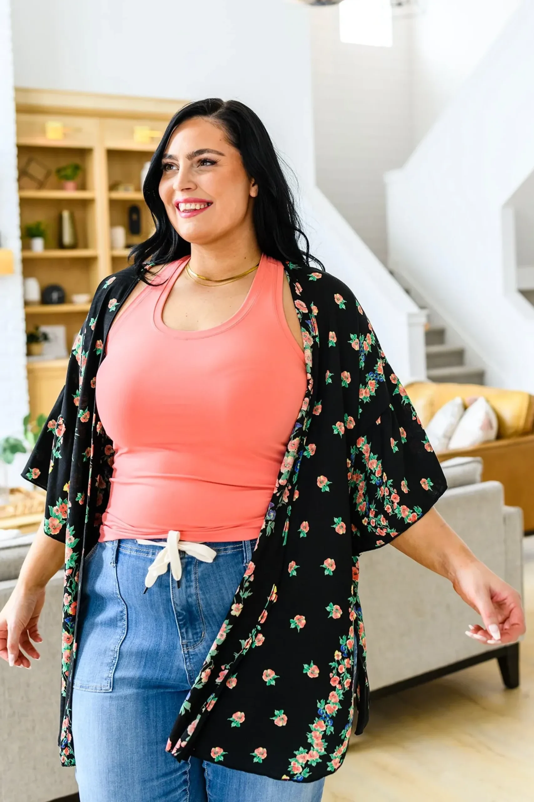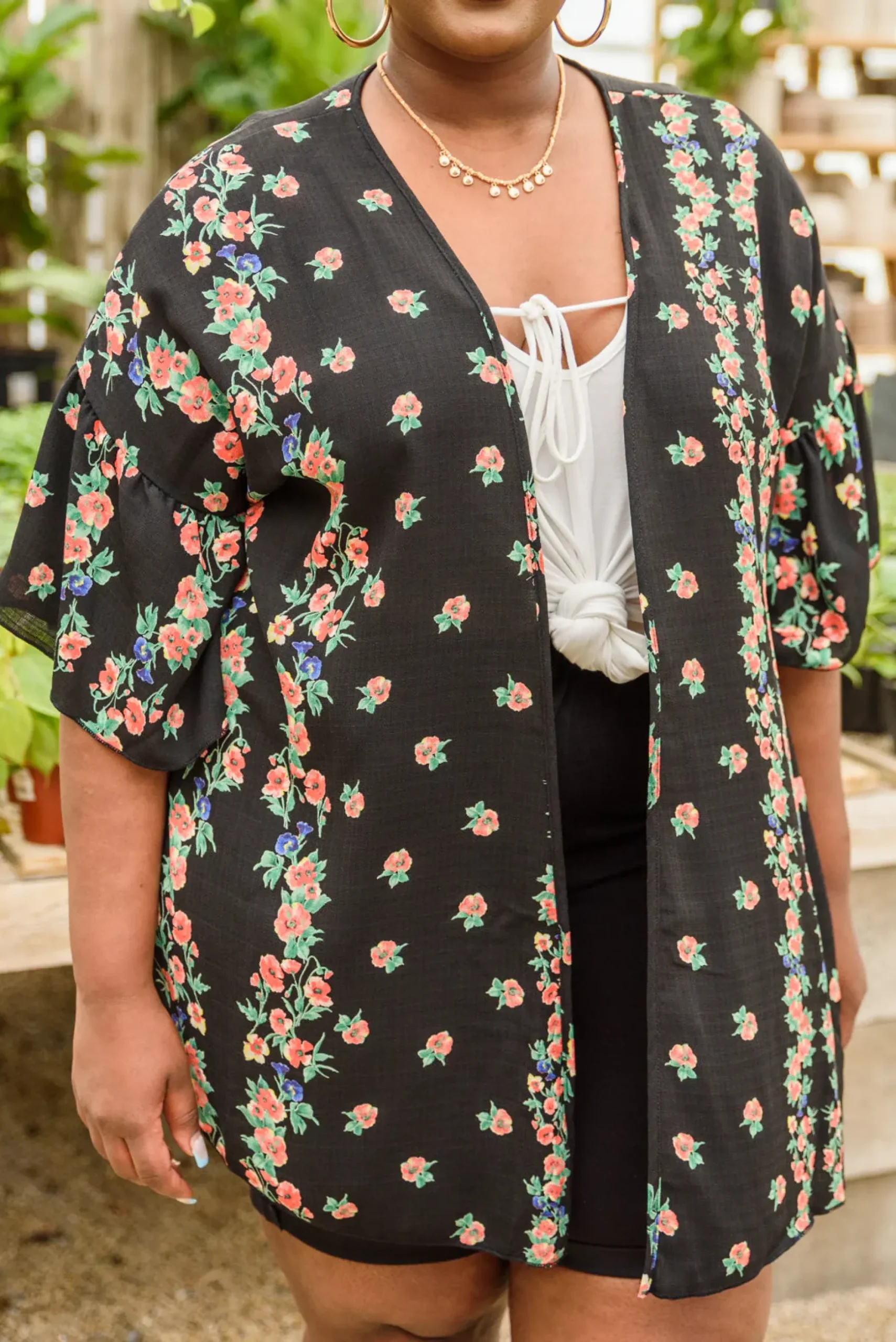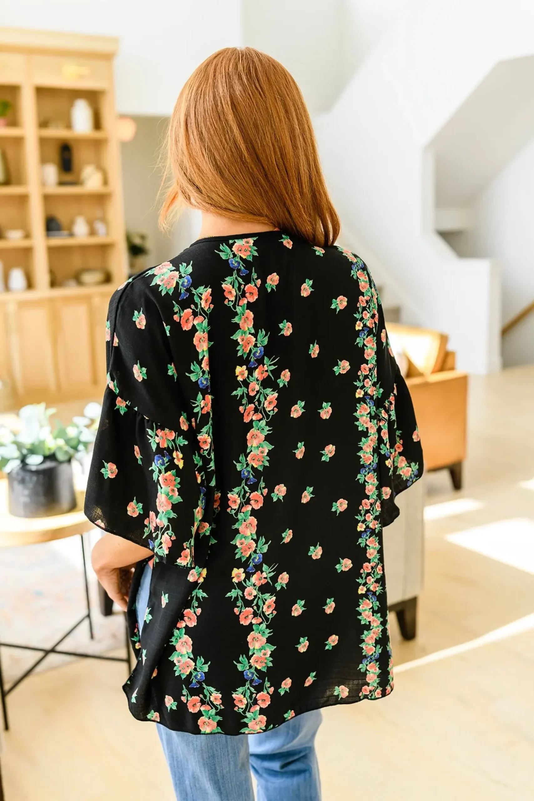 Stay up to date with this season’s current trends with the Moment In Time Kimono! What’s not to love about this piece!? Featuring a pink and blue floral print on sheer black fabric, an open front, dramatic gathered sleeves, and a flowy silhouette. Pair with denim and a tank or throw it over a dress, either way you’re going to look stunning!