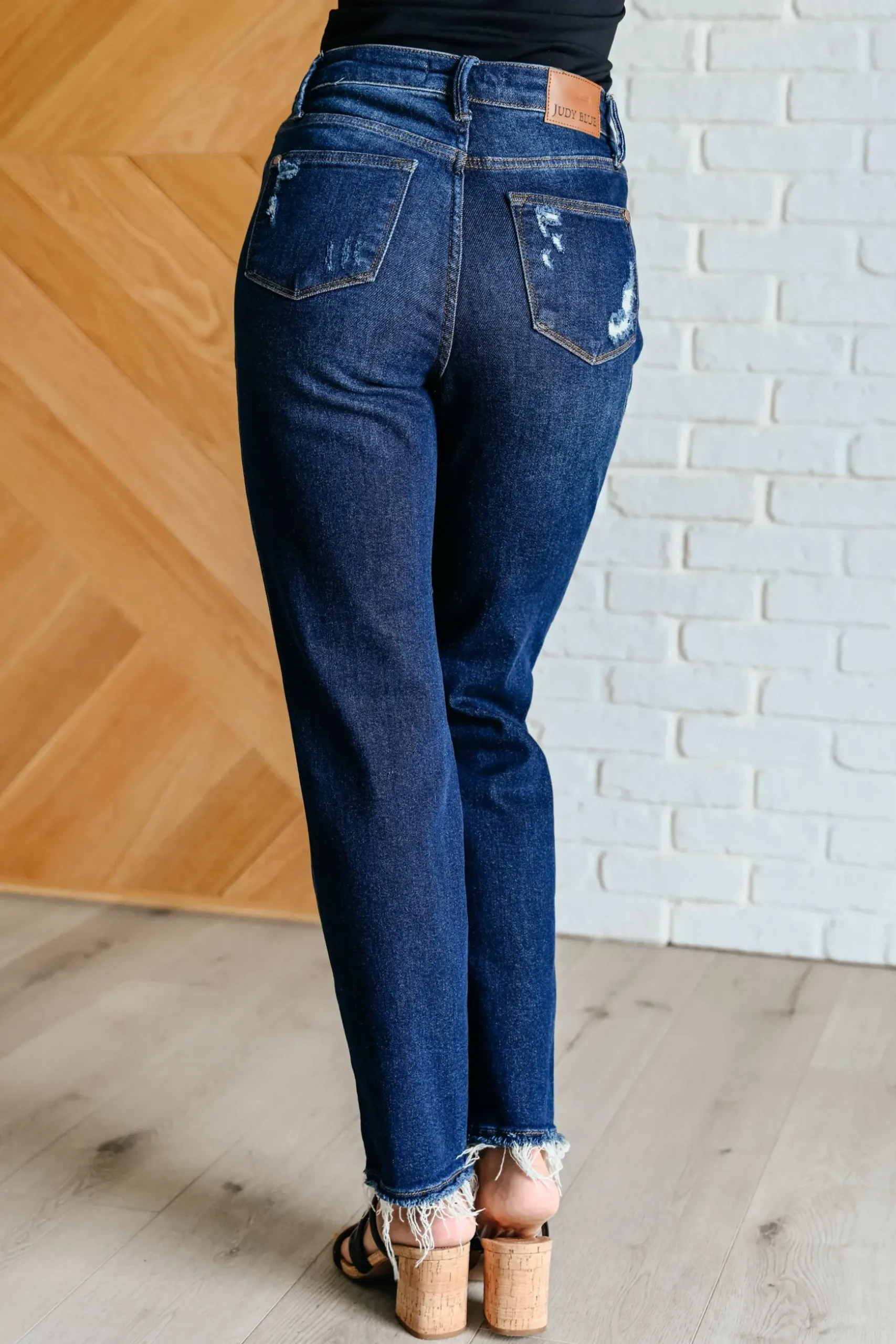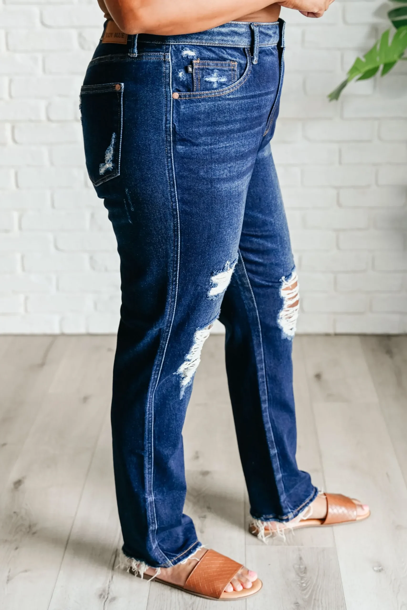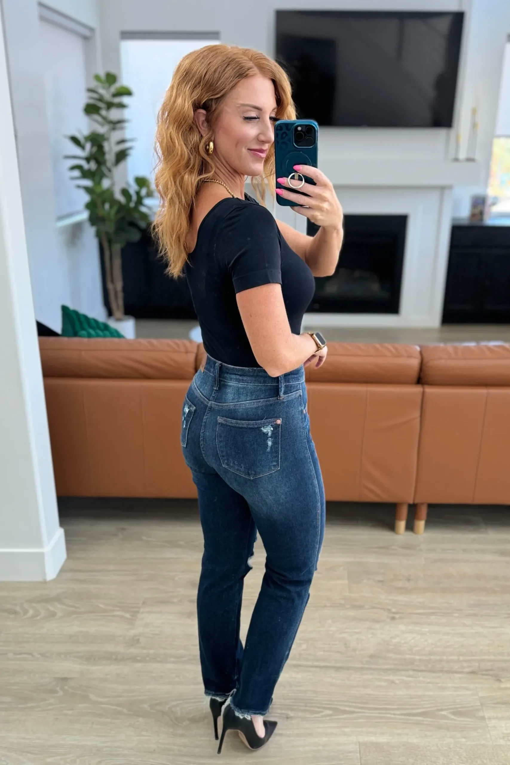 Experience the perfect blend of comfort and style with our Montana High Rise Rigid Magic Distressed Straight Jeans from Judy Blue! The high rise design and rigid magic construction provide a relaxed and flattering fit, while the dark wash and distressed details add a bit of edginess. Complete your look with these effortlessly cool jeans.