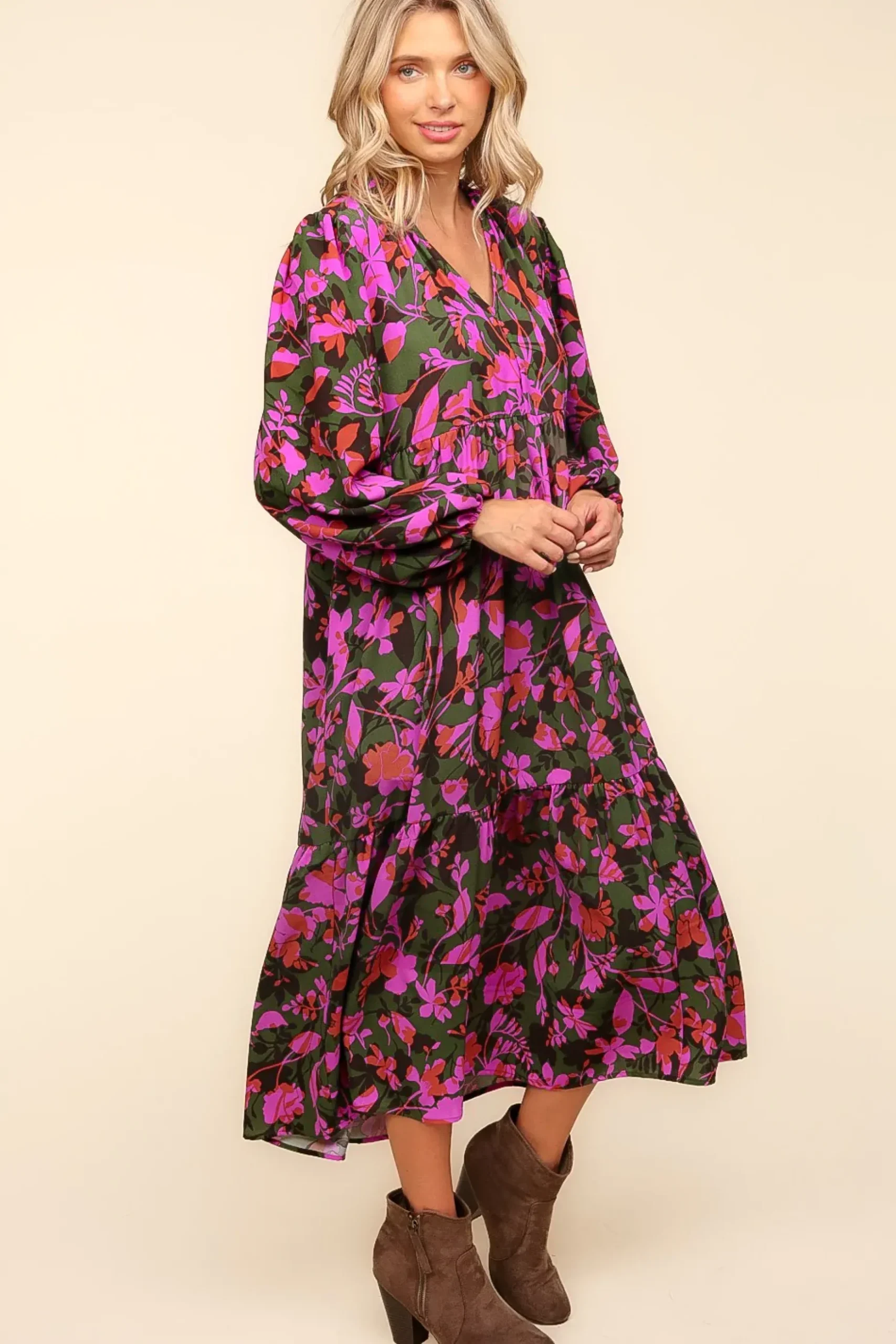 Notch Neck Babydoll Long Sleeve Maxi Dress – Forest/Lavender Floral