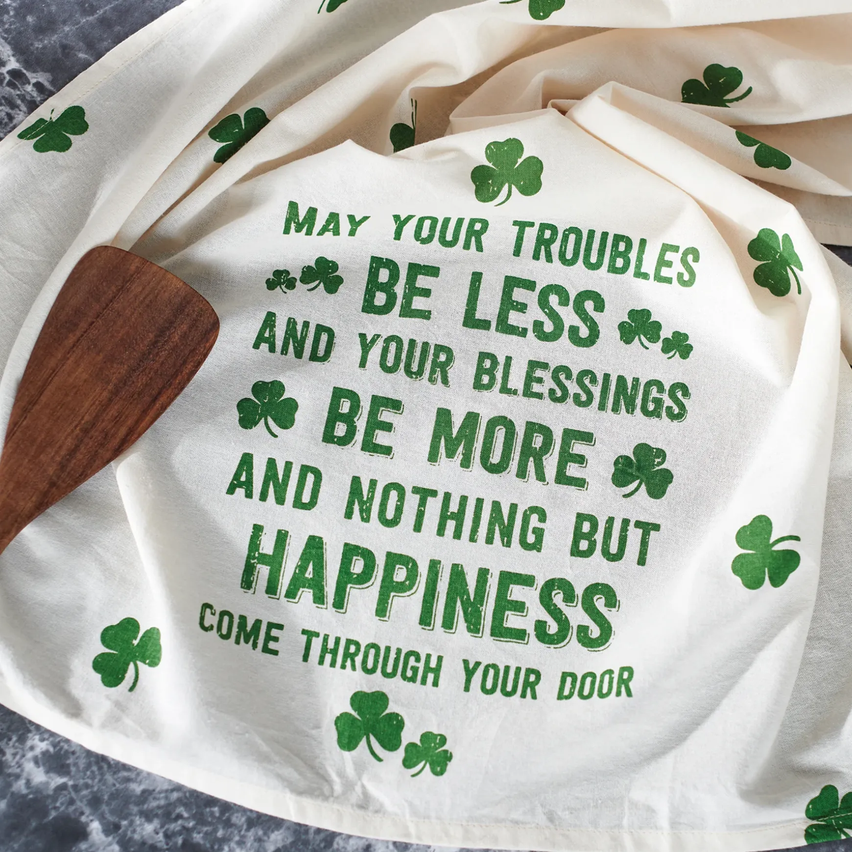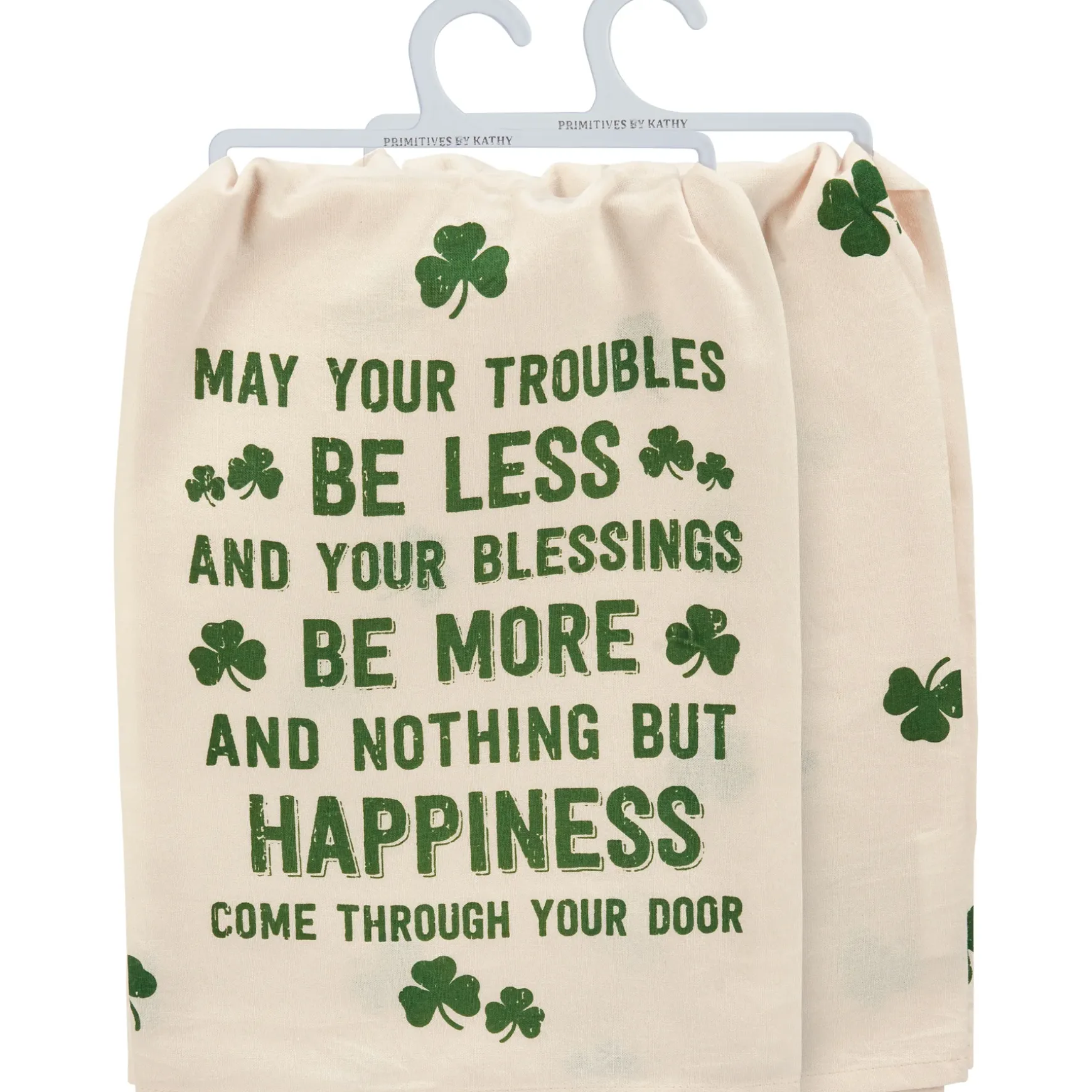 A cream cotton kitchen towel displaying an all-over print of rustic shamrocks and sentiment that reads “May Your Troubles Be Less And Your Blessings Be More And Nothing But Happiness Come Through Your Door.” Our Nothing But Happiness kitchen towel is machine-washable for convenient cleaning.